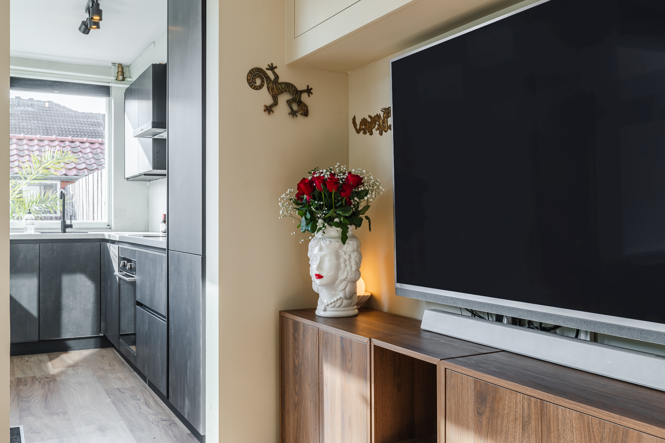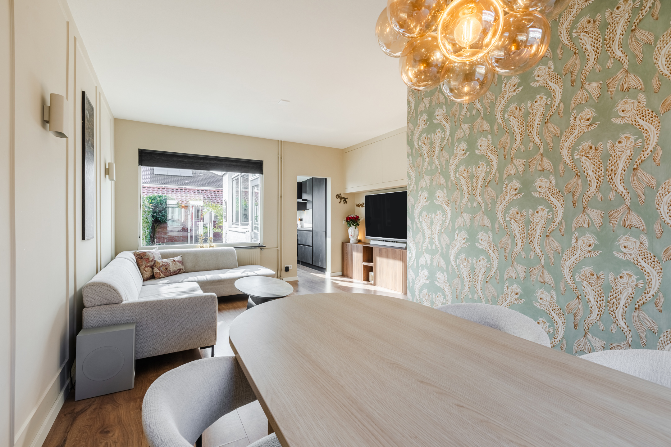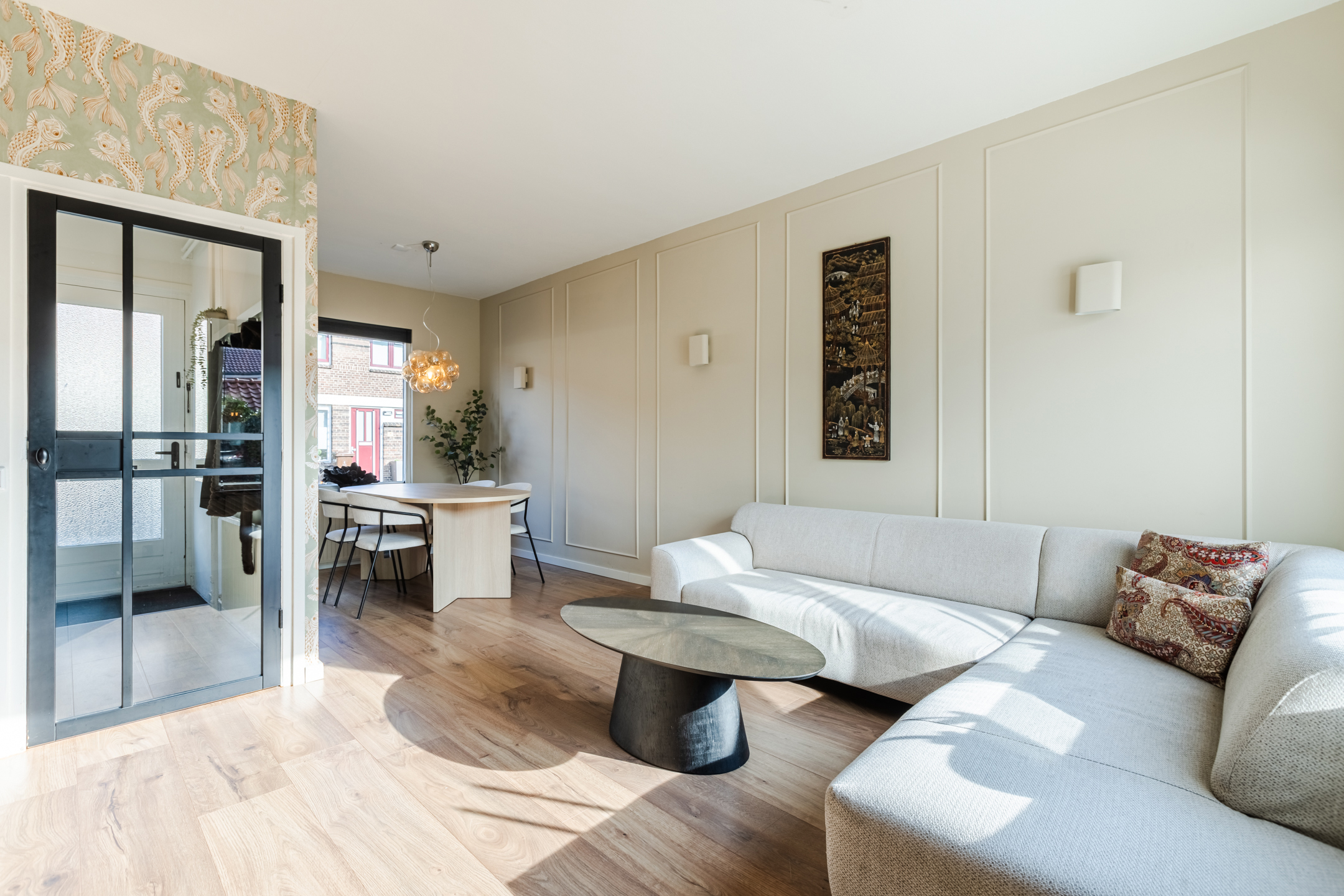 De woonkamer bevindt zich aan de achterzijde van de woning. Dankzij de prettige indeling en de directe verbinding met de tuin is dit een fijne leefruimte met een warme en huiselijke sfeer. De strakke wand- en plafondafwerking in combinatie met de sfeervolle laminaatvloer zorgt voor een verzorgde en instapklare uitstraling.