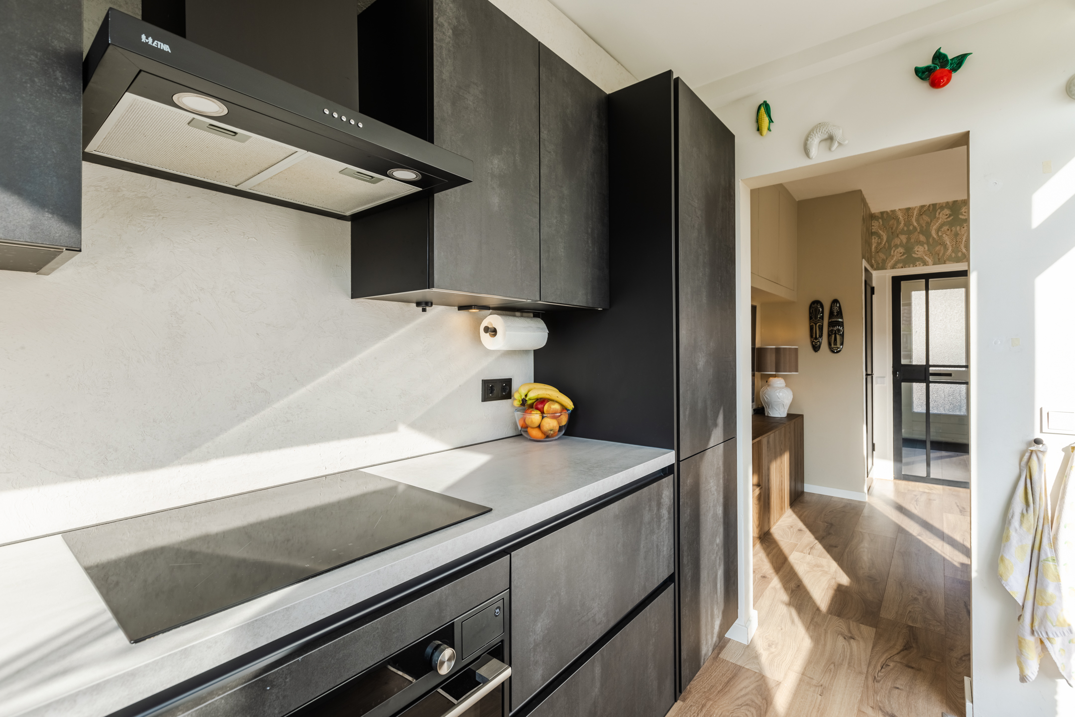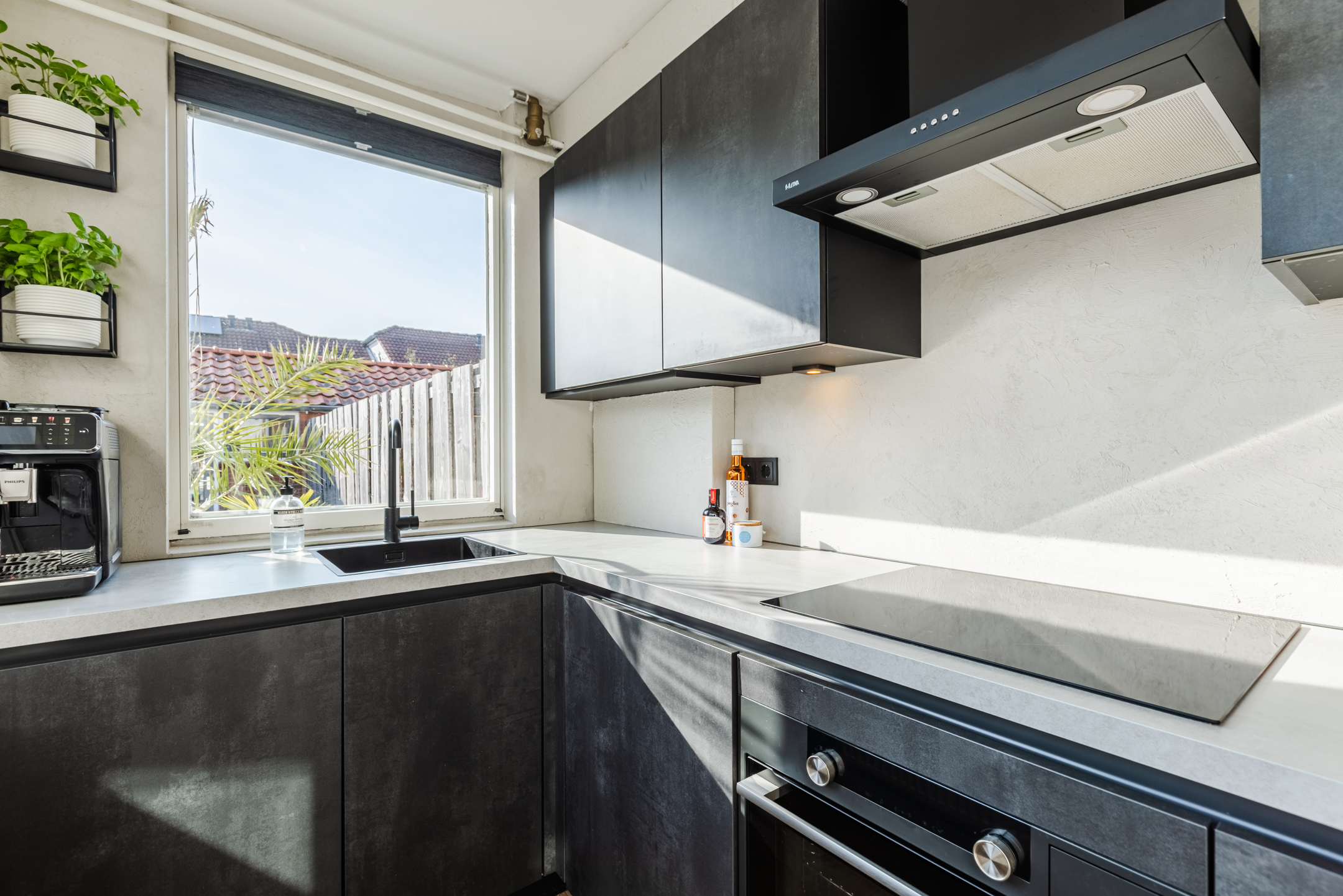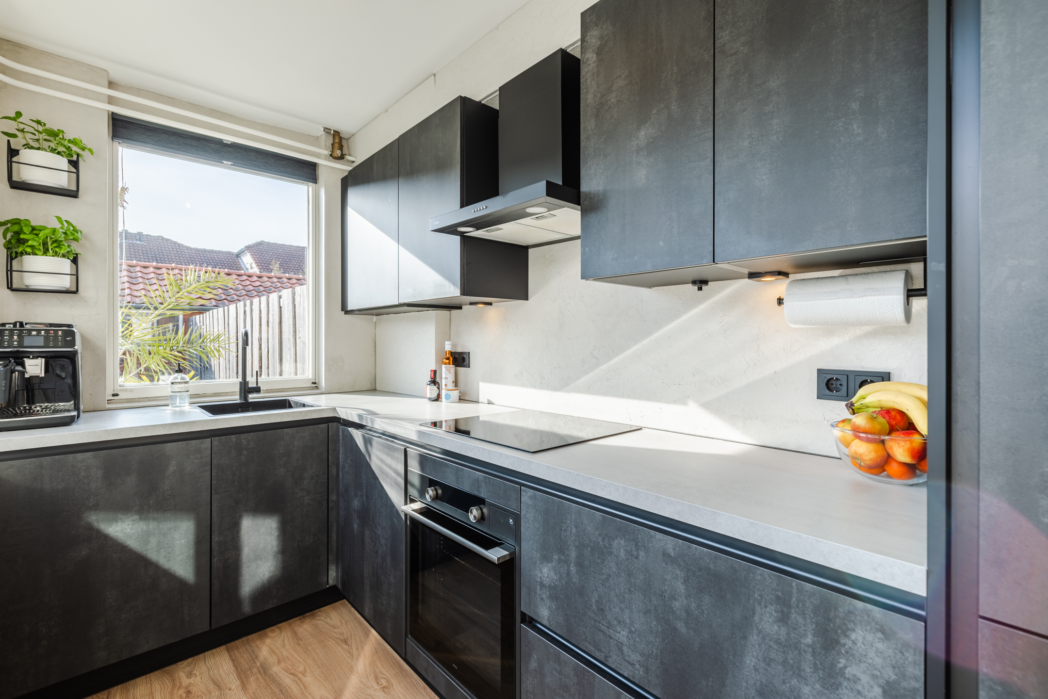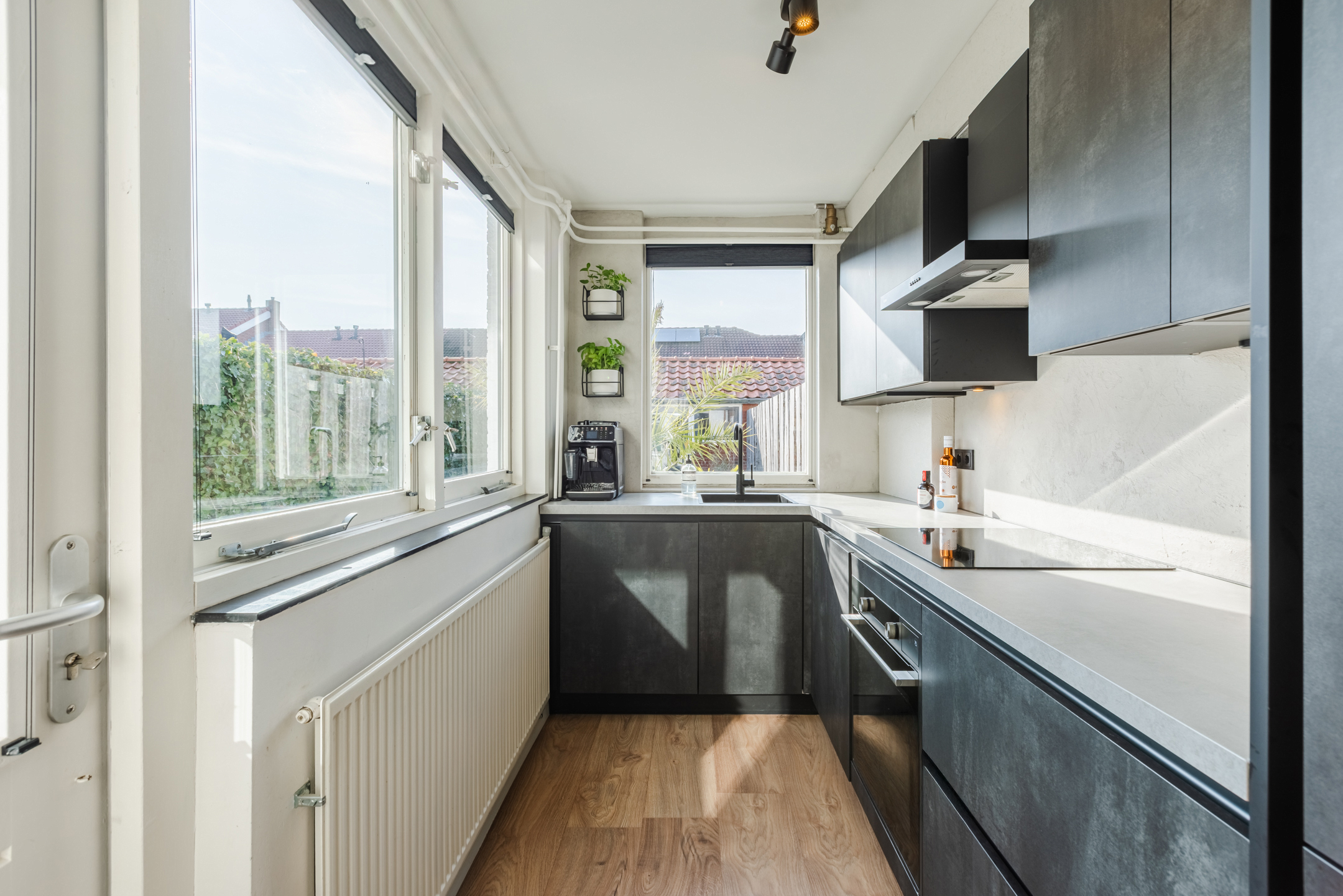 De halfopen keuken bevindt zich aan de achterzijde van de woning, is geplaatst in een hoekopstelling en uitgevoerd in moderne donkergrijze fronten met een lichtgrijs kunststof werkblad. De keuken beschikt over alle wenselijke inbouwapparatuur, te weten: een inductiekookplaat, een koel-/vriescombinatie, een vaatwasser, een afzuigkap en een combi- stoomoven.