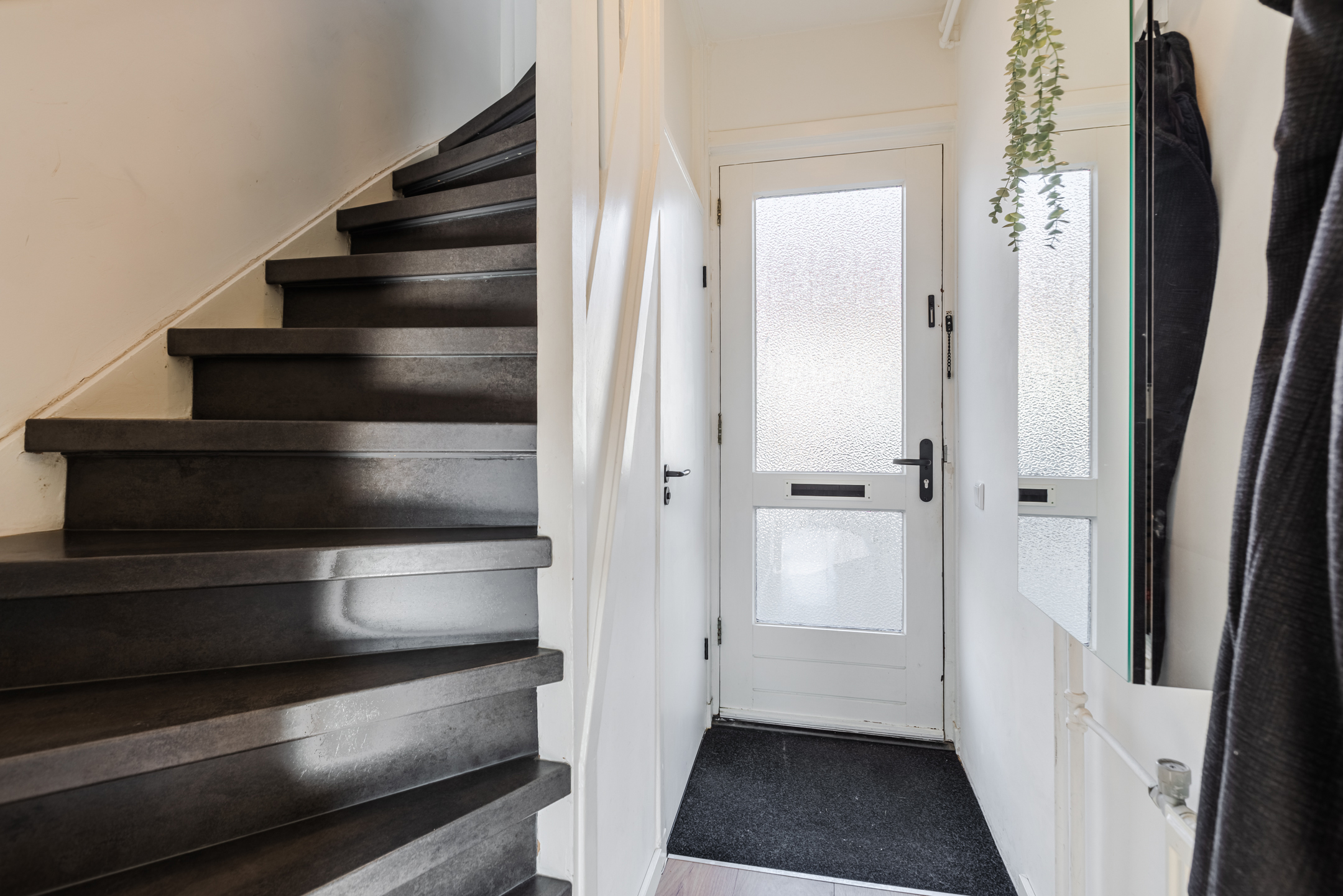 Entree, hal, garderobe, toiletruimte met hangend toilet en fontein. Vanuit de hal is er toegang tot de woonkamer en de trapopgang naar de eerste verdieping.
