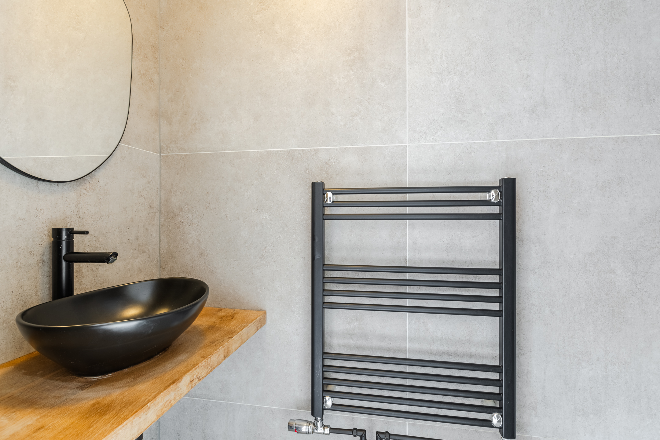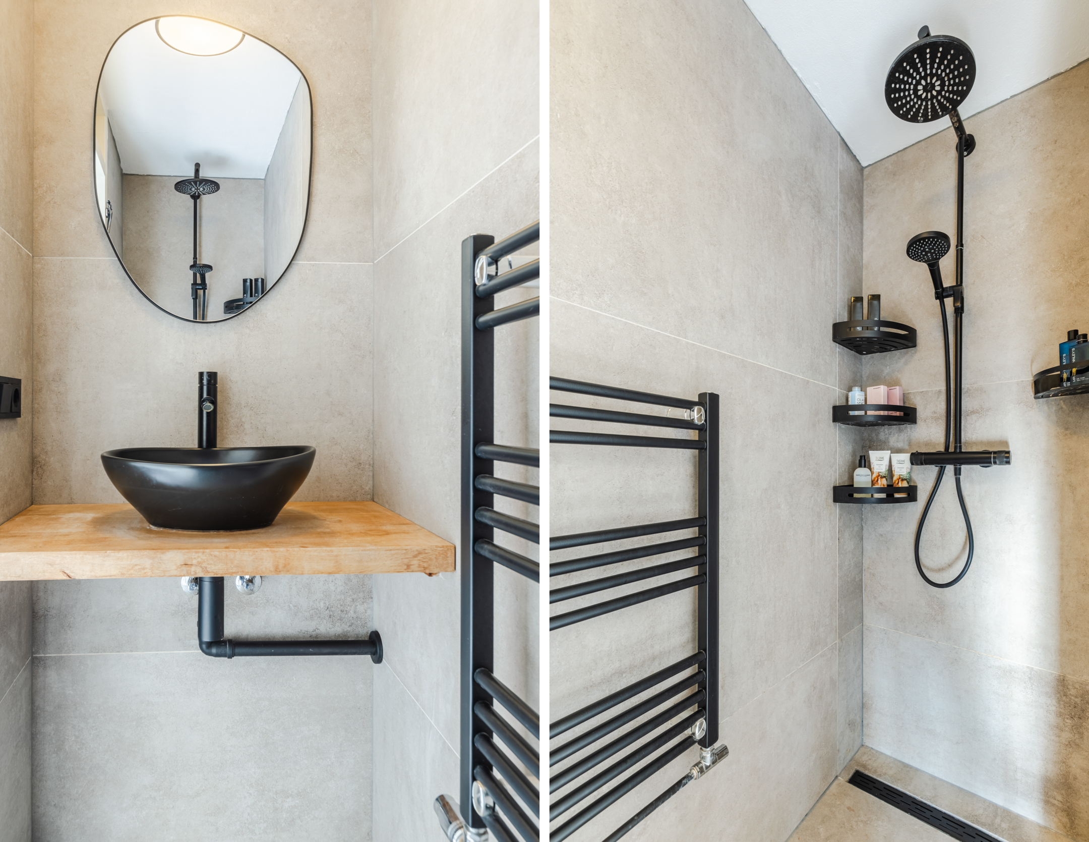 De moderne badkamer en-suite is uitgevoerd in een strakke, moderne stijl met lichte ecru wand- en vloertegels en mooie zwarte accenten. De badkamer beschikt over een inloopdouche, een wastafel met houtlook blad en een zwarte design handdoekradiator.