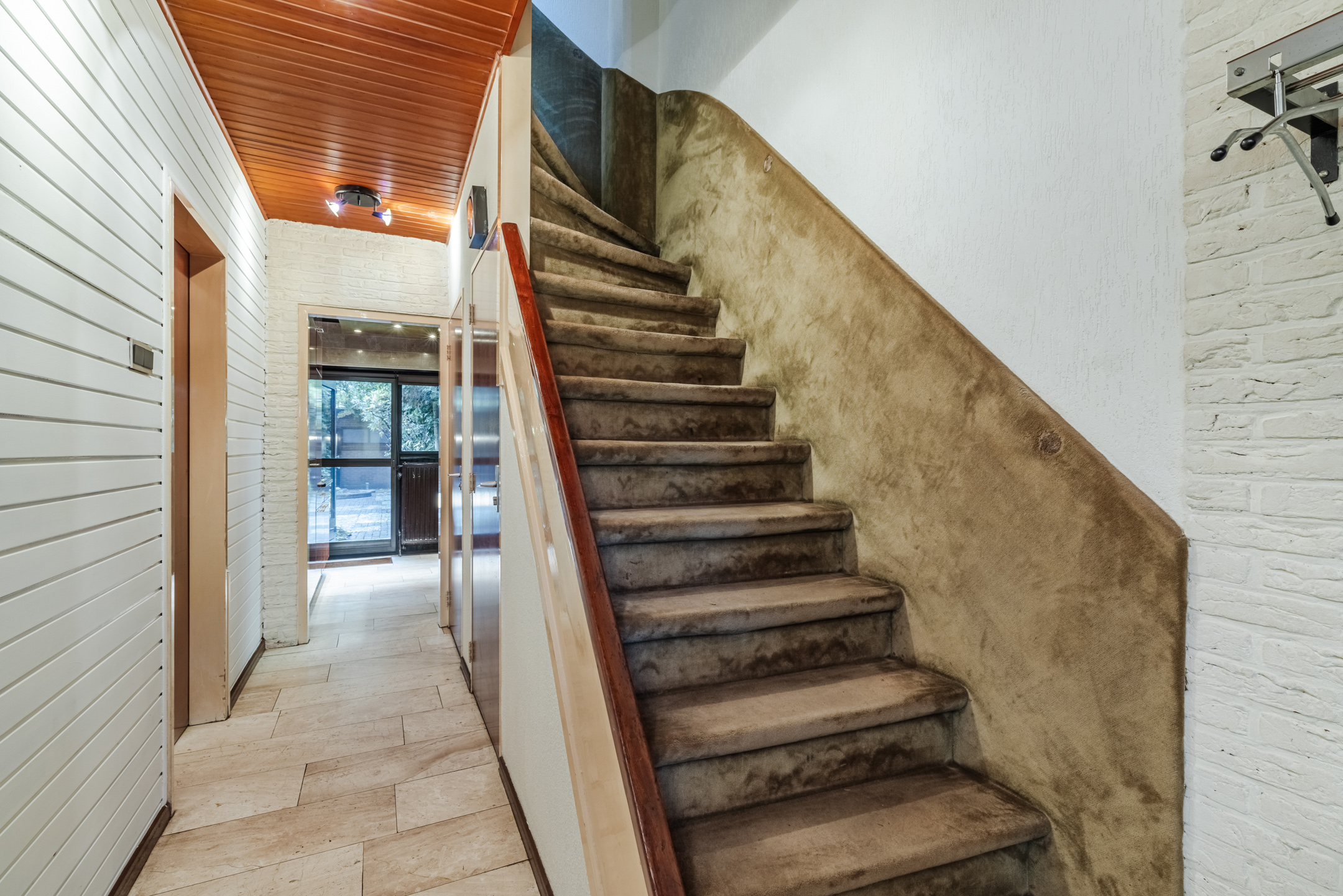 De gehele verdieping is voorzien van vloerbedekking, granol gestucte muren en houten latten op het plafond.