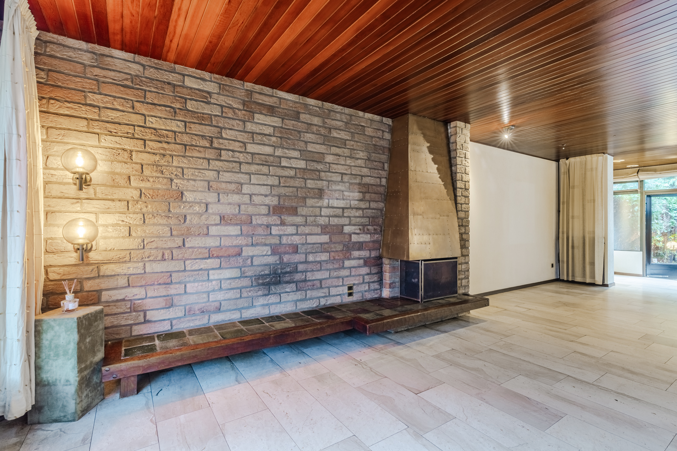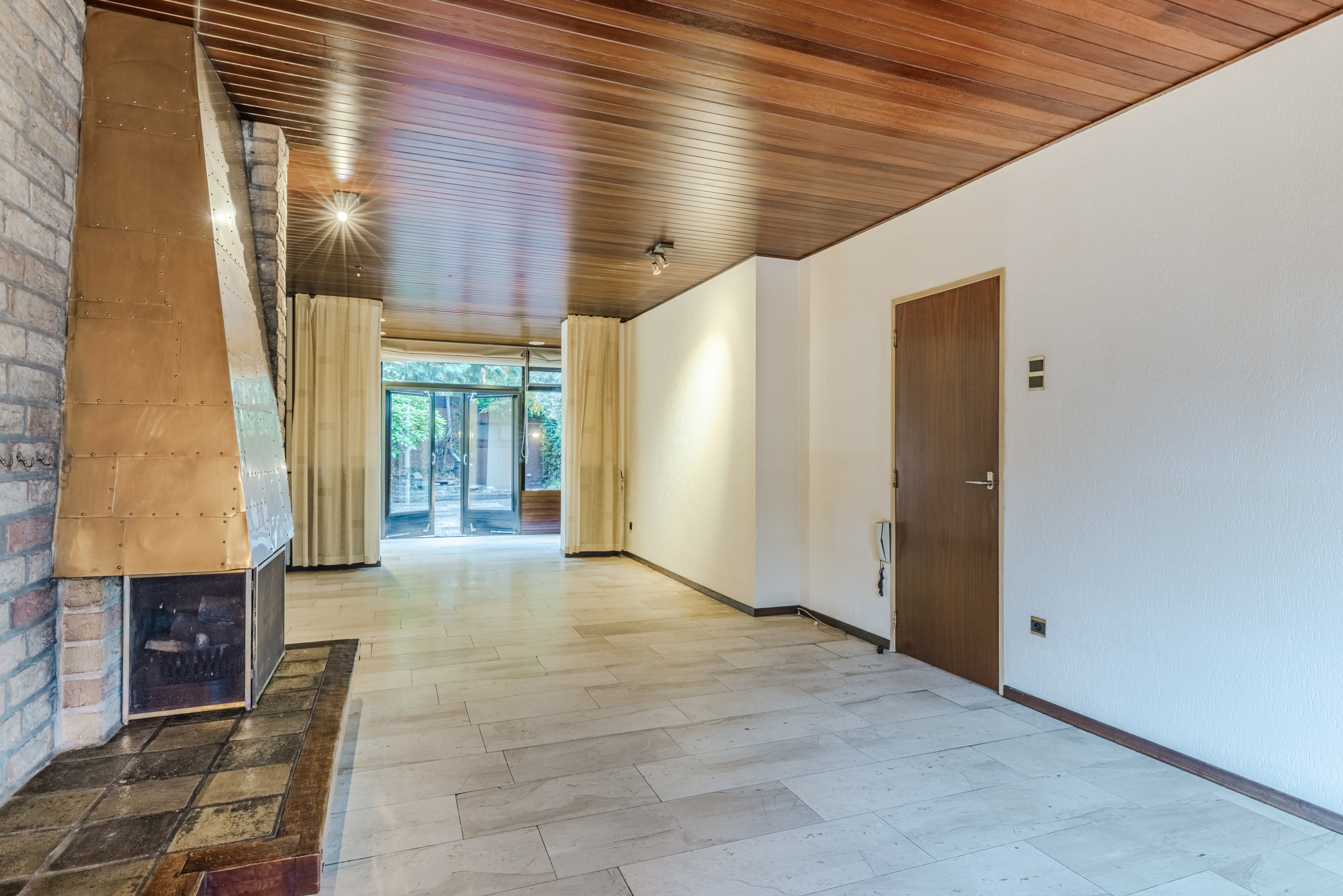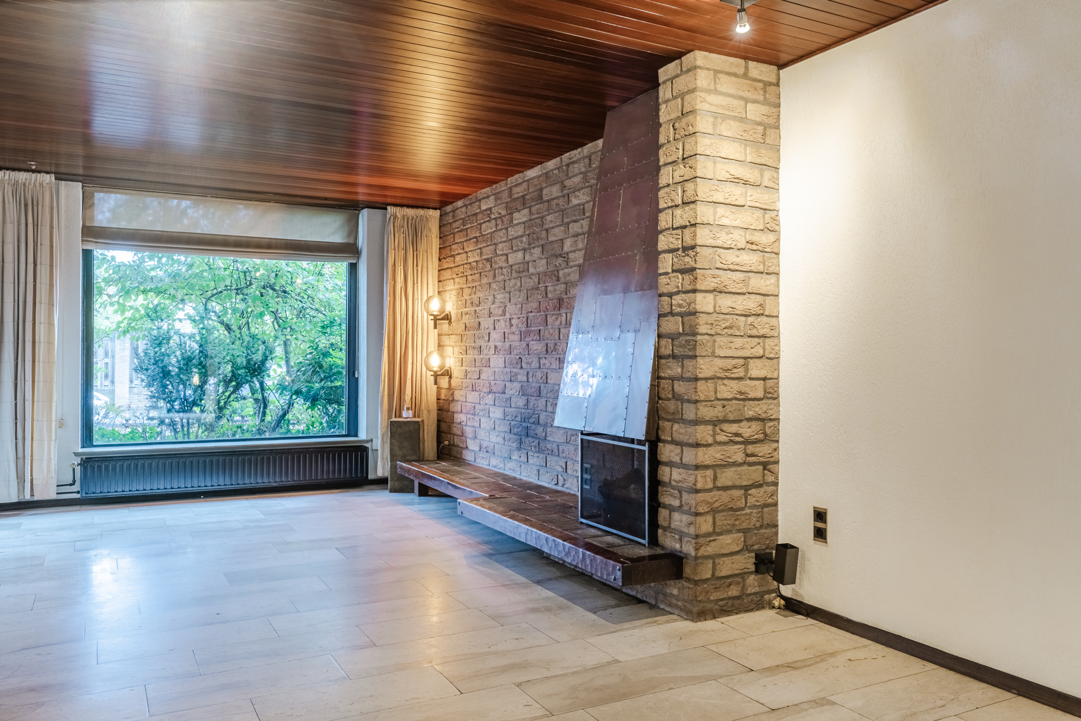 De ruime, uitgebouwde woonkamer strekt zich uit over de hele lengte van de woning en is voorzien van een sfeervolle open haard met een koperen kap.