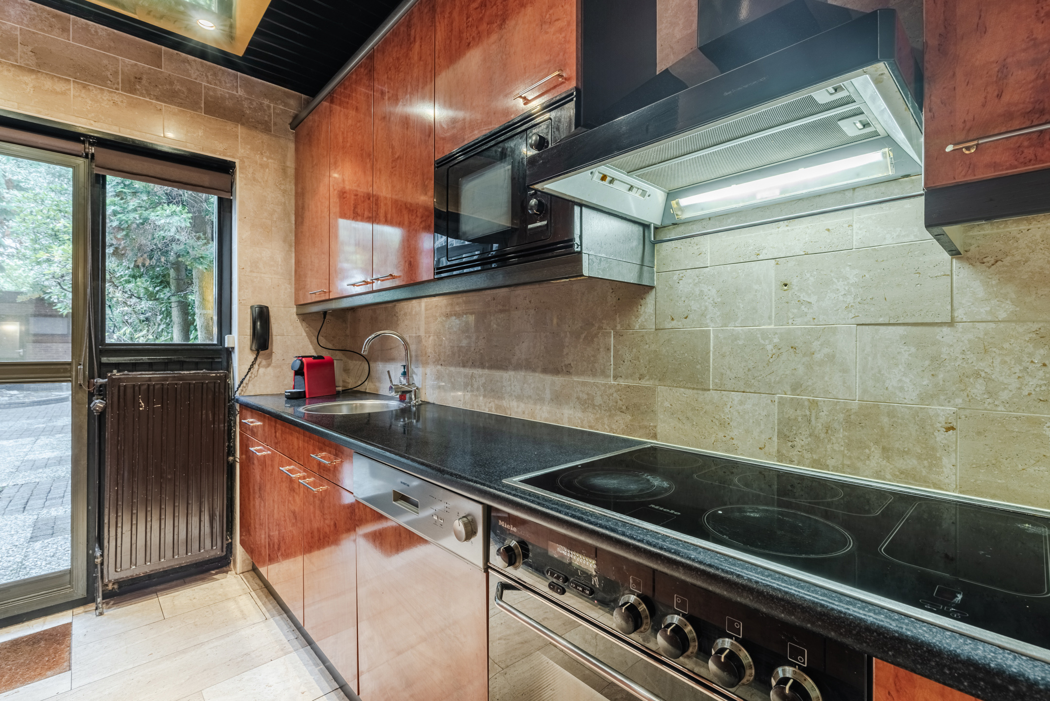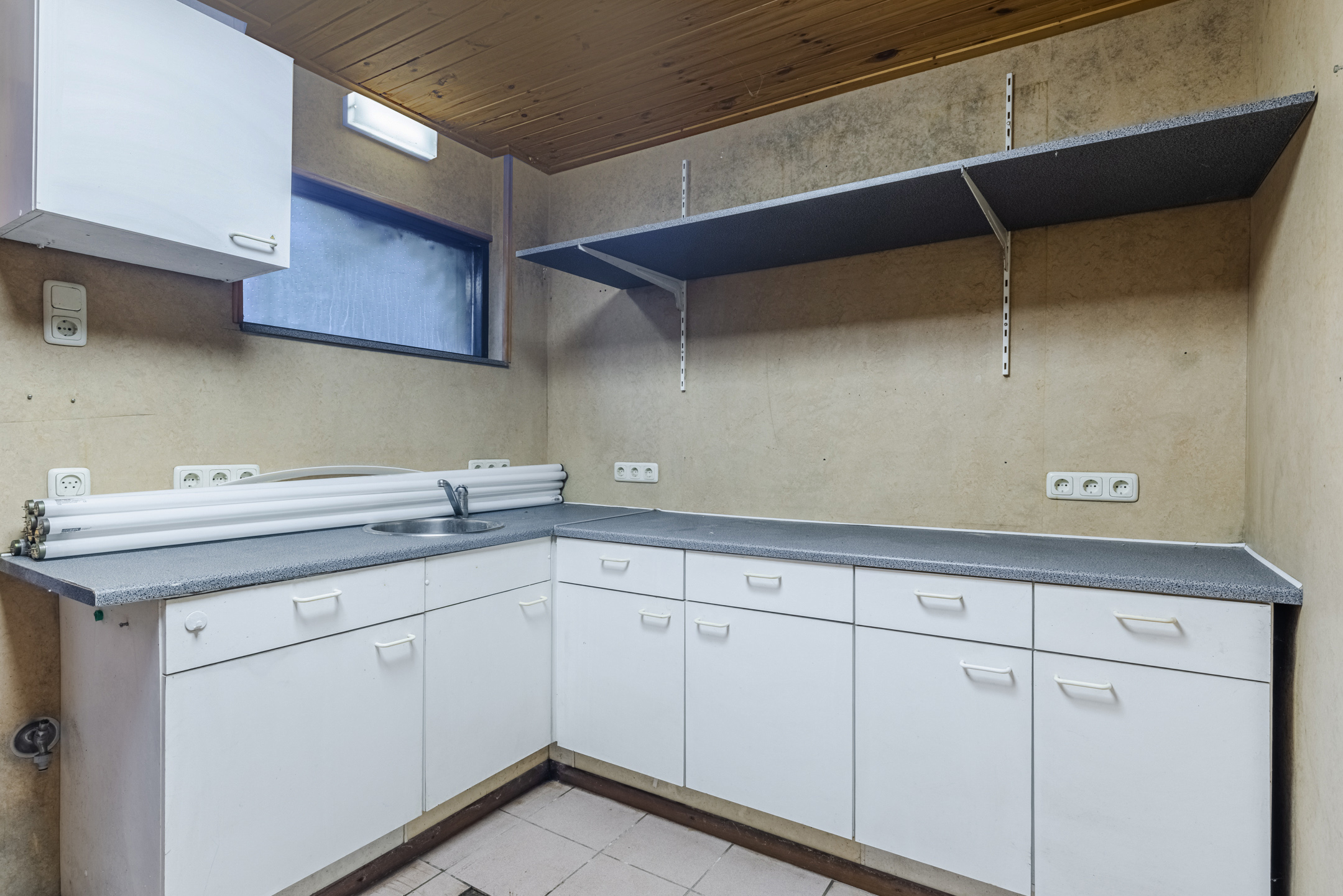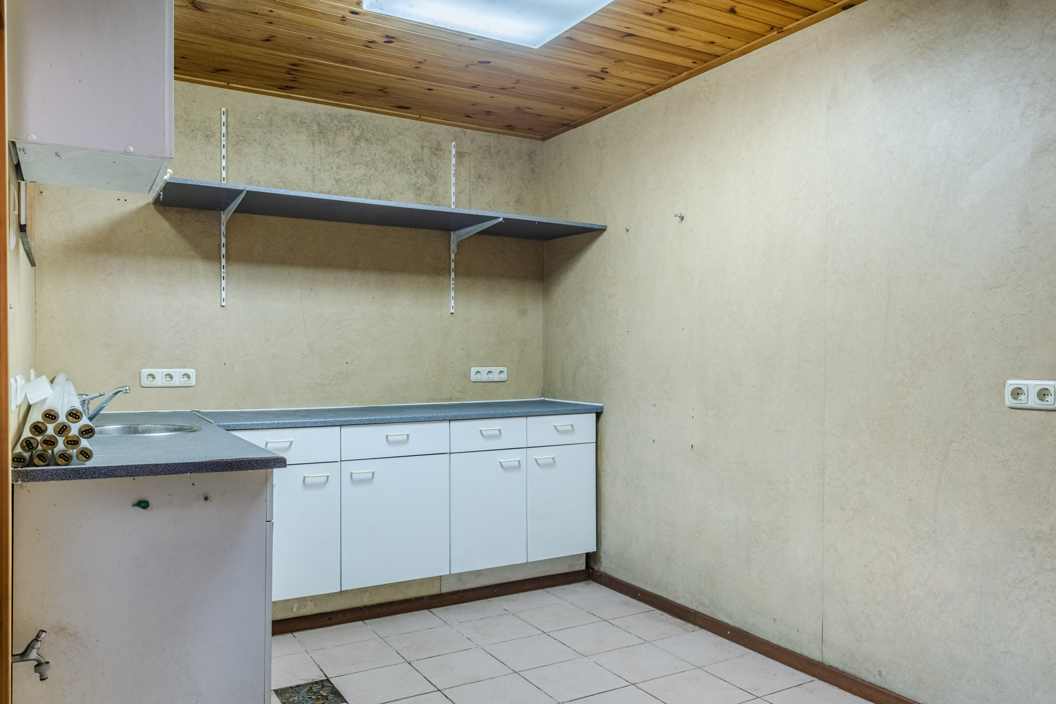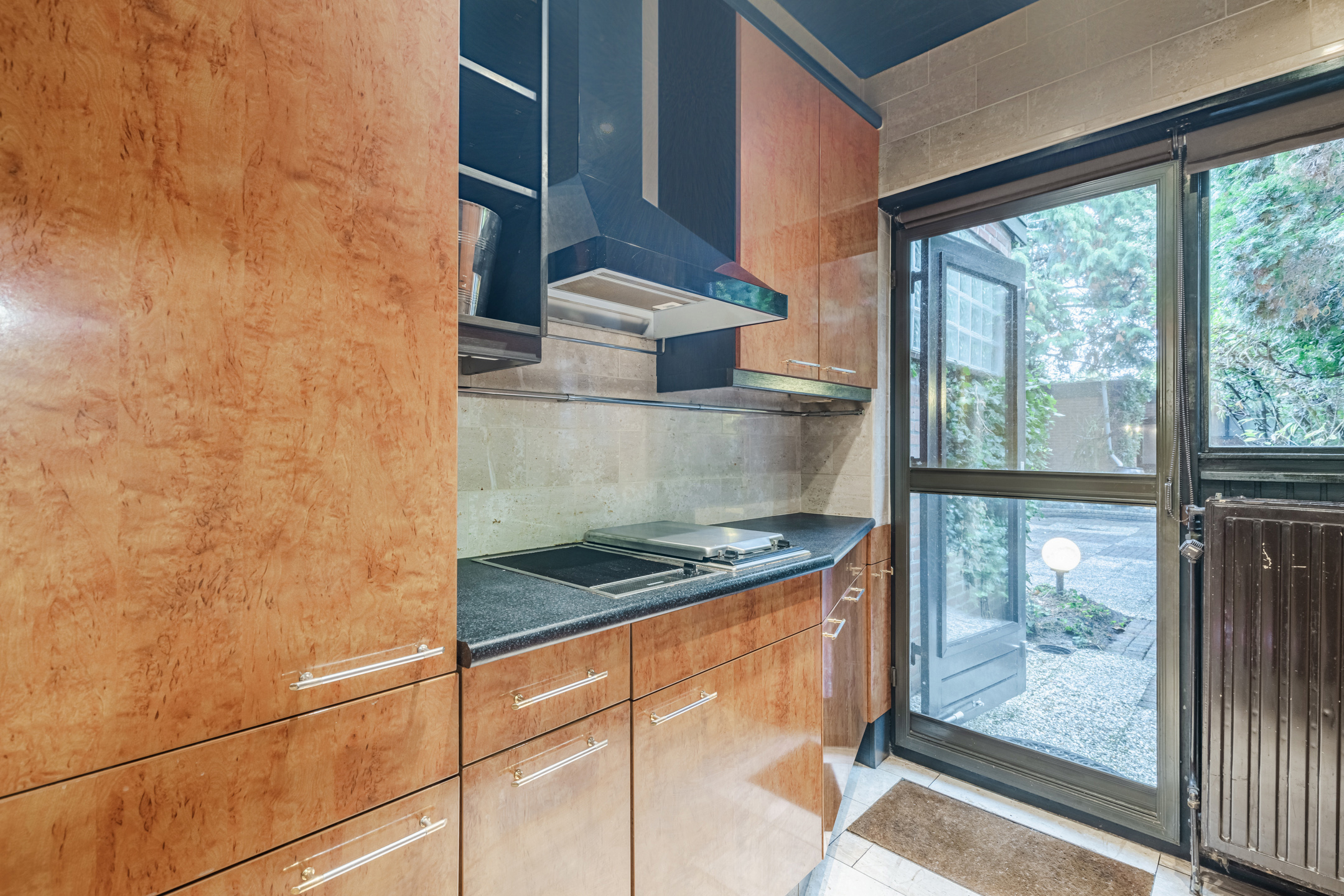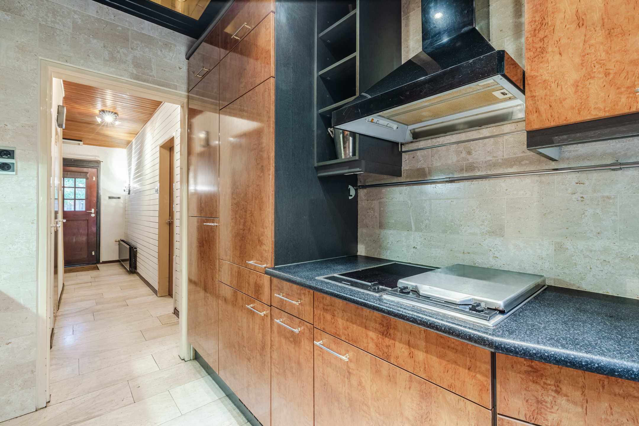 De keuken is uitgevoerd in een rechte opstelling, met werk- en opbergruimte aan beide zijden. De linkerkant is v.v. een koel-vriescombinatie (merk: Siemens), een grilplaat, een ingebouwde friteuse en een afzuigkap. Aan de andere kant bevindt zich een 5-pits keramische kookplaat, een afzuigkap, een vaatwasser (merk: Inventum) en een oven. Via een openslaande deur is er toegang tot de achtertuin.
