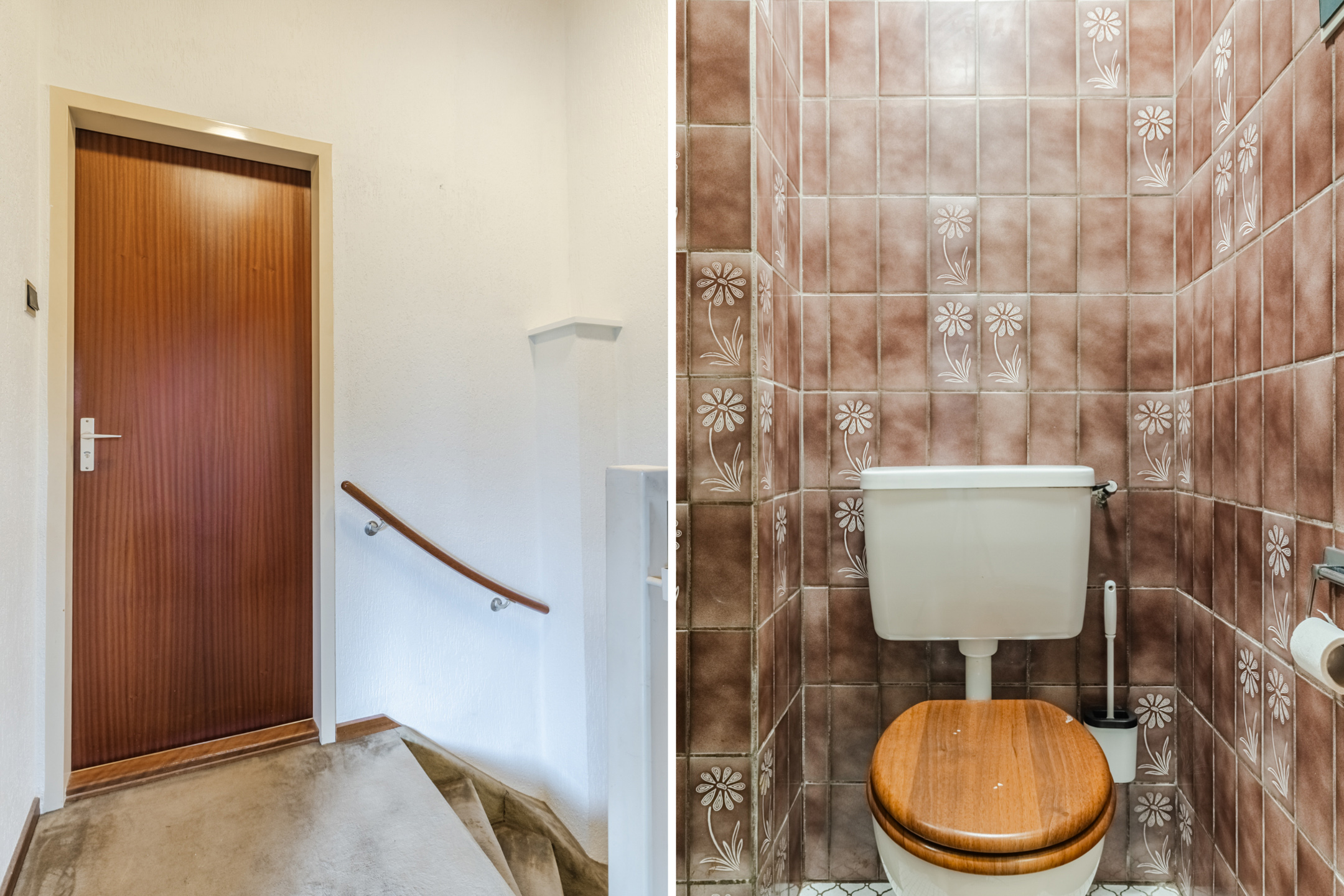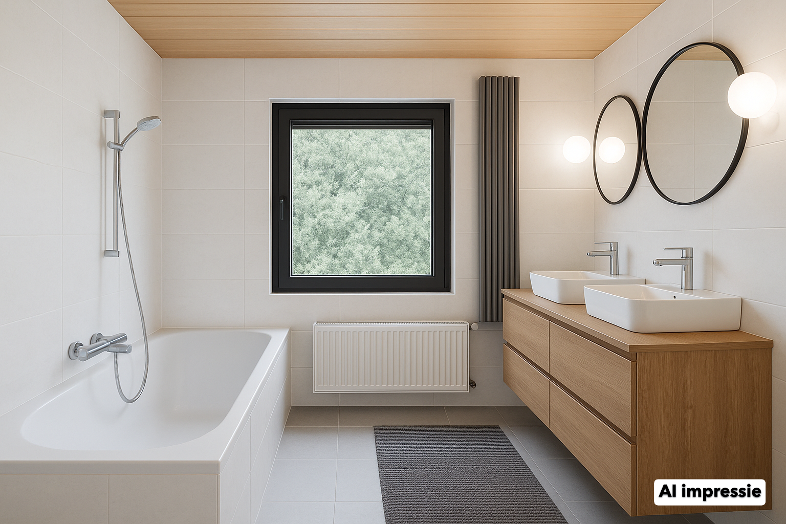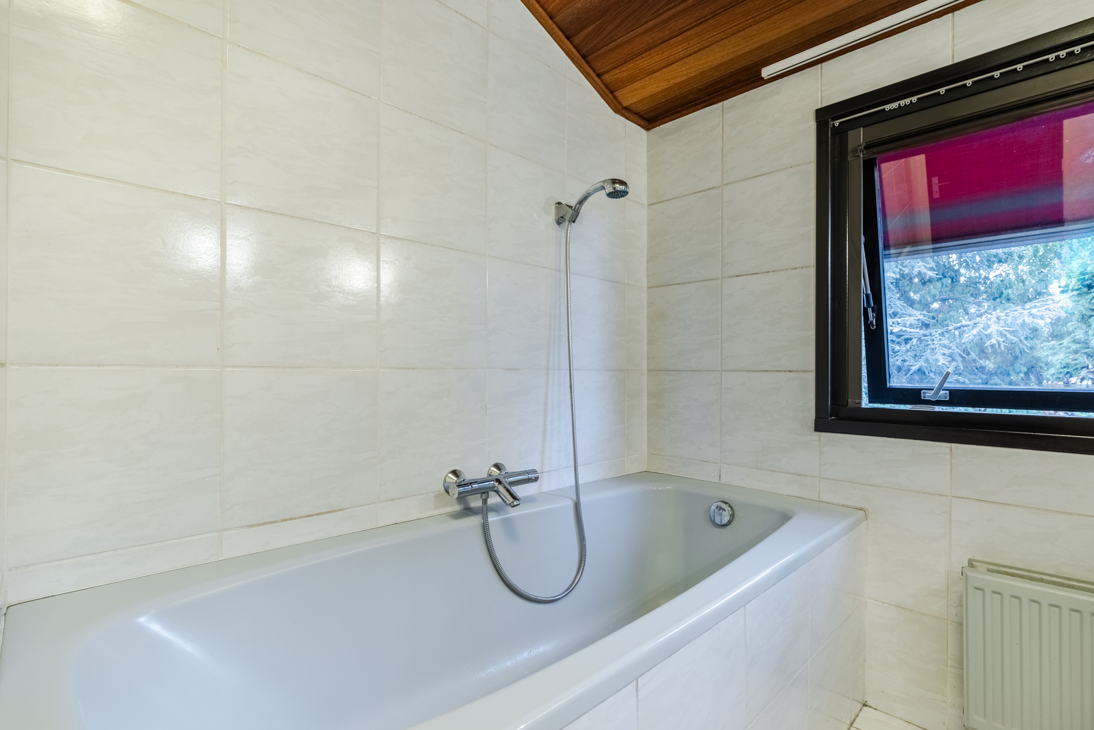 De tweede badkamer, gelegen aan de achterzijde van de woning, is voorzien van een ligbad met douche, wastafel en tweede toilet. Uitgevoerd in een klassieke kleurstelling en met een raam dat zorgt voor prettig daglicht en natuurlijke ventilatie.