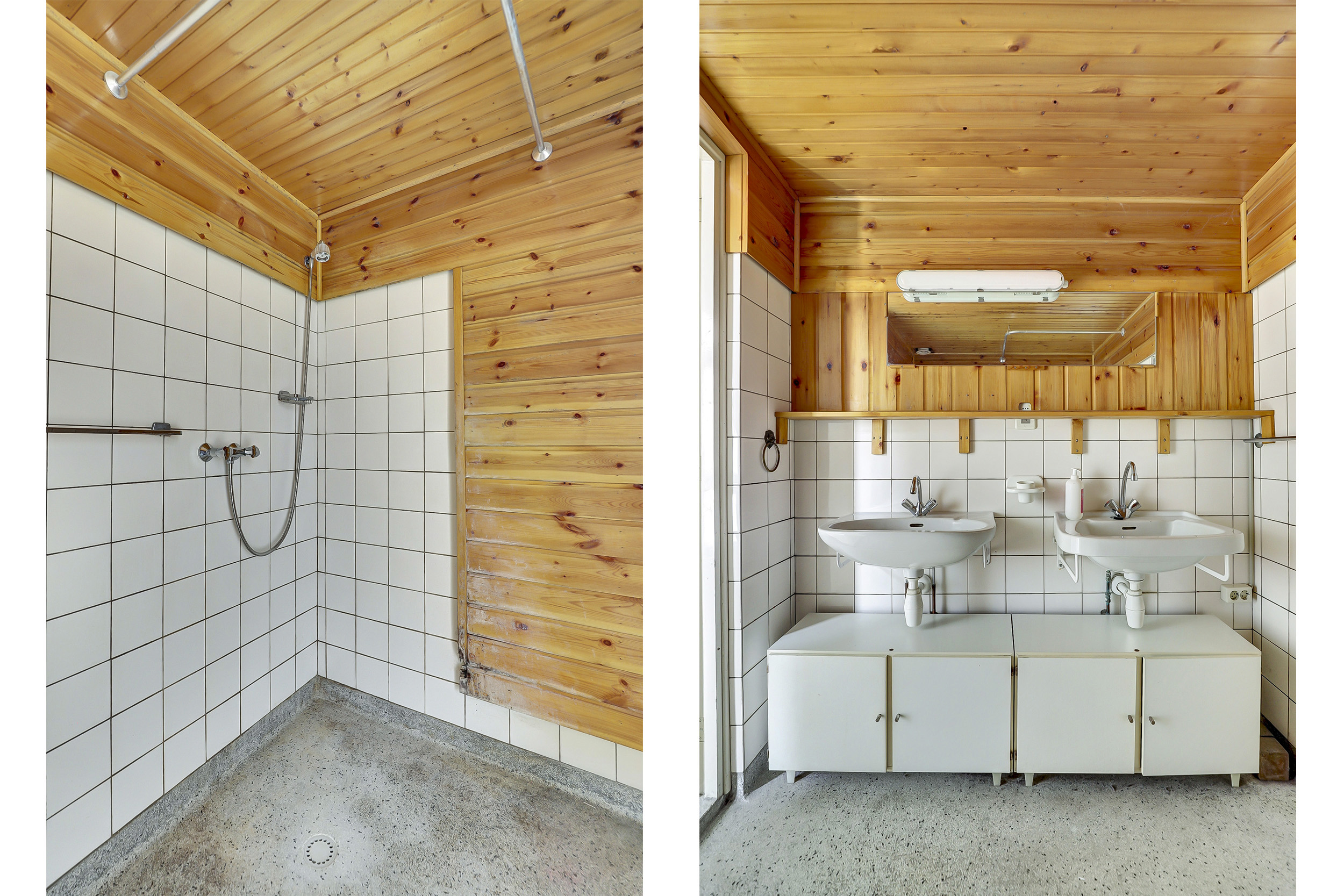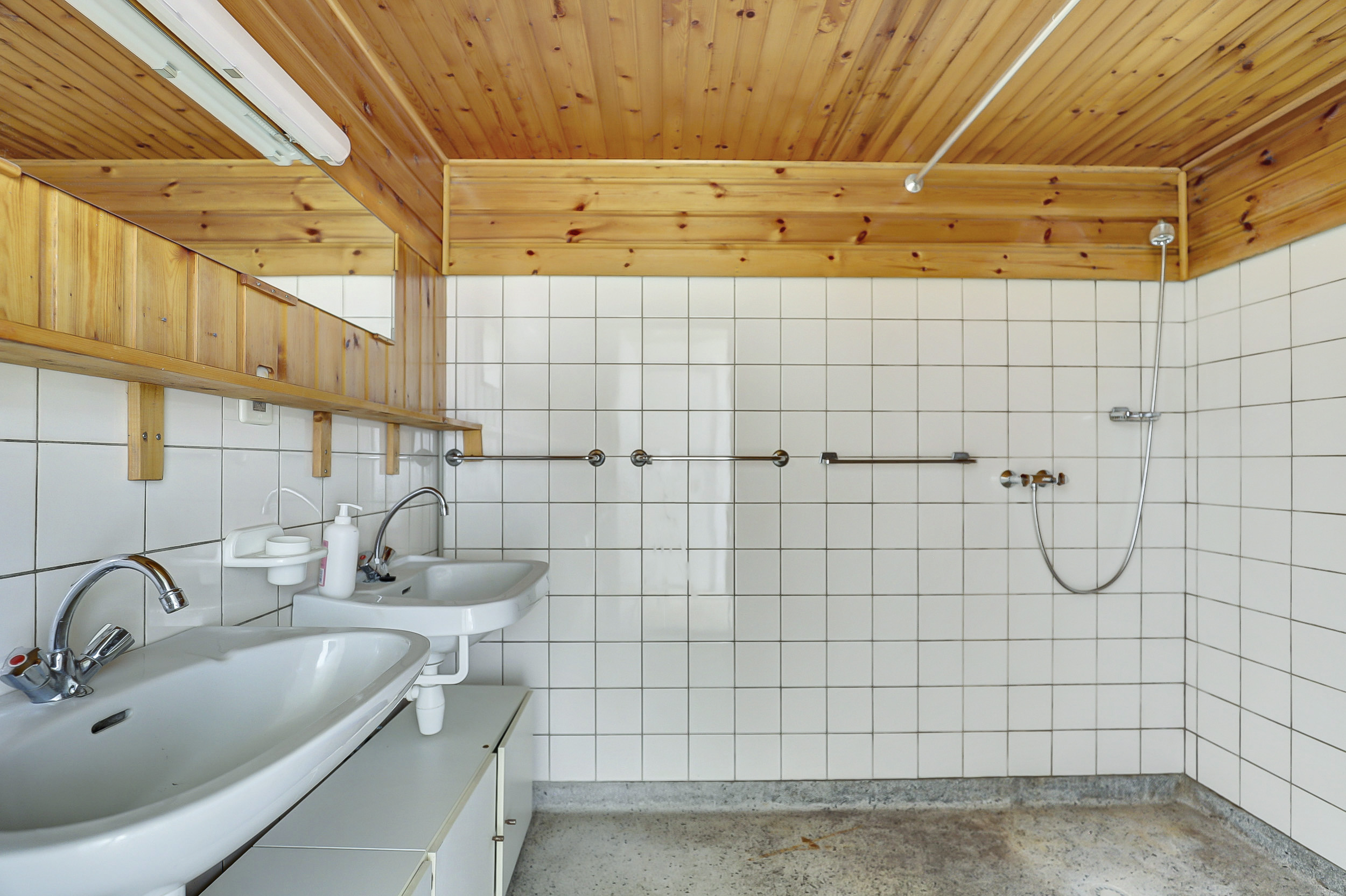 De badkamer (ca. 6 m²) bevindt zich op de begane grond en is uitgerust met een dubbele wastafel en een douche.