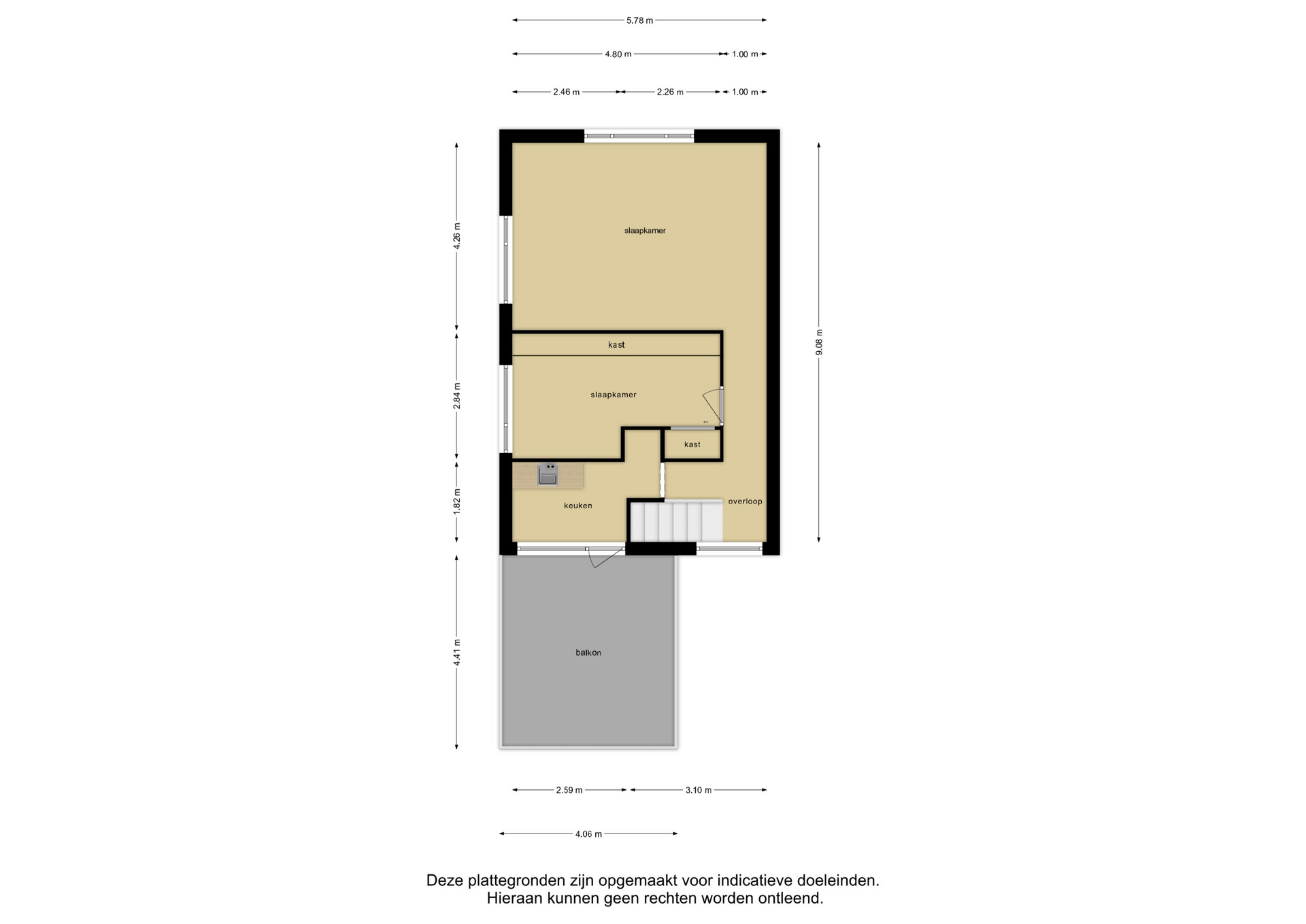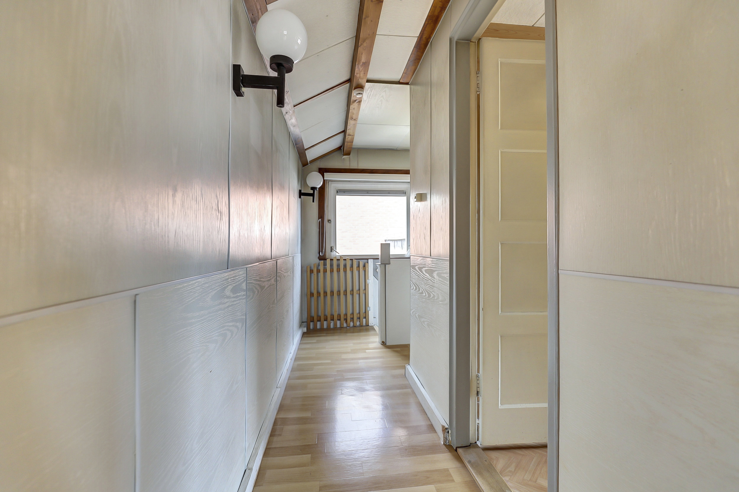 Via de vaste trap kom je op de overloop, die toegang biedt tot de keuken en twee slaapkamers.