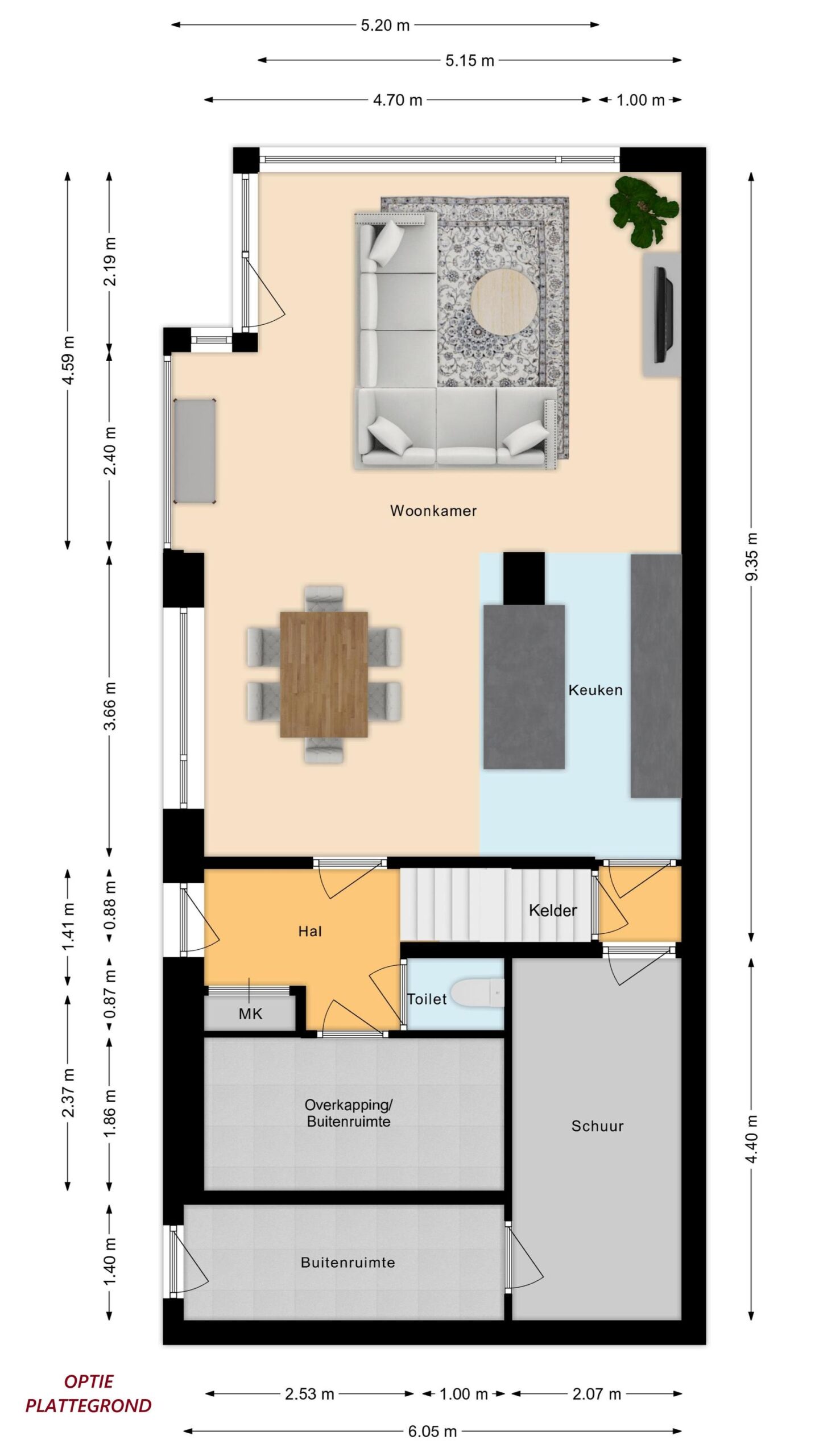 De centraal gelegen woonkamer (ca. 17 m²) beschikt over een grote raampartij aan de zijkant, wat zorgt voor een prettige lichtinval. Vanuit de woonkamer bereik je een tweede hal met toegang tot de kelder, een ruime multifunctionele kamer en de inpandige berging/schuur.
