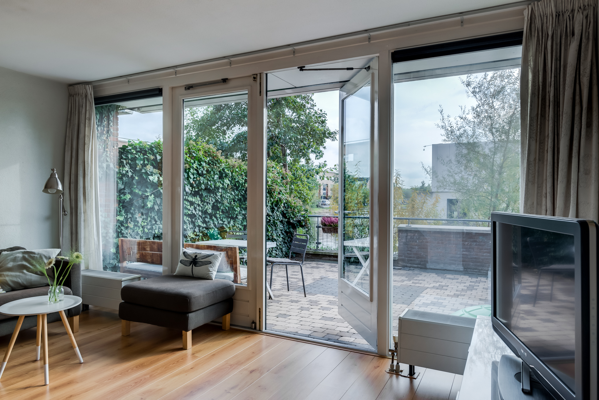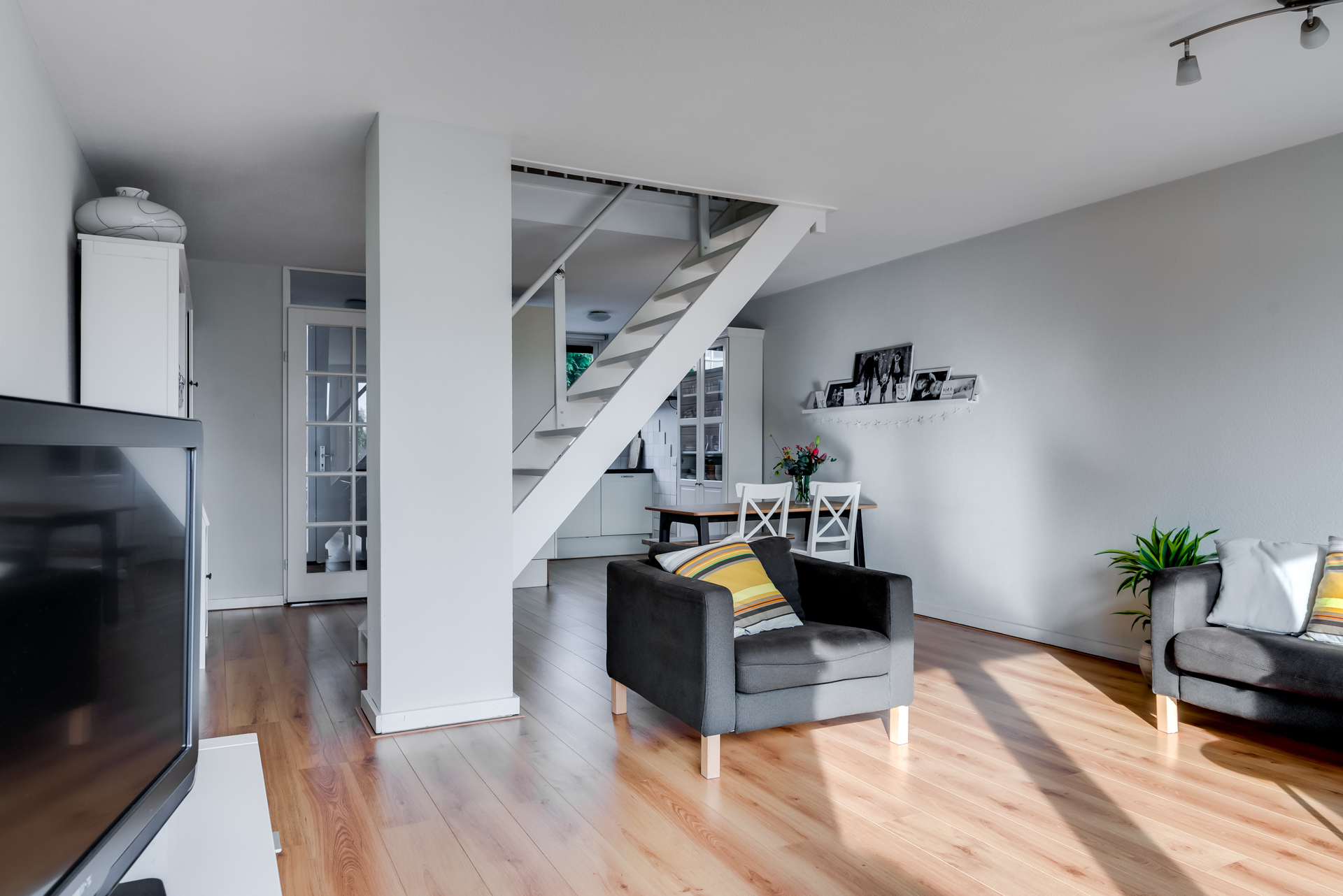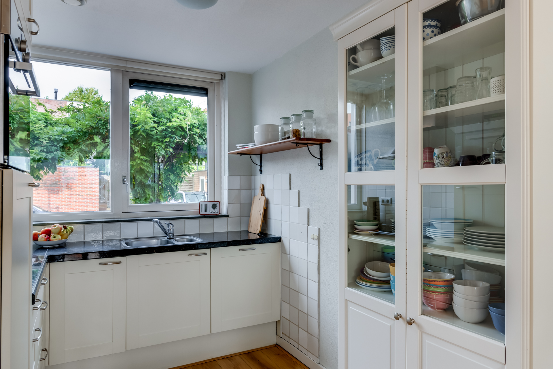 Entree, hal met toilet en meterkast/bergkast. Aan de voorzijde van de woning is de keukenruimte gesitueerd. Deze eenvoudige keuken is geplaatst in een L-opstelling en voorzien van inbouwapparatuur. De woning kenmerkt zich door de praktische ruimteverdeling op de begane grond; een ruime zitkamer aan de achterzijde en een prima eetgedeelte grenzend aan de keuken (totaal ca. 35m2), gescheiden door de trapopstelling. Door de openslaande deuren ga je vanuit de zitkamer naar het zonovergoten terras. De gehele begane grond is lekker licht dankzij de grote raampartijen aan voor- en achterzijde en heeft een neutrale laminaatvloer en een lichte wandafwerking.