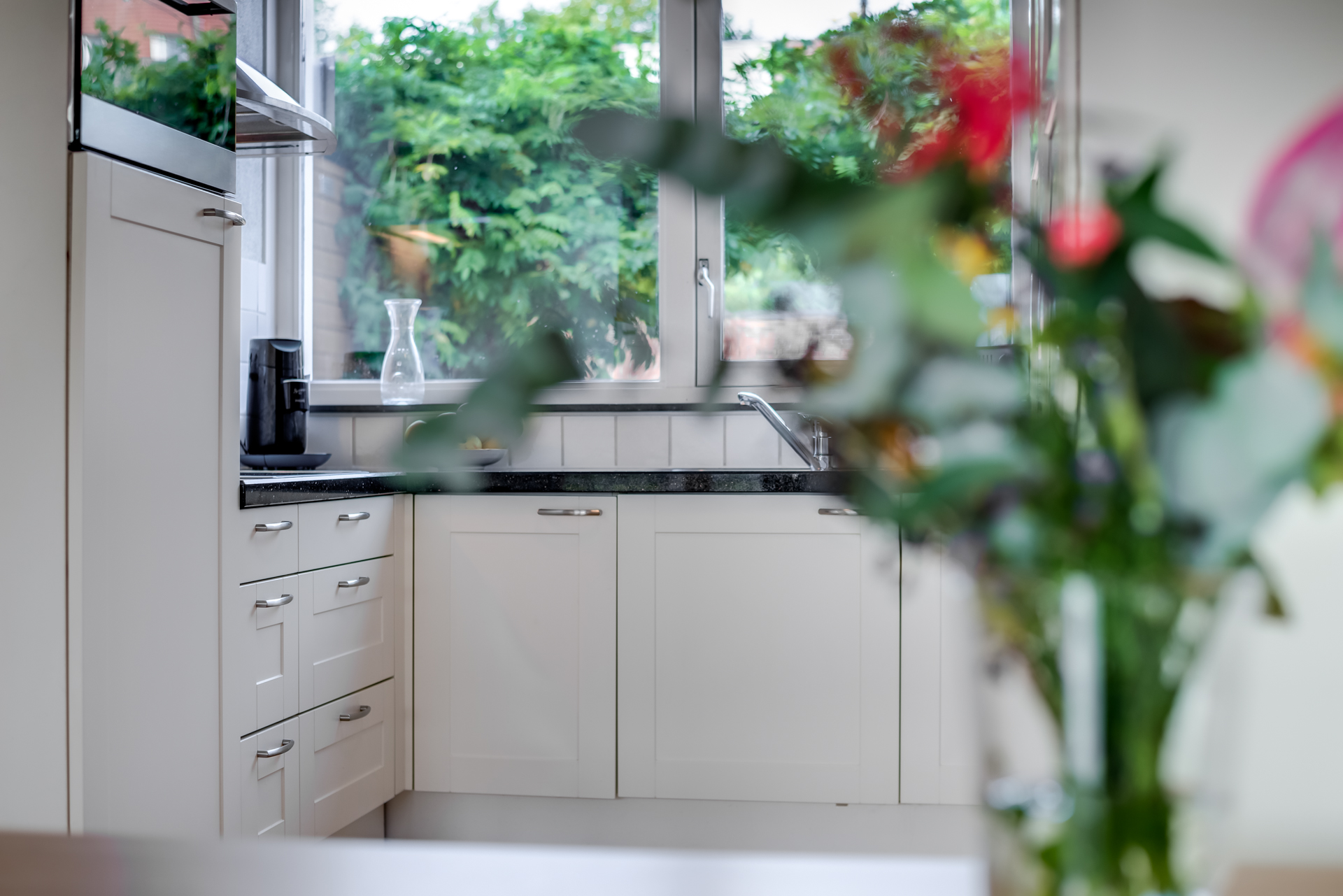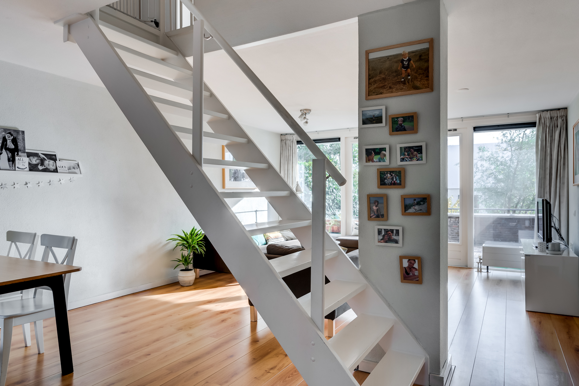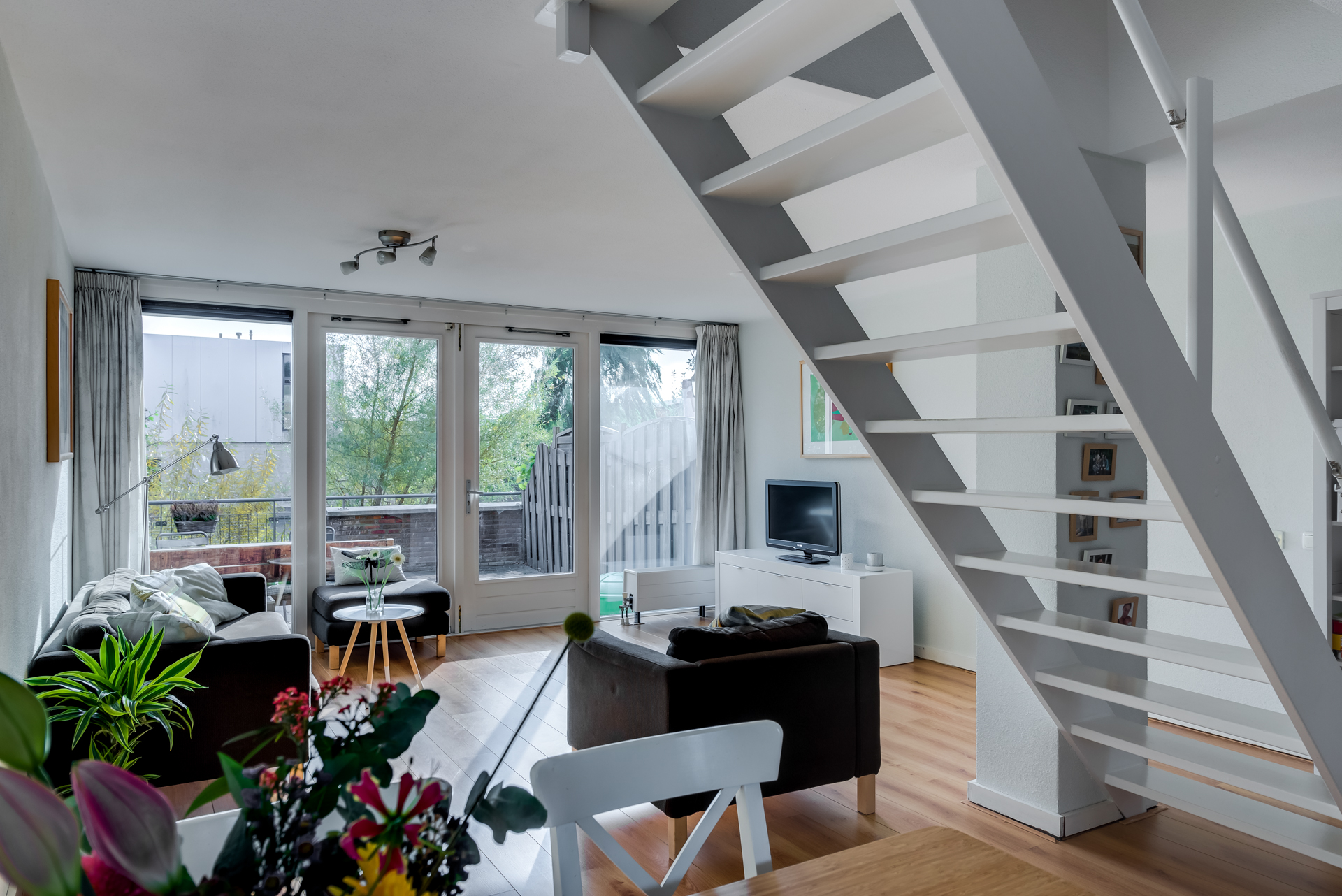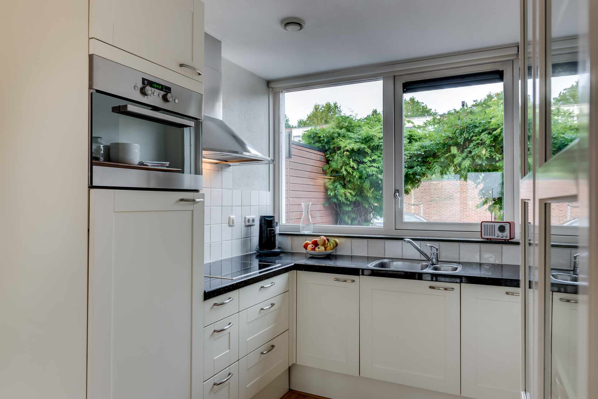 Entree, hal met toilet en meterkast/bergkast. Aan de voorzijde van de woning is de keukenruimte gesitueerd. Deze eenvoudige keuken is geplaatst in een L-opstelling en voorzien van inbouwapparatuur. De woning kenmerkt zich door de praktische ruimteverdeling op de begane grond; een ruime zitkamer aan de achterzijde en een prima eetgedeelte grenzend aan de keuken (totaal ca. 35m2), gescheiden door de trapopstelling. Door de openslaande deuren ga je vanuit de zitkamer naar het zonovergoten terras. De gehele begane grond is lekker licht dankzij de grote raampartijen aan voor- en achterzijde en heeft een neutrale laminaatvloer en een lichte wandafwerking.