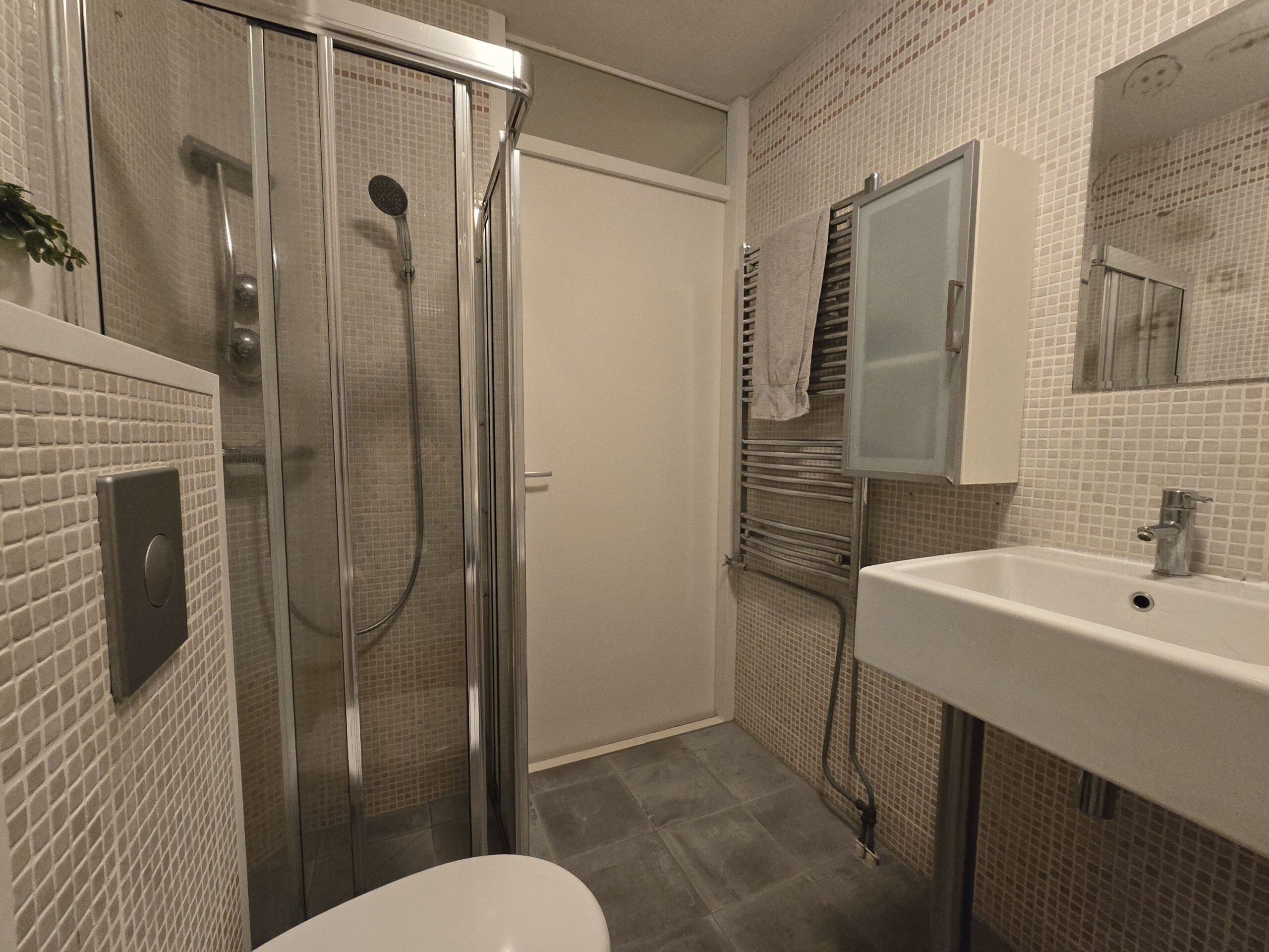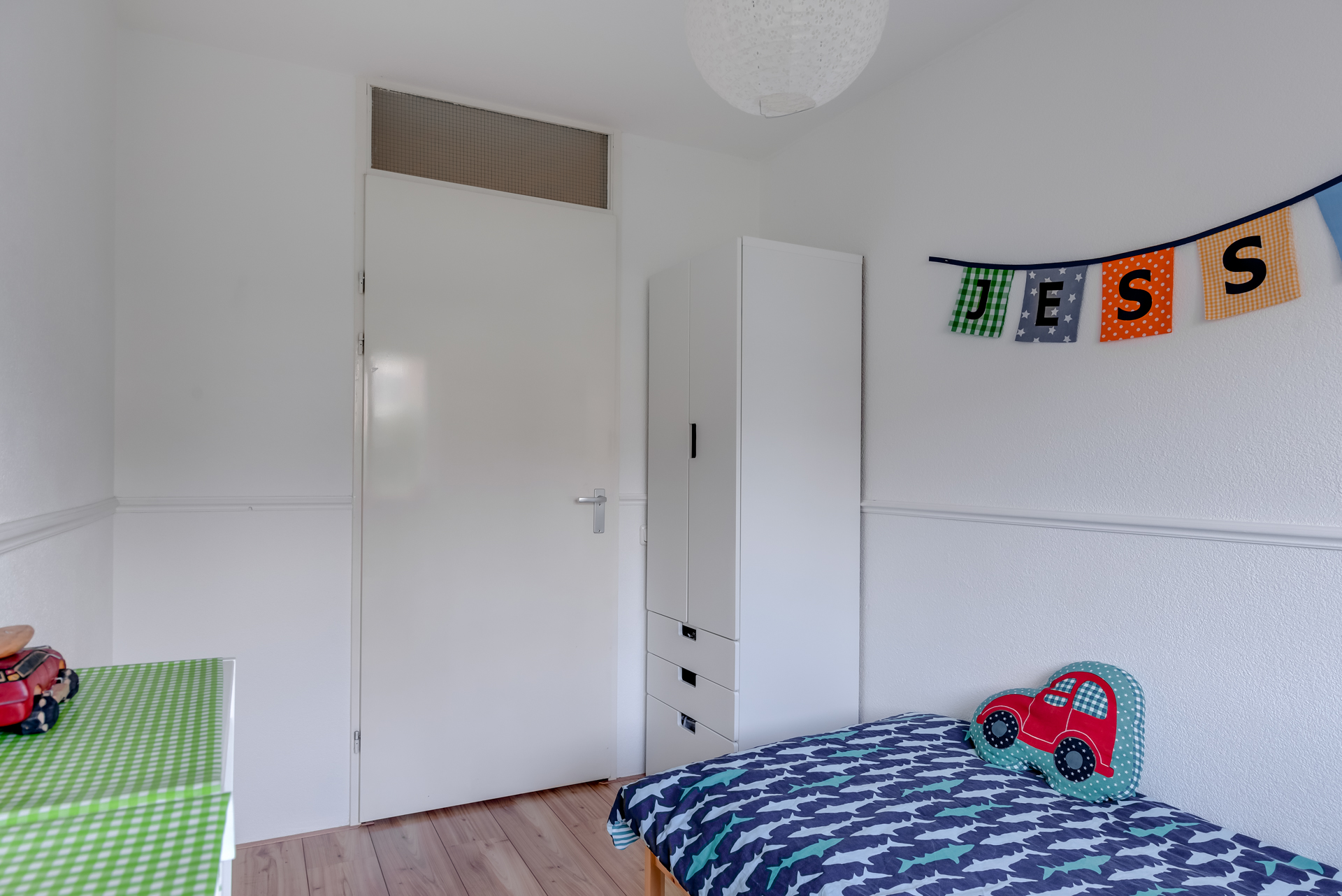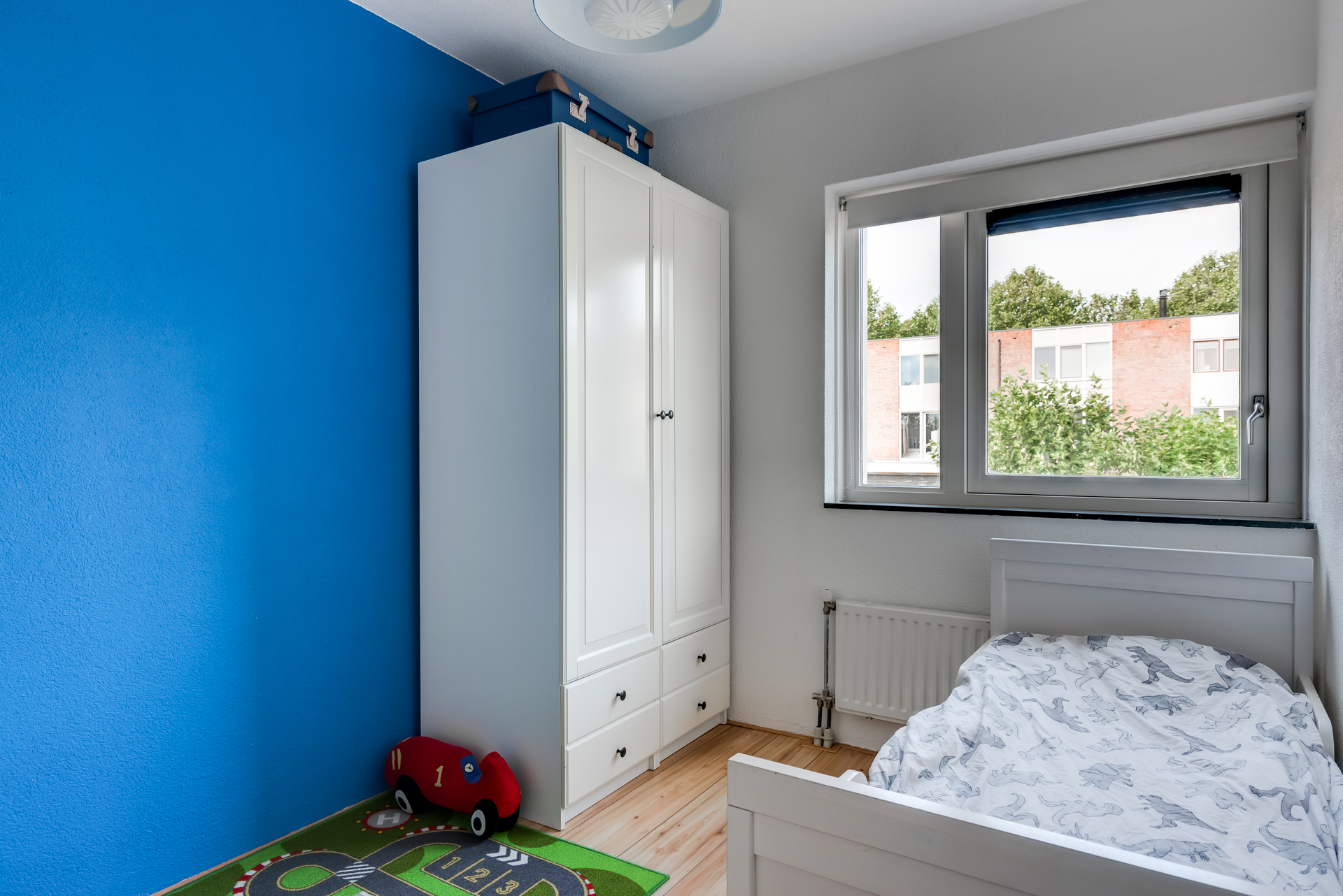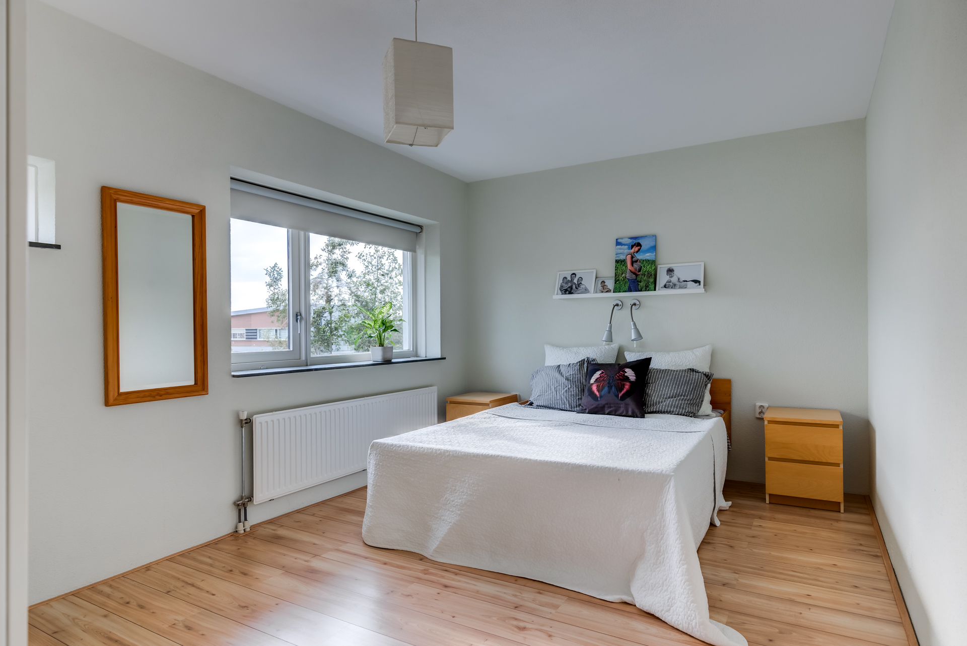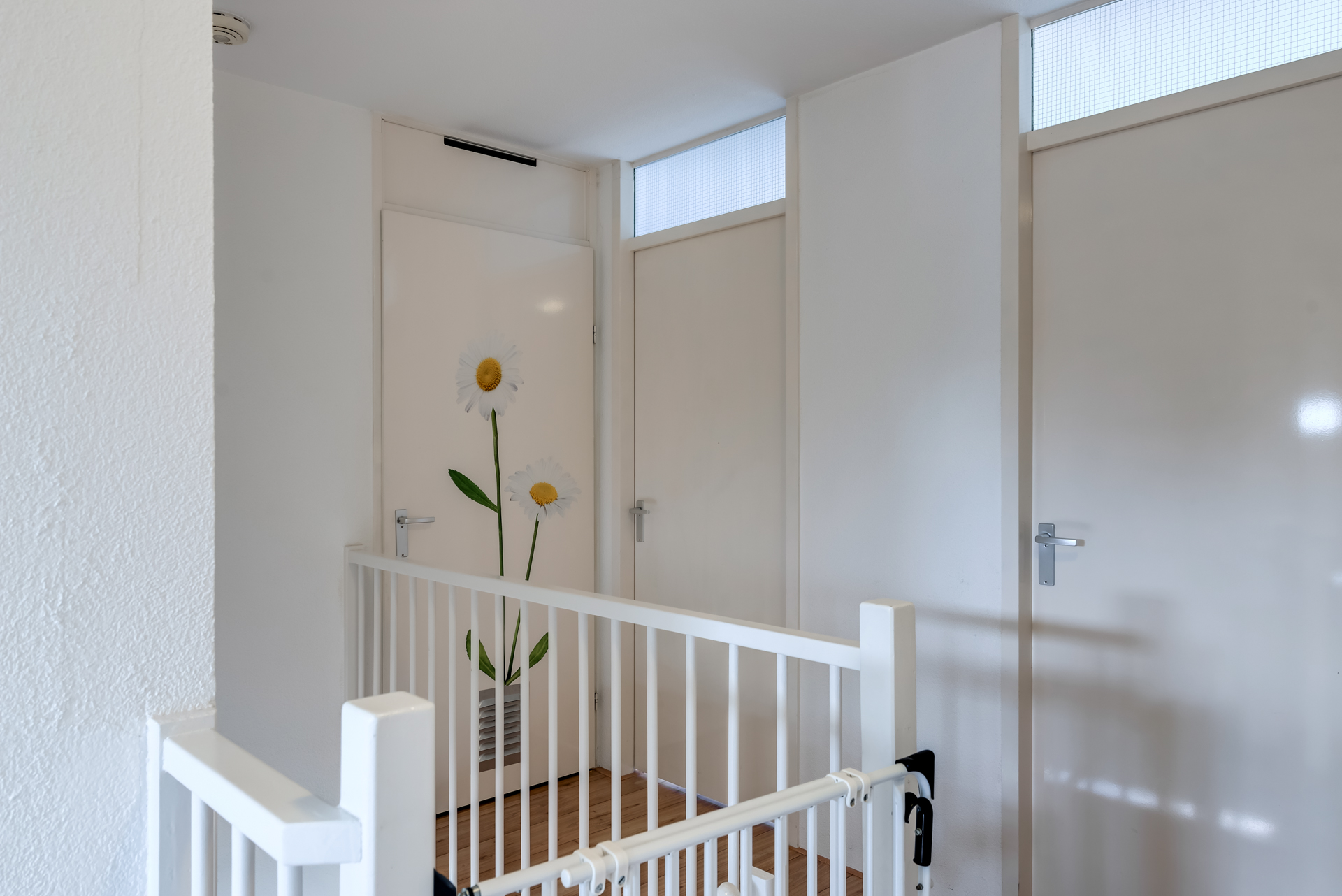 Ruime en lichte overloop waar een grote kastenwand geplaatst kan worden, praktische inpandige bergruimte met CV-ketel en aansluitingen voor de wasmachine en droger. Aan de voorzijde van de woning zijn 2 kleine maar volwaardige (slaap)kamers gerealiseerd die uitkijken op de verkeersluwe straat en omgeving. Aan de achterzijde van de woning bevindt zich de grote ouderslaapkamer over de gehele breedte van de woning. Met gemak kan hier een grote kast worden geplaatst. Bovendien biedt deze kamer een prachtig uitzicht over het groen en het water aan de achterzijde. Op de eerste verdieping bevindt zich ook de verzorgde inpandige badkamer met een douche, een tweede staand toilet en een wastafel. De badkamer is uitgevoerd in een neutrale betegeling. De gehele eerste verdieping is voorzien van een neutrale laminaatvloer en een lichte wandafwerking.