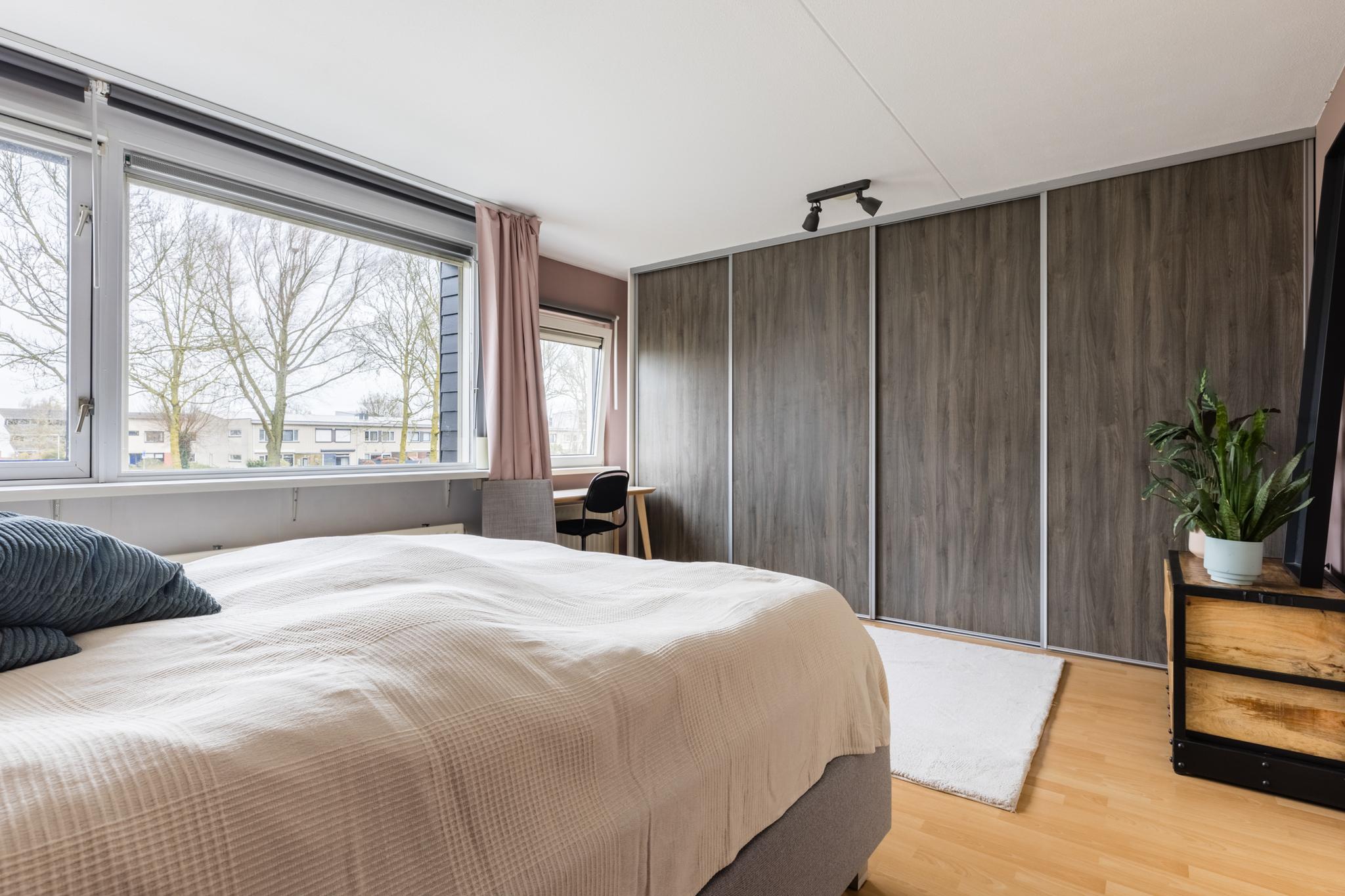 Aan de achterzijde bevindt zich de lichte en woningbrede “masterbedroom” (ca. 18m2) voorzien van grote raampartijen en een inbouwkast. Deze kamer is van een zeer riant formaat en wanneer de wens er is, kan deze kamer (middels een kleine aanpassing) worden opgedeeld in 2 volwaardige slaapkamers. Deze slaapkamer kijkt uit op de gezellige achtertuinen en het water.