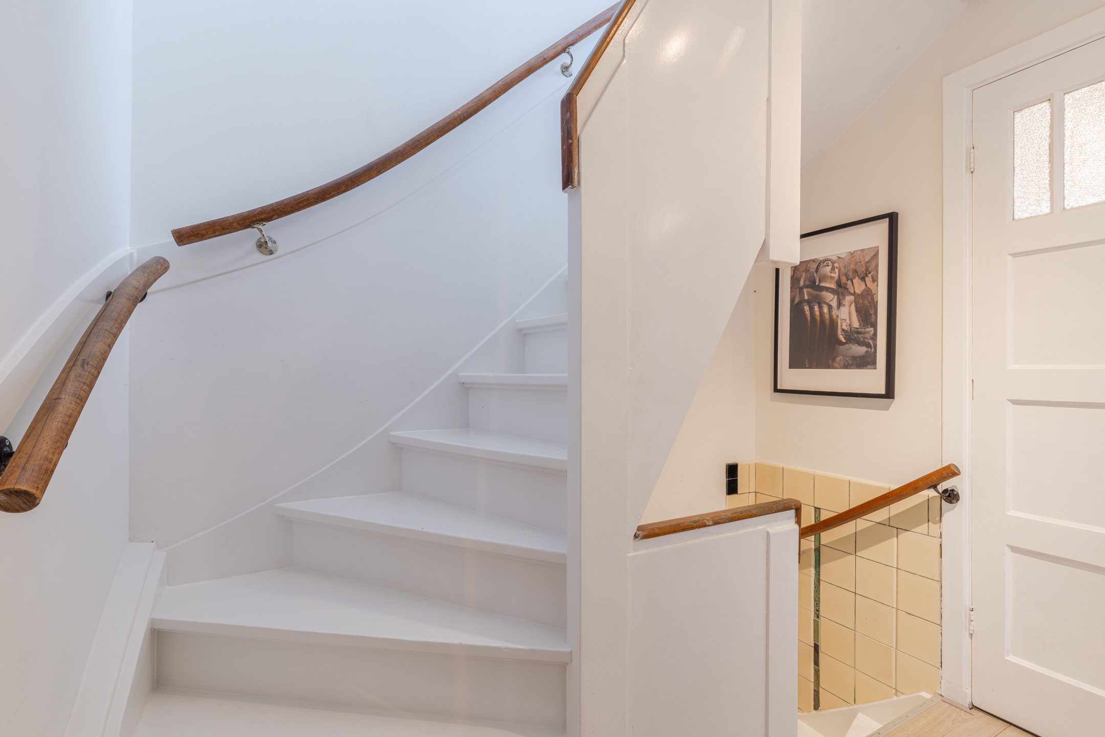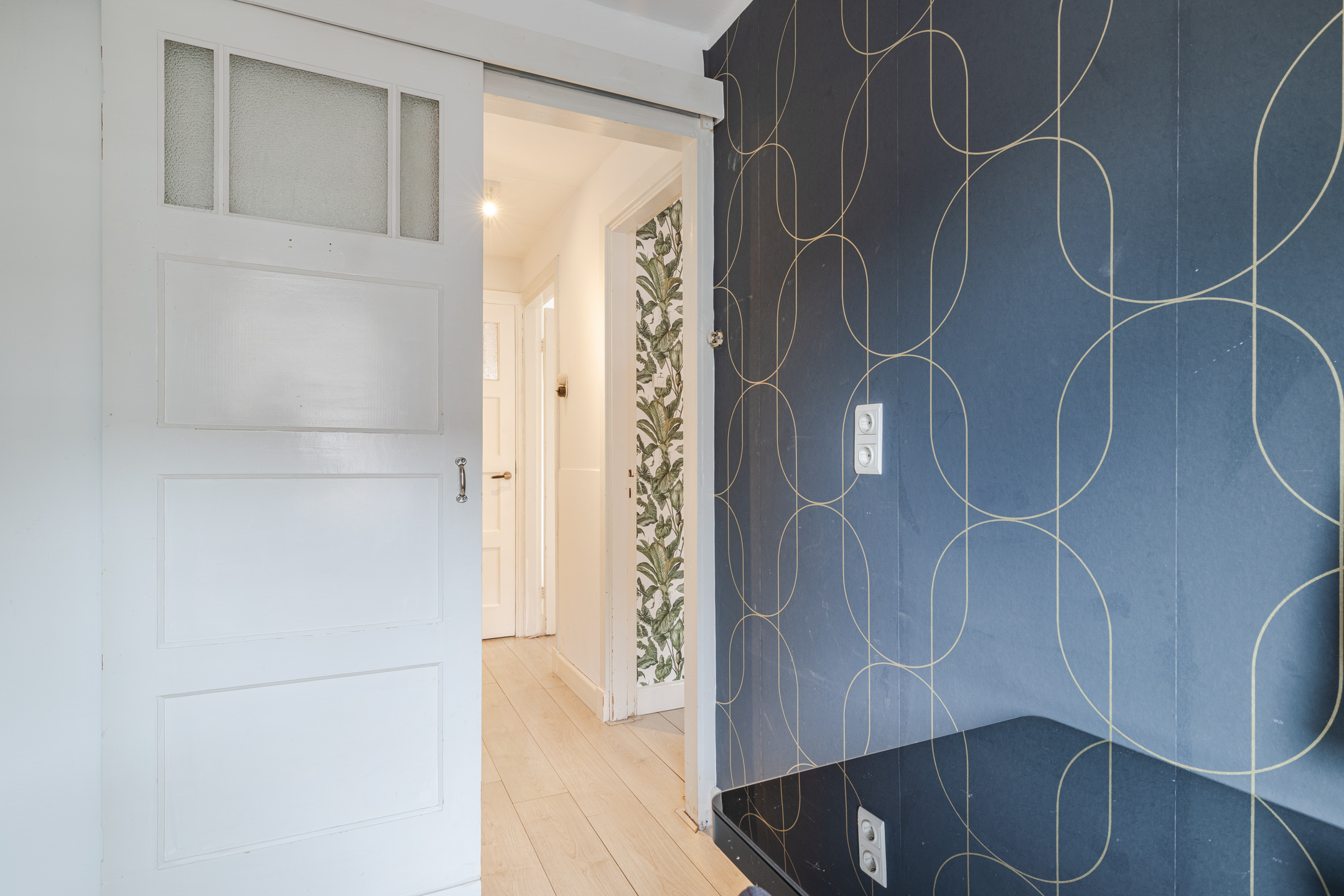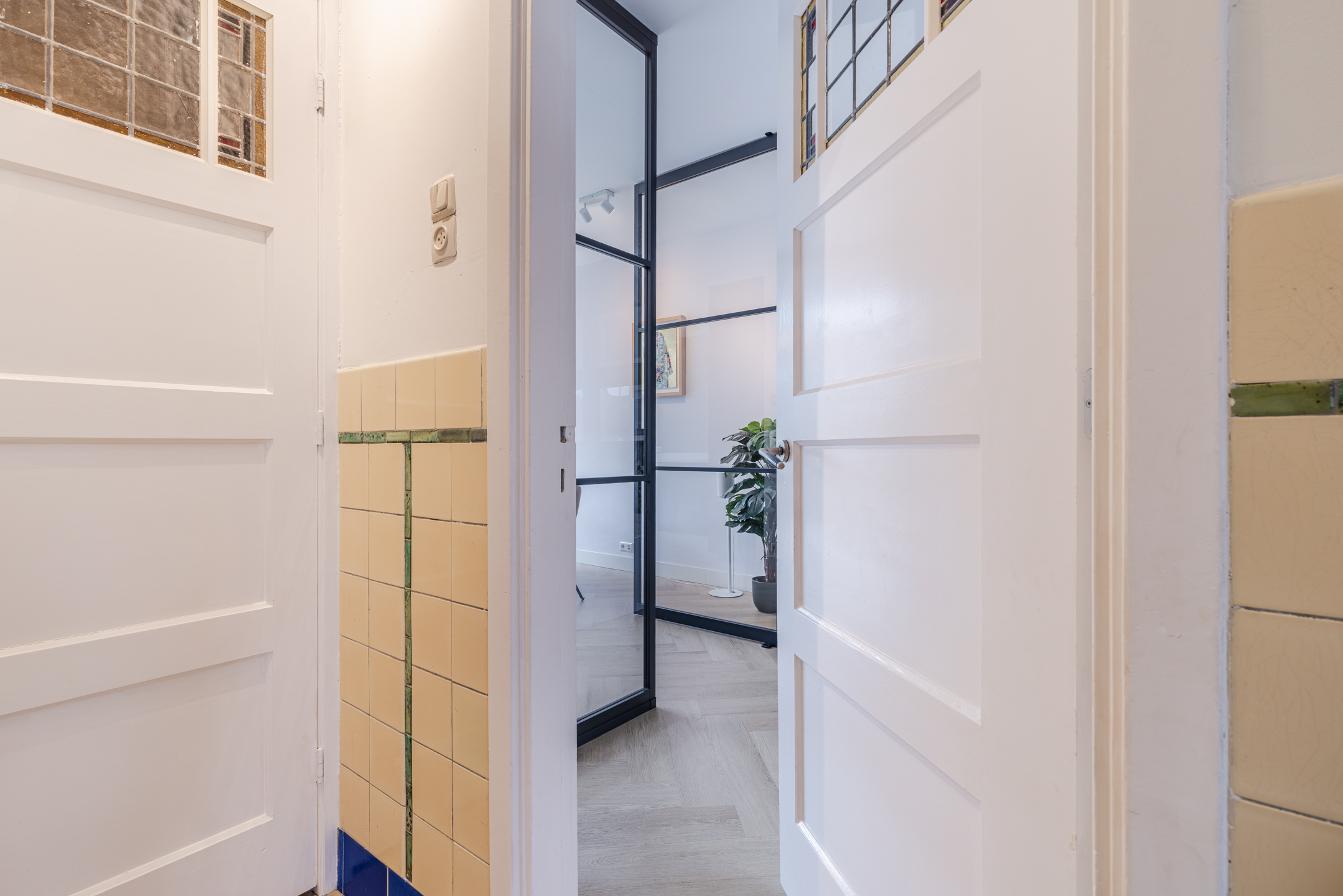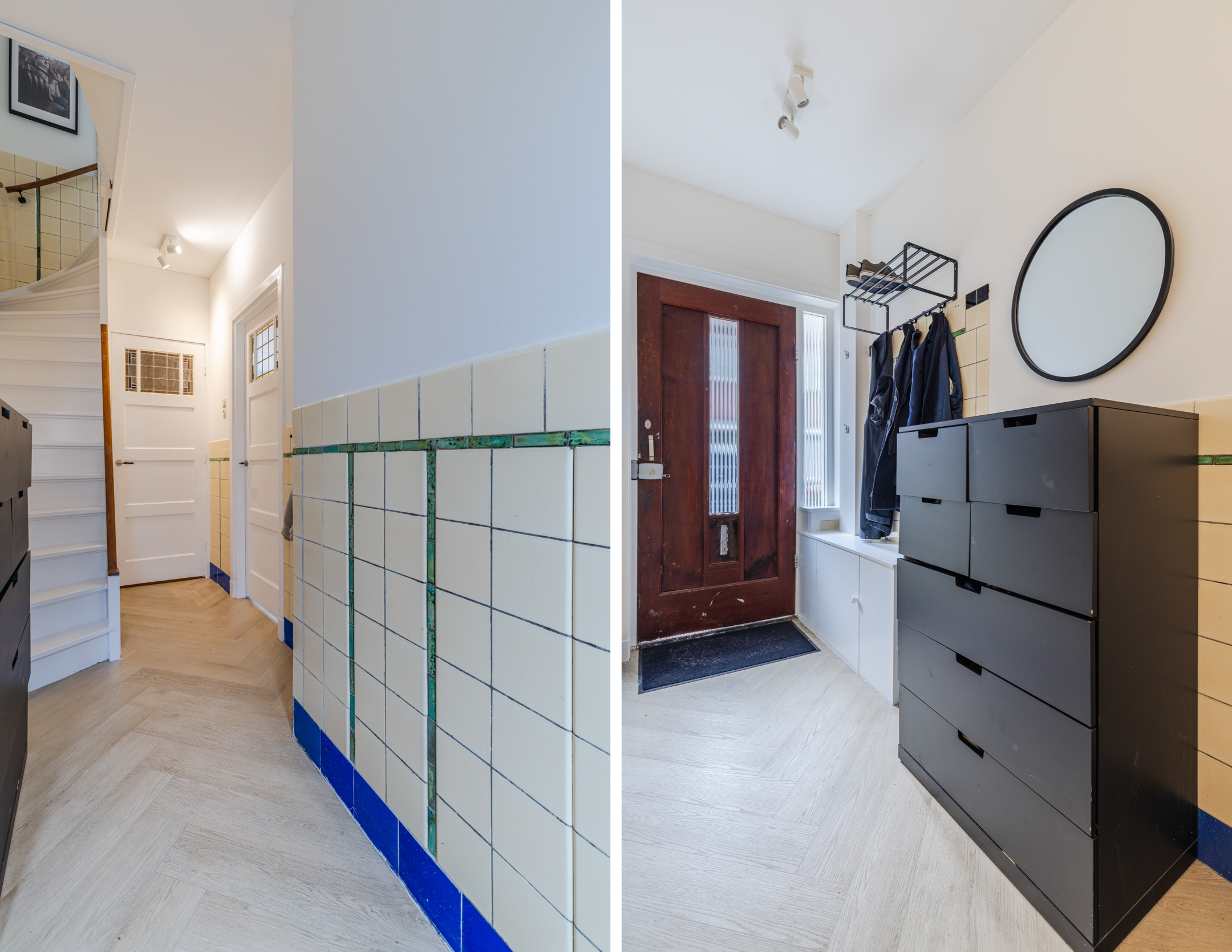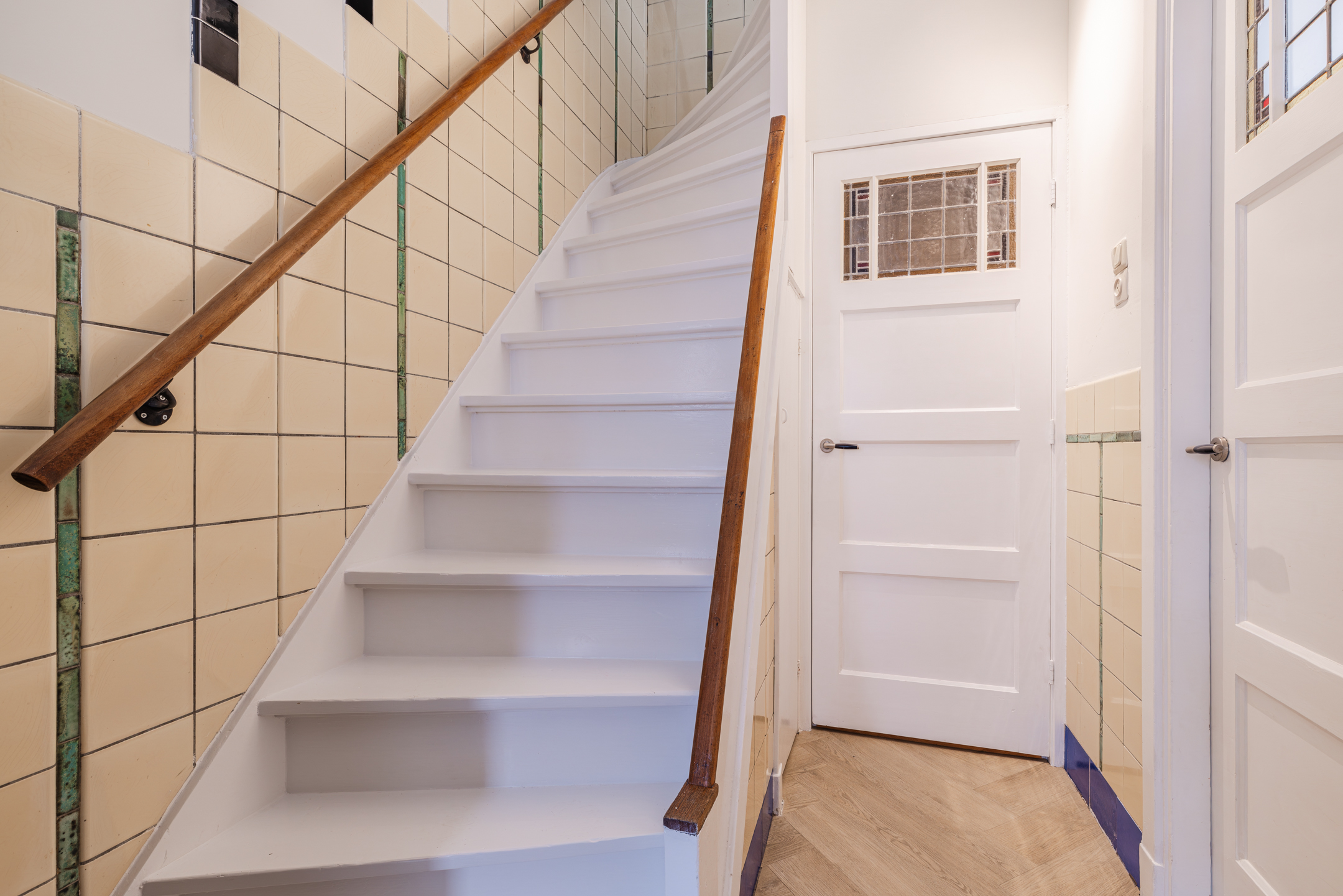Entree, hal, garderobe, waterontharder (geplaatst medio 2024), toiletruimte met hangend toilet en fontein. Vanuit de hal is er toegang tot de trapopgang naar de eerste verdieping met praktische trapkast waarin tevens de meterkast is verwerkt en toegang tot de woonkamer.