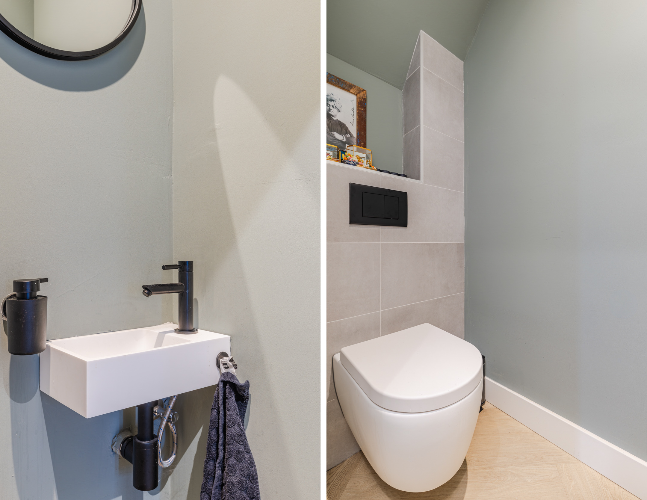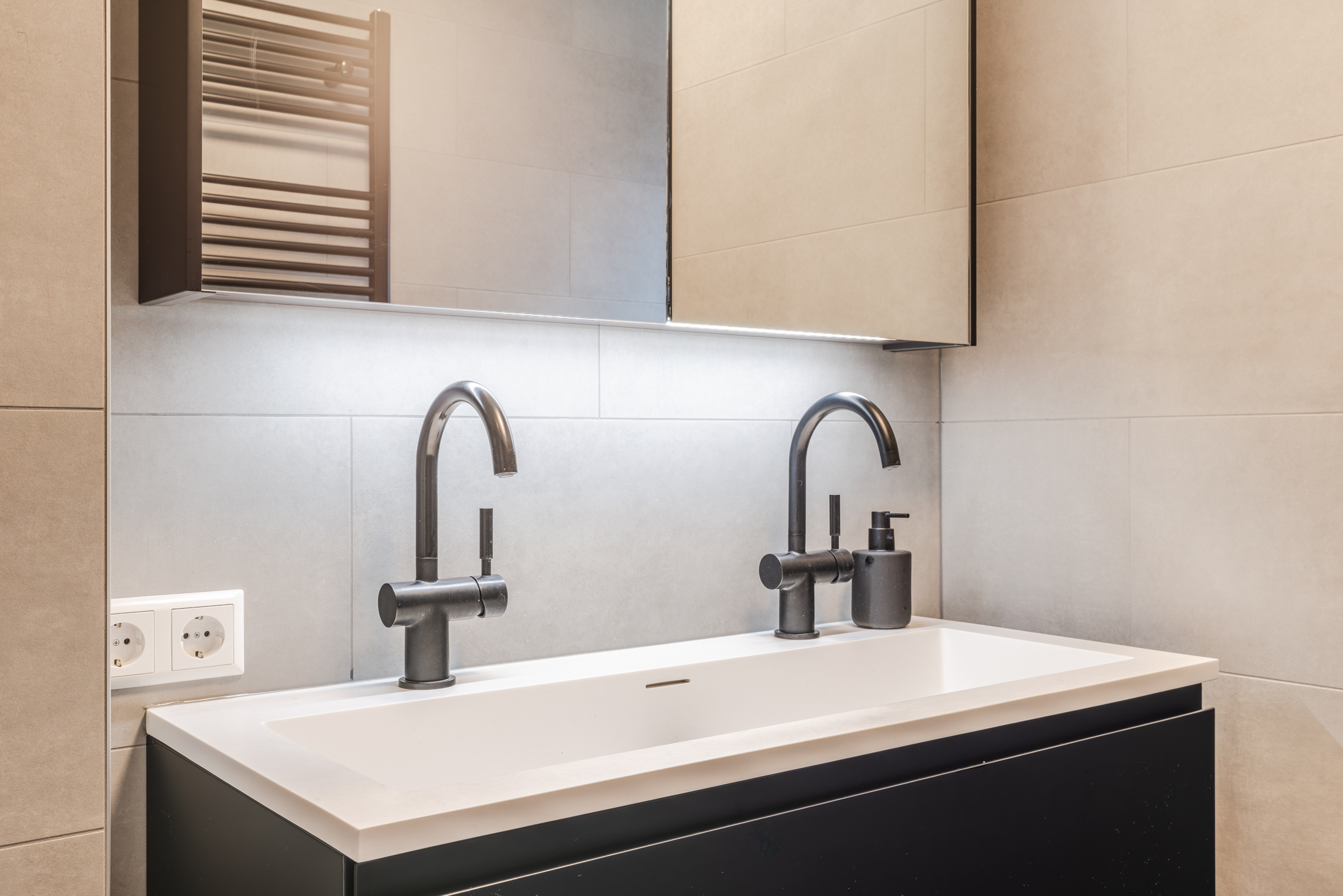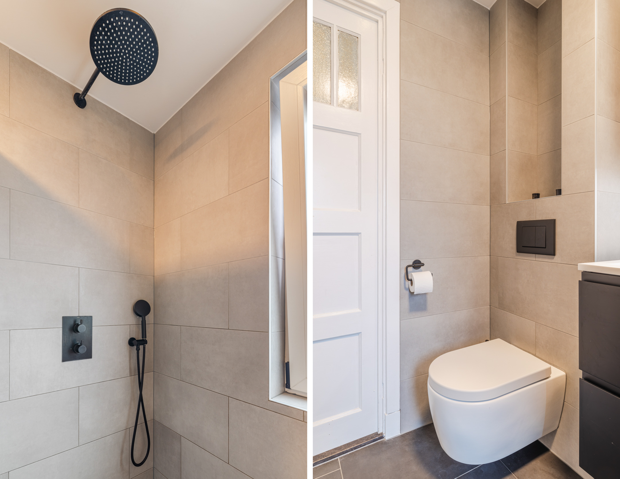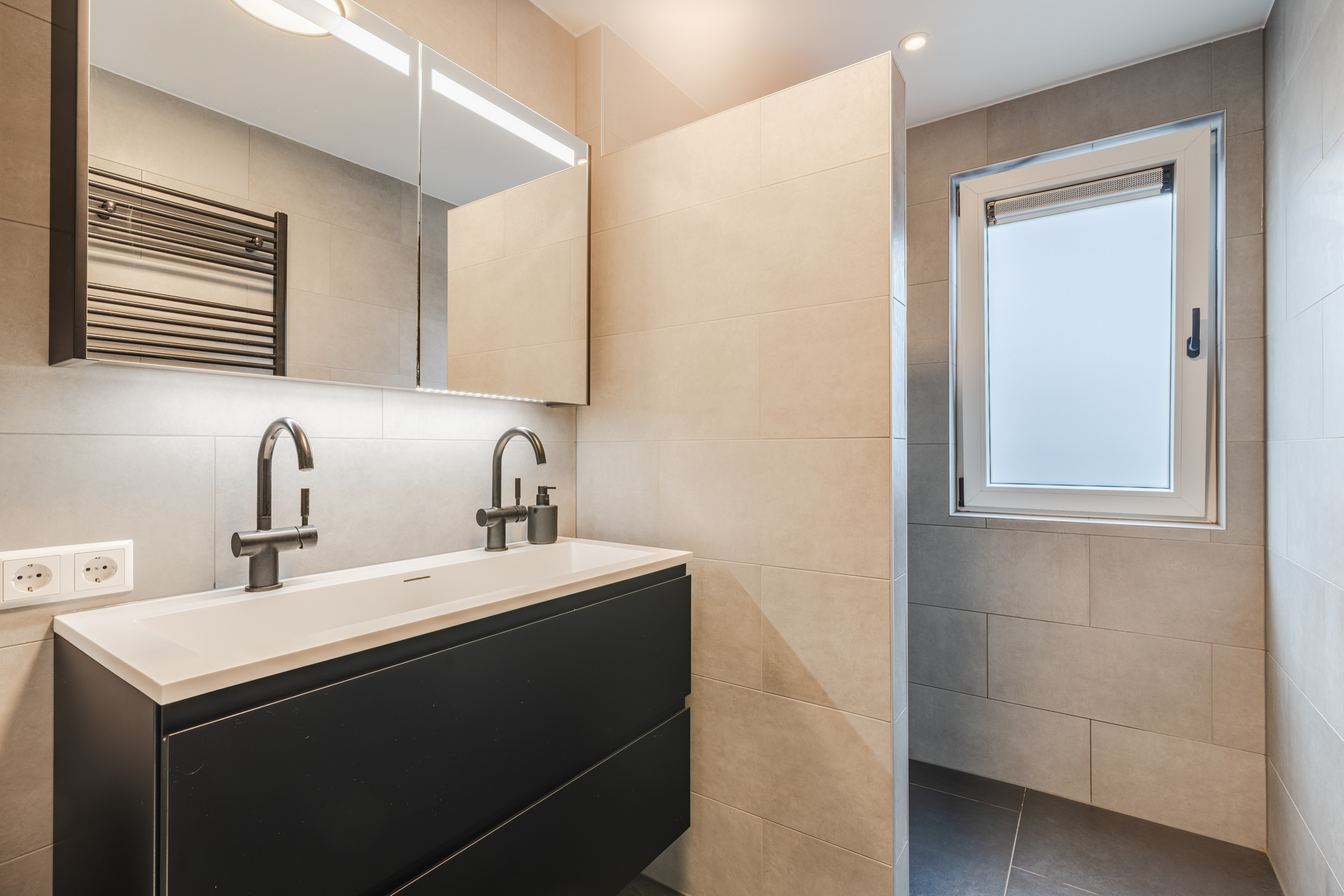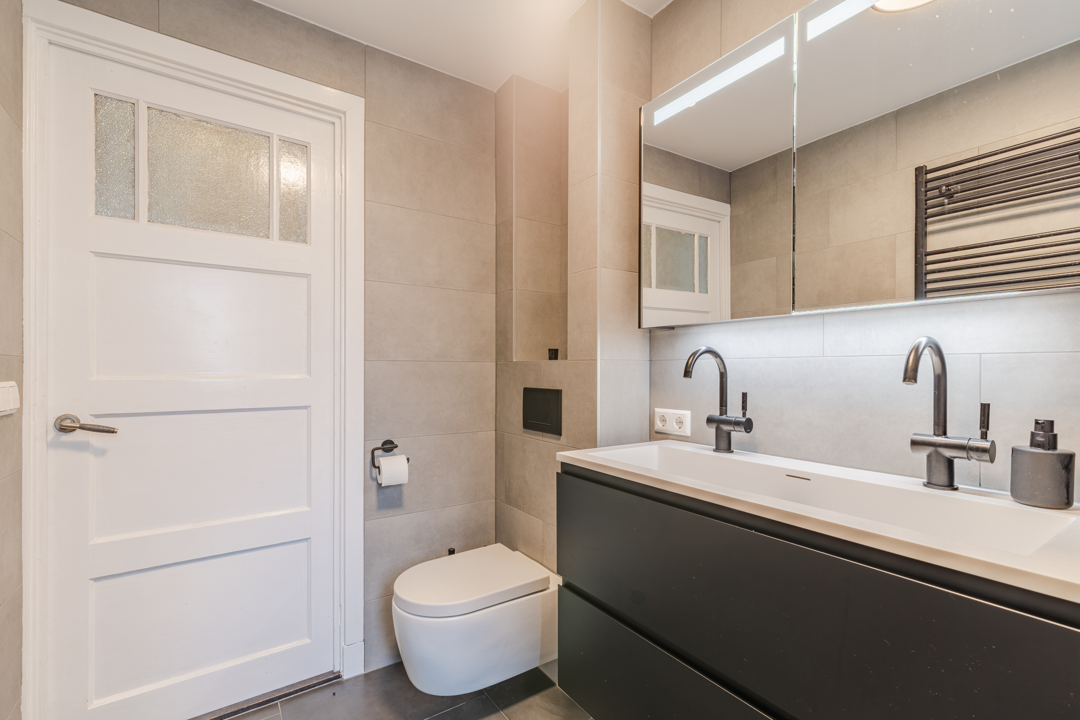 De luxe badkamer (geheel vernieuwd medio 2024) is gelegen aan de achterzijde van de woning en uitgevoerd met donkergrijze vloertegels, lichtgrijze wandtegels en een strak gestuct plafond. De ruimte beschikt over een inloopdouche, een dubbele wastafel met meubel, een tweede toilet, vloerverwarming, een designradiator en een raam ten behoeve van daglicht en ventilatie.