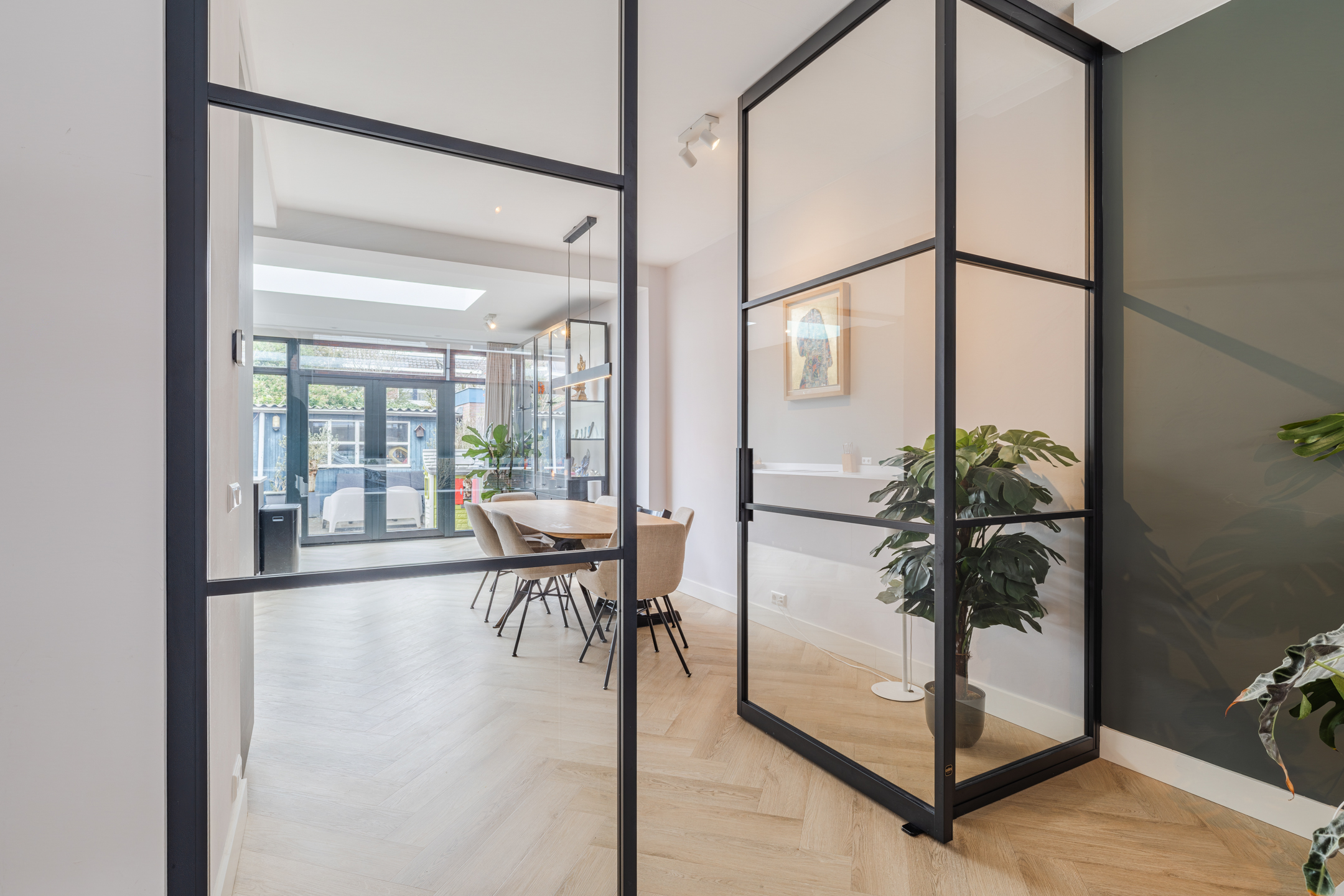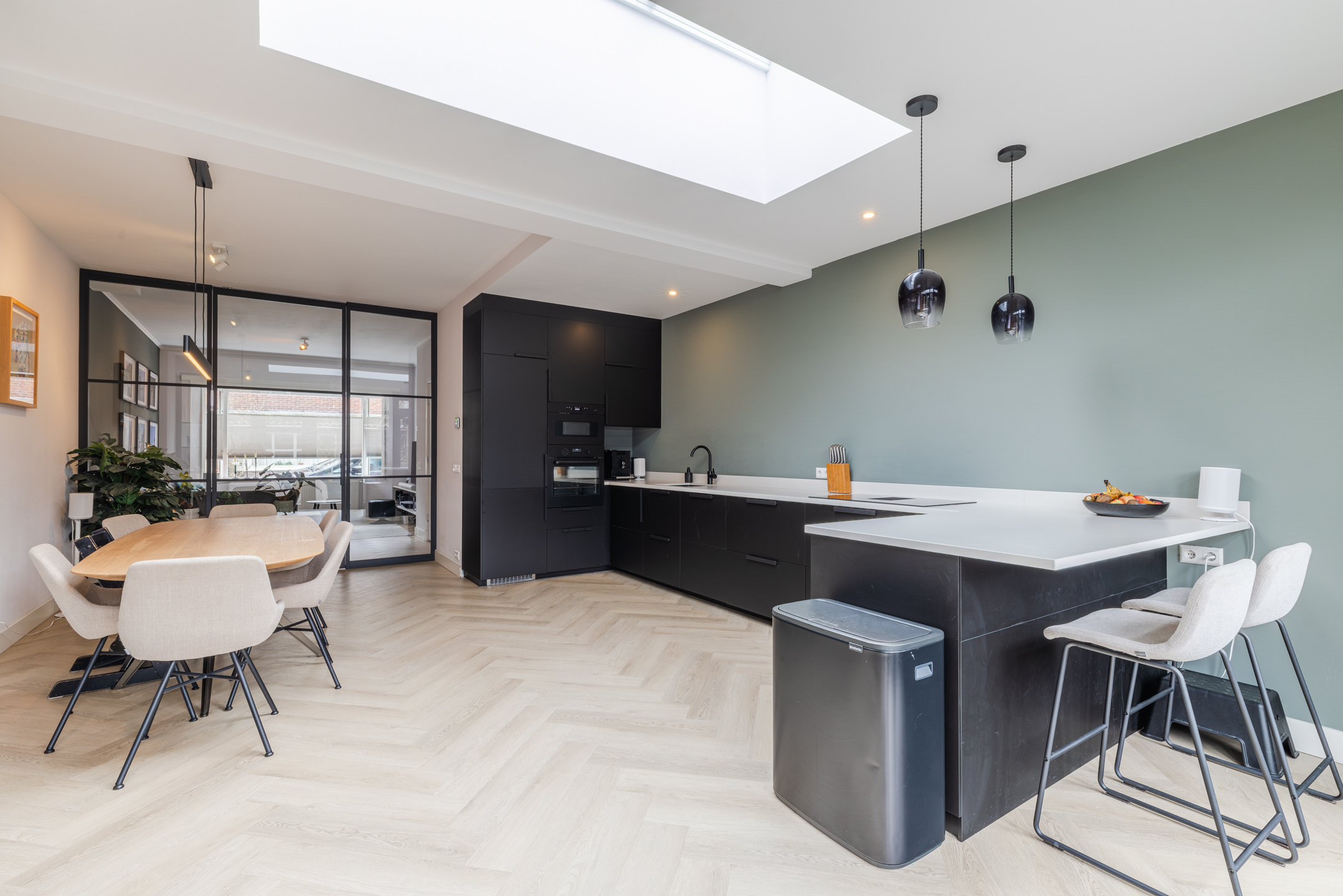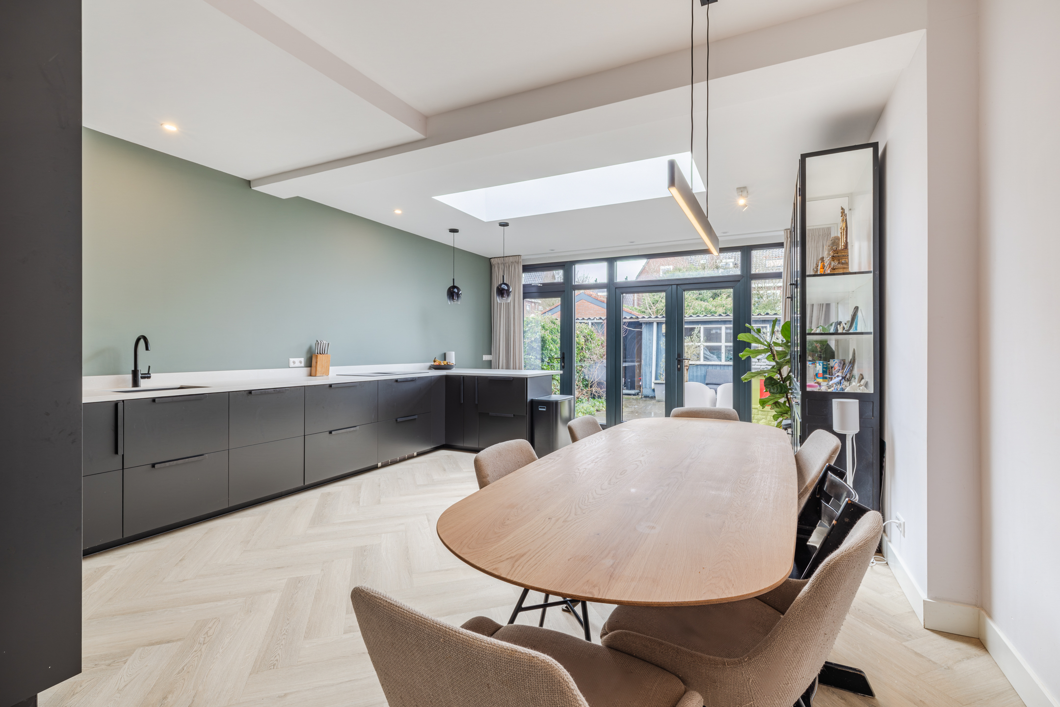 Aan de achterzijde van de woning bevindt zich de royale, tuingerichte en uitgebouwde woonkeuken. Door de plaatsing van een prachtige lichtstraat, voelt deze ruimte nog groter aan dan deze al is. Een heerlijke plek om te genieten van een heerlijk diner met het gezin, familie en/of vrienden.