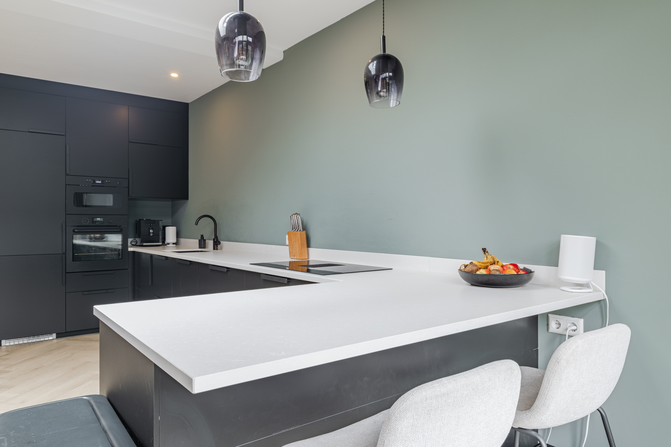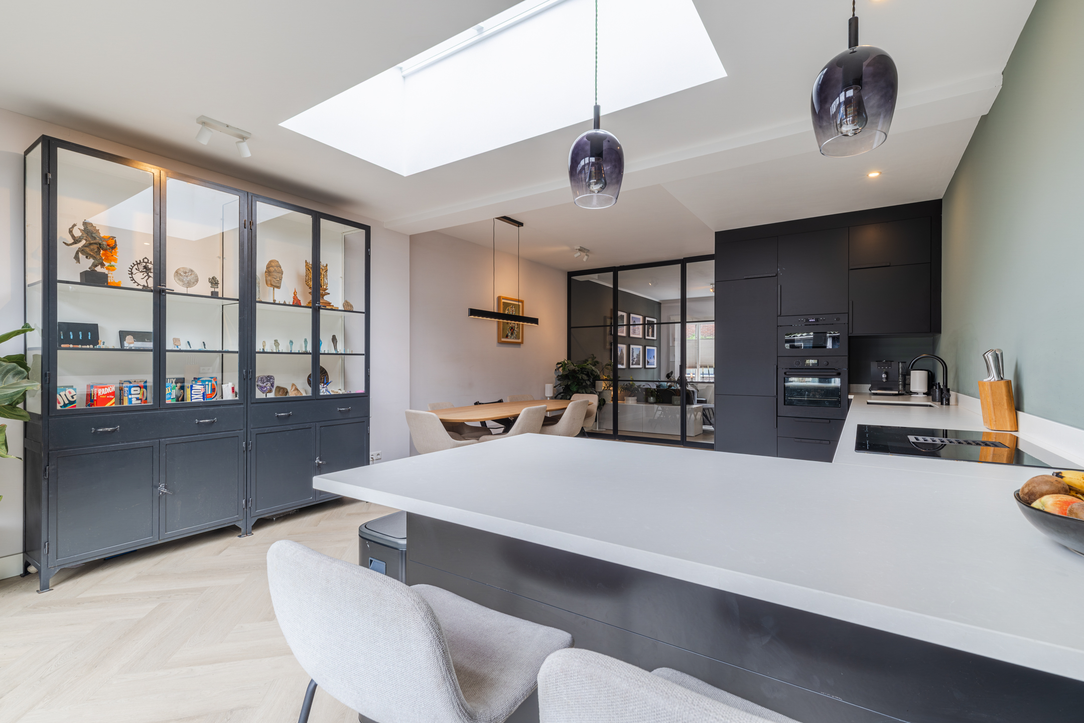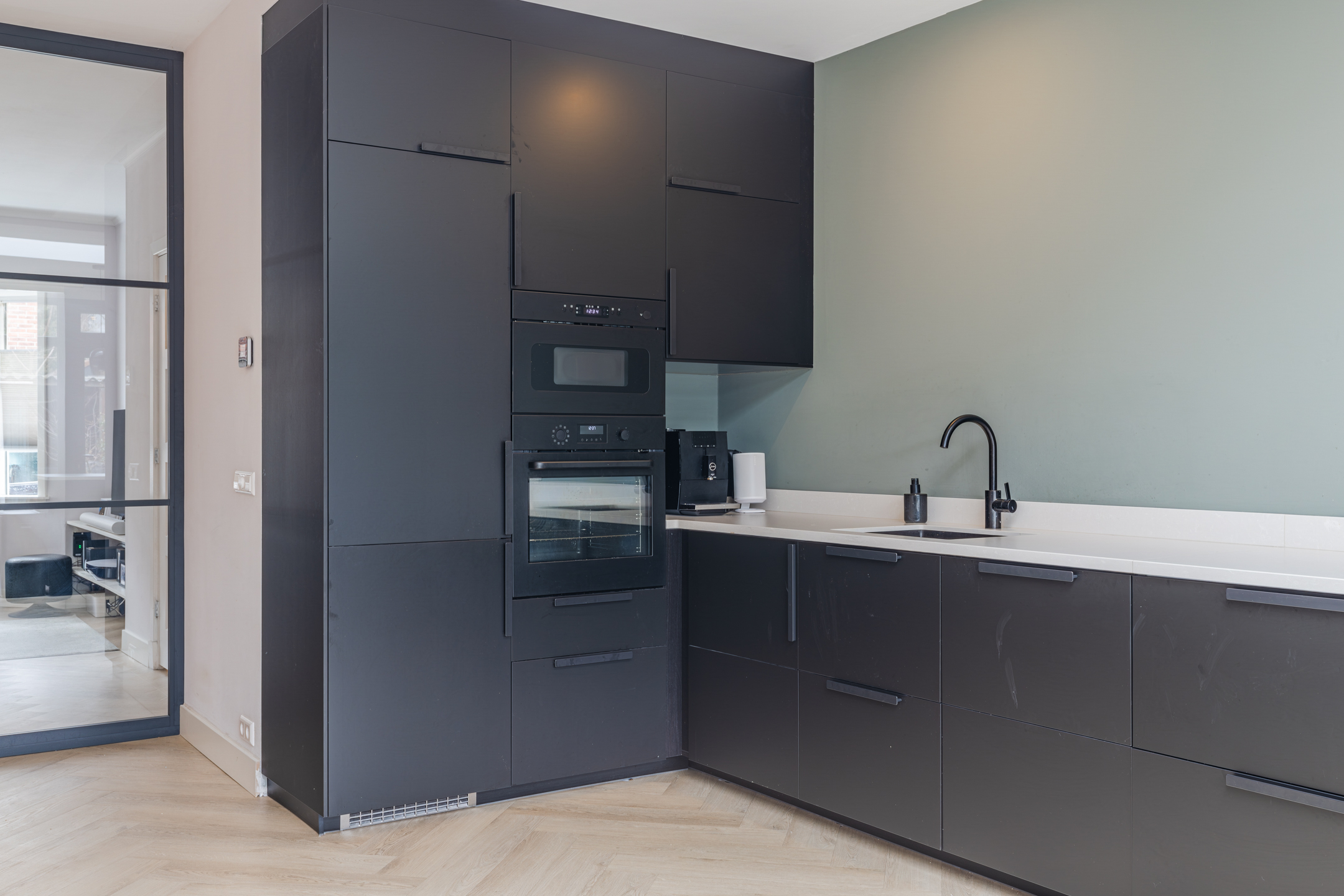 De open keuken (vernieuwd medio 2024) is geplaatst in een royale L-opstelling met schiereiland en apparatenwandkast. De keuken is uitgevoerd in een strakke, luxe zwarte kleurstelling met een wit werkblad en beschikt over alle wenselijke inbouwapparatuur, zoals een inductiekookplaat met geïntegreerde afzuigkap, een oven, een magnetron, een koel-/vriescombinatie en een vaatwasser.