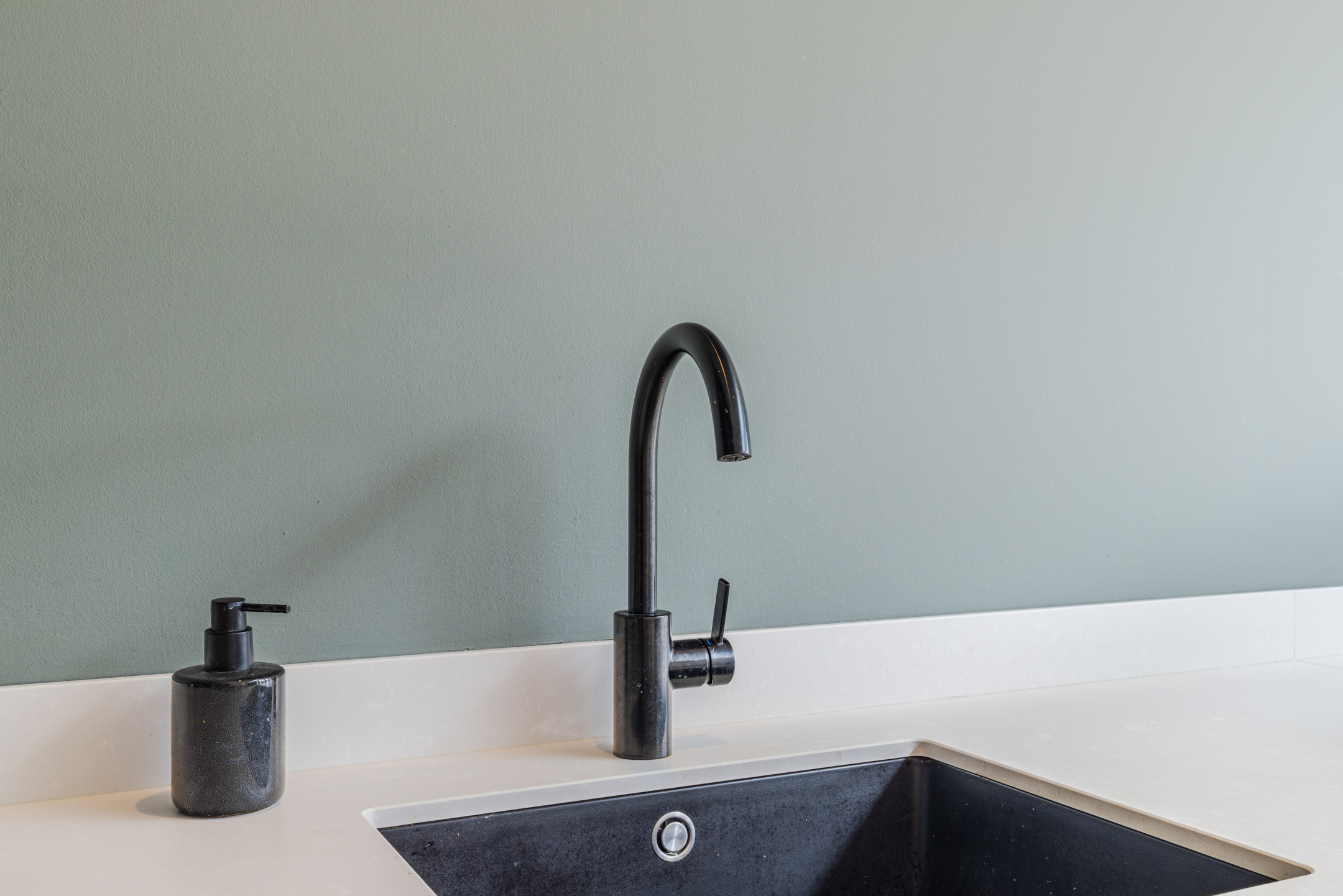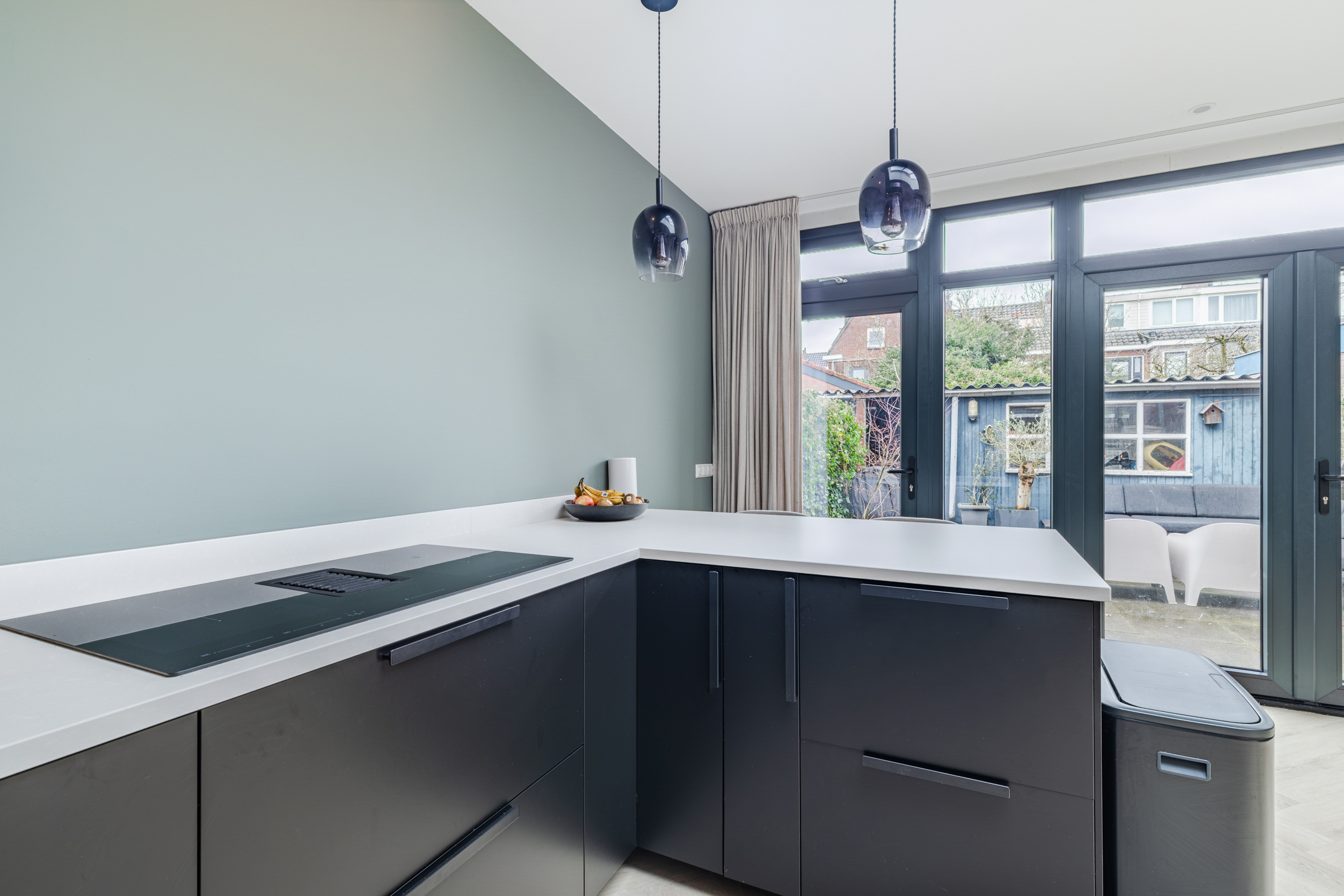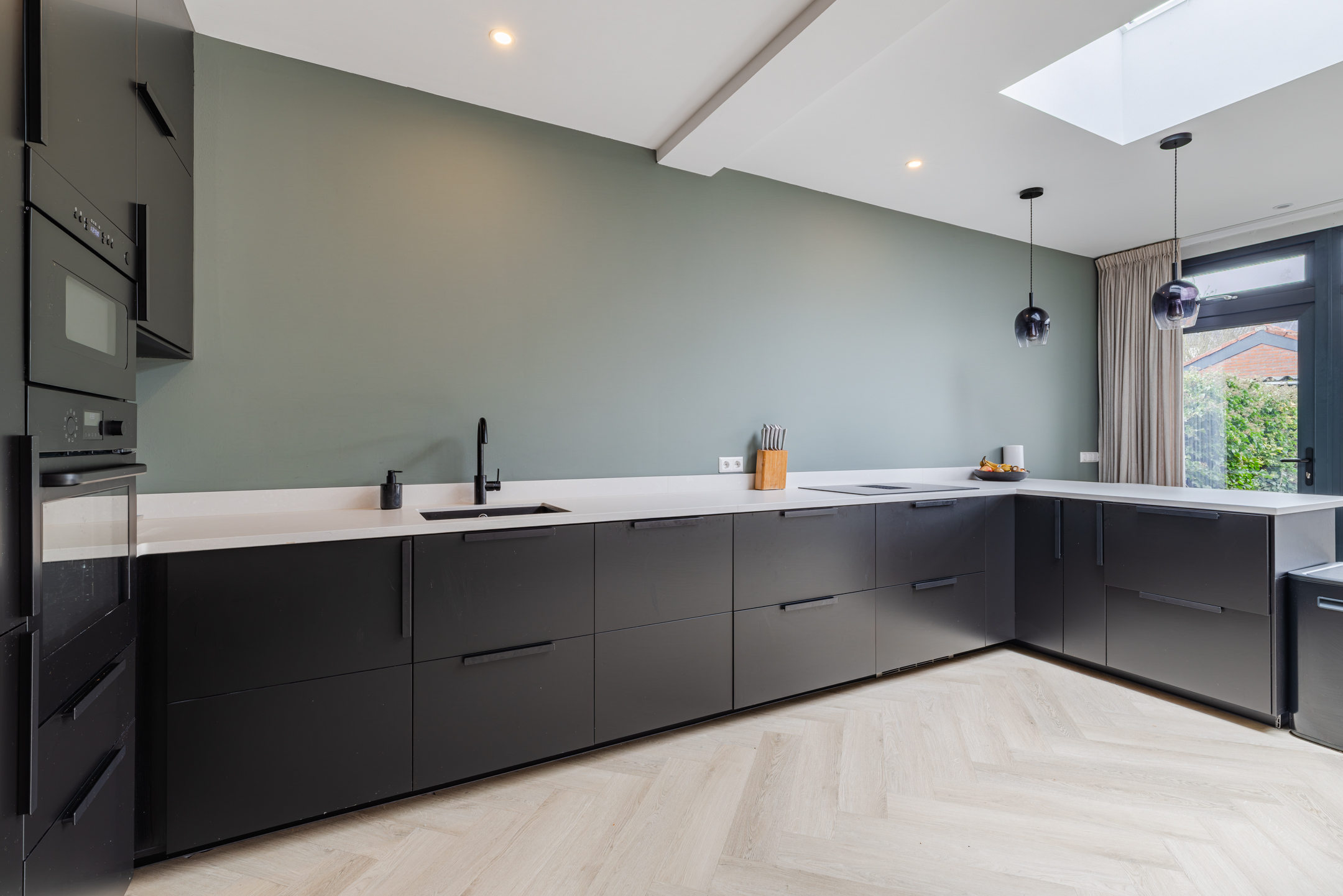 De open keuken (vernieuwd medio 2024) is geplaatst in een royale L-opstelling met schiereiland en apparatenwandkast. De keuken is uitgevoerd in een strakke, luxe zwarte kleurstelling met een wit werkblad en beschikt over alle wenselijke inbouwapparatuur, zoals een inductiekookplaat met geïntegreerde afzuigkap, een oven, een magnetron, een koel-/vriescombinatie en een vaatwasser.