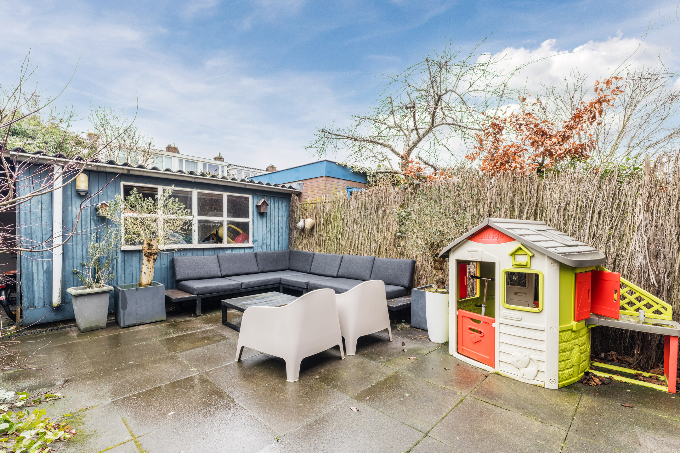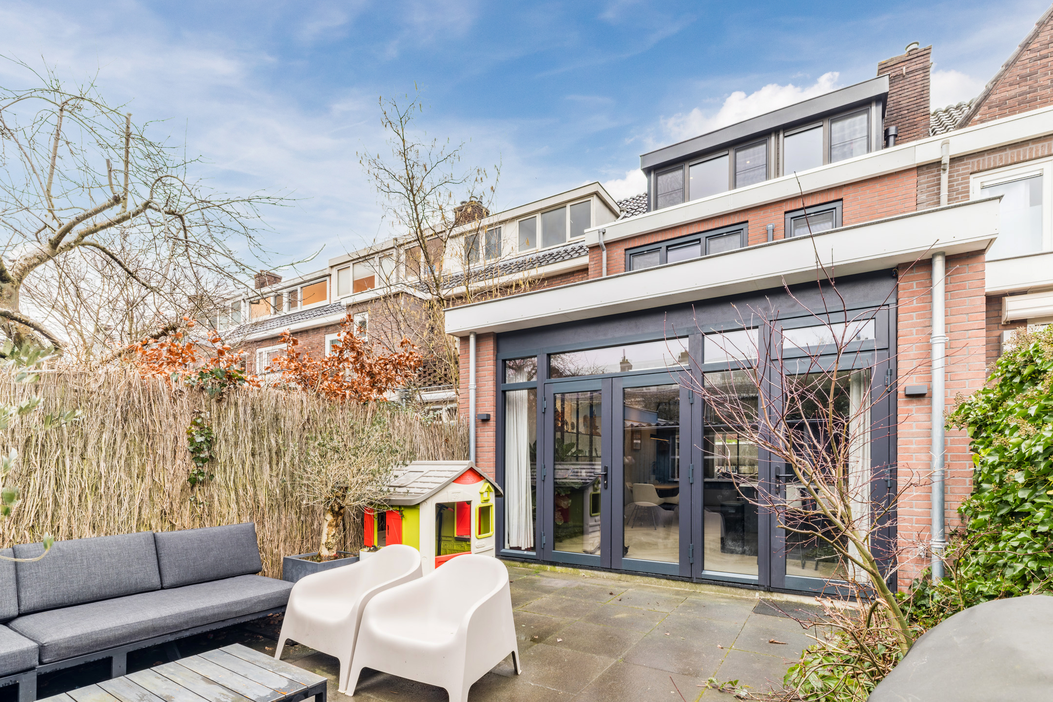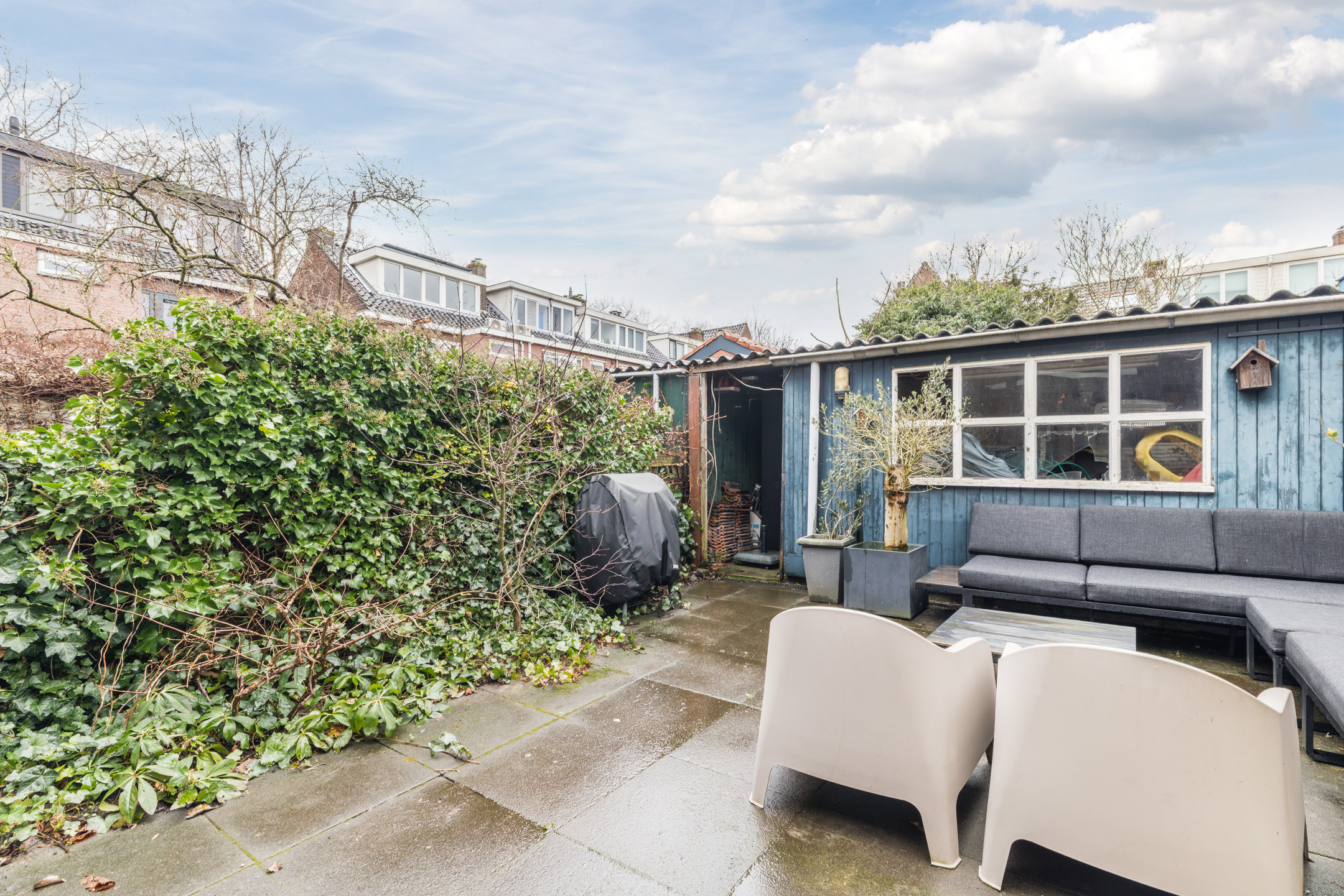 De achtertuin is gelegen op het noordwesten en is bereikbaar via openslaande deuren en een loopdeur. De tuin is een aangename buitenruimte met ruimte voor zowel zon als schaduw. Met een vrijstaande houten berging achterin en een handige achterom is het geheel bovendien praktisch ingericht. Een fijne plek om te ontspannen of gezellig te tafelen.