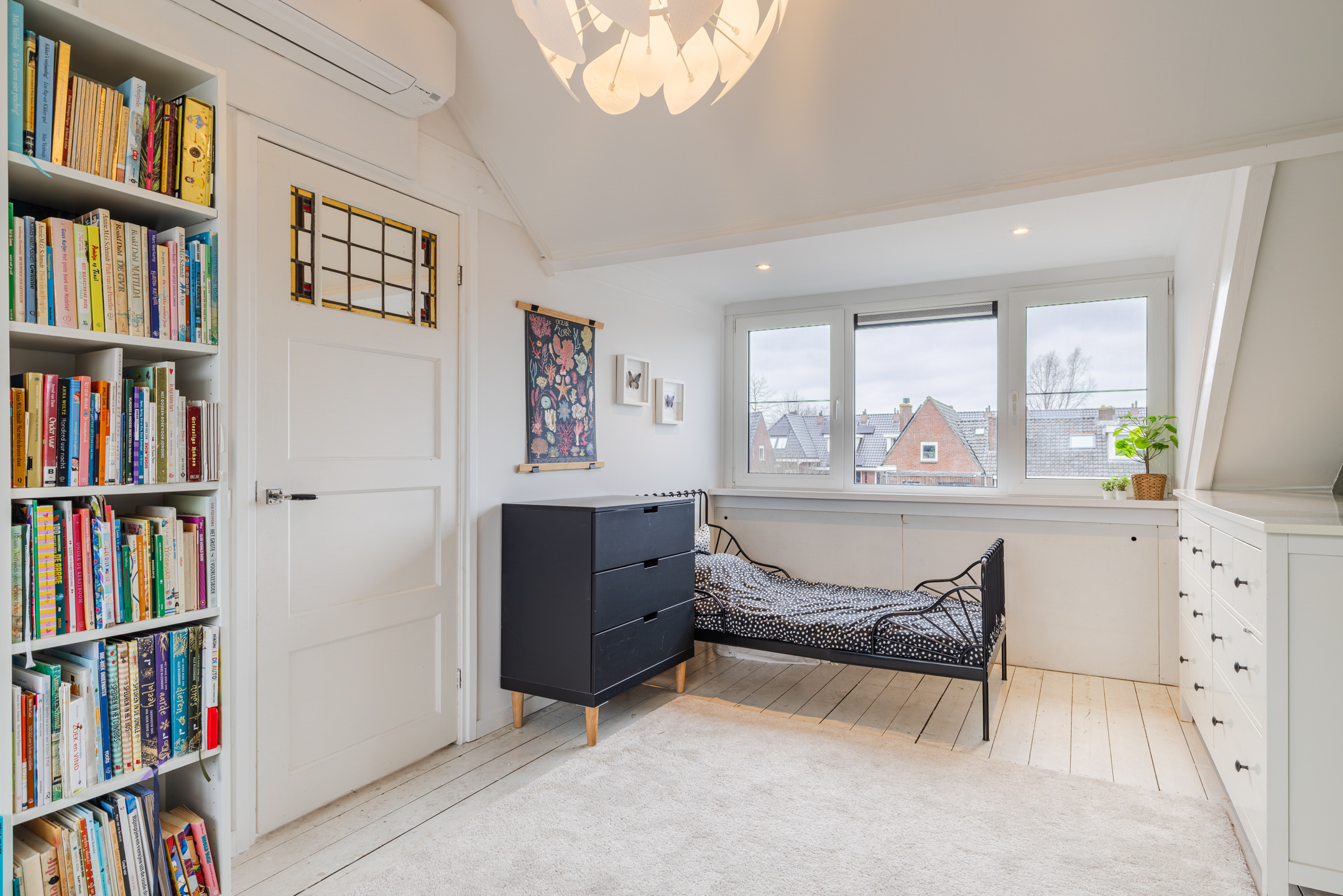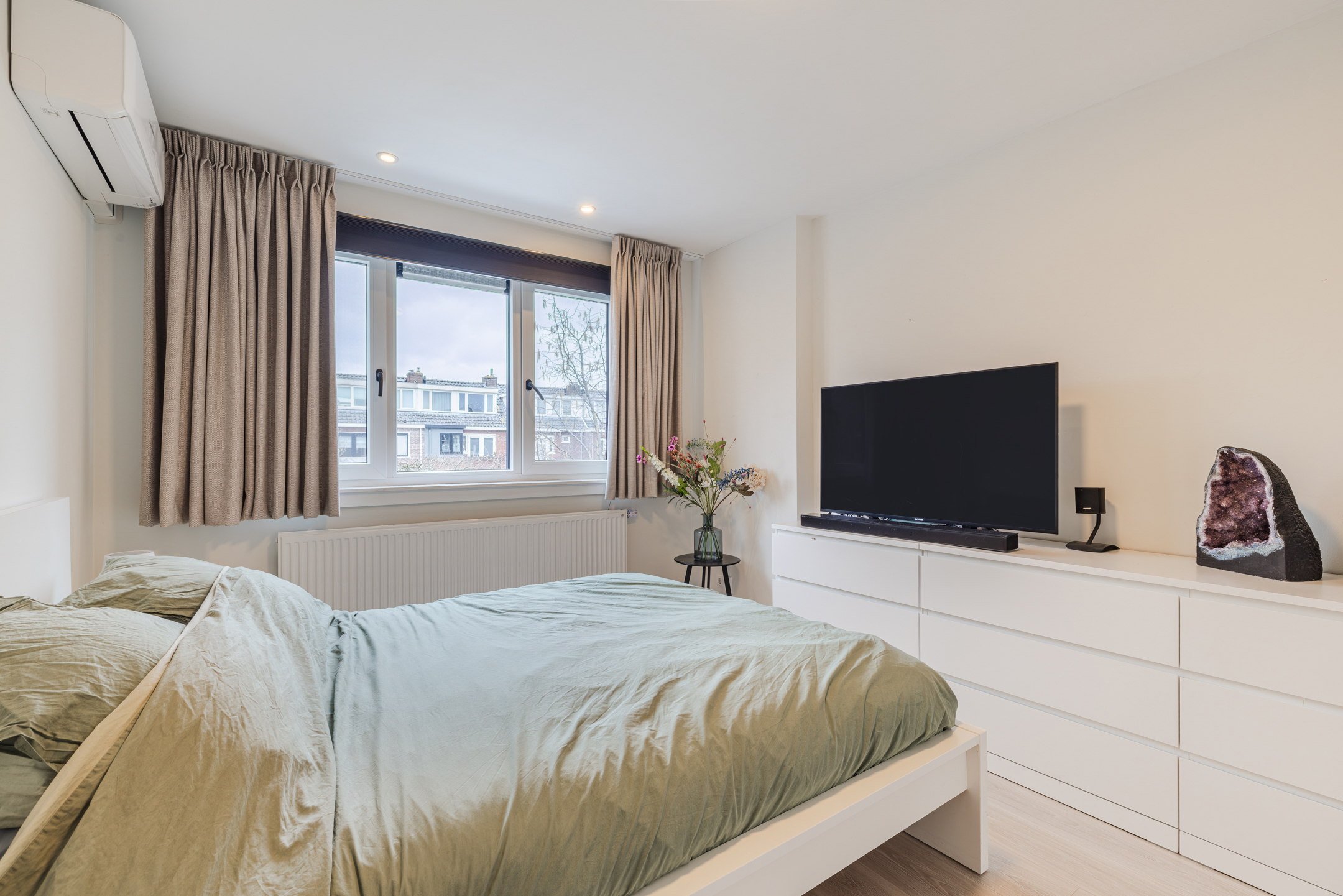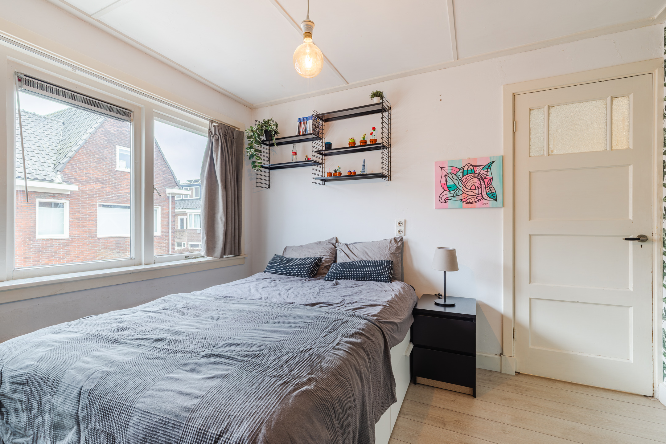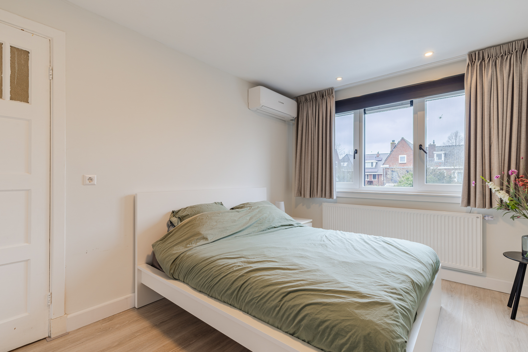 De slaapkamer is gelegen over de gehele diepte van de woning. Dankzij de twee dakkapellen, één aan de voorzijde (geplaatst medio 2024) en één aan de achterzijde van de woning, ontstaat hier een prettige en lichte ruimte. Beide dakkapellen zijn voorzien van kunststof kozijnen en elektrische rolluiken.