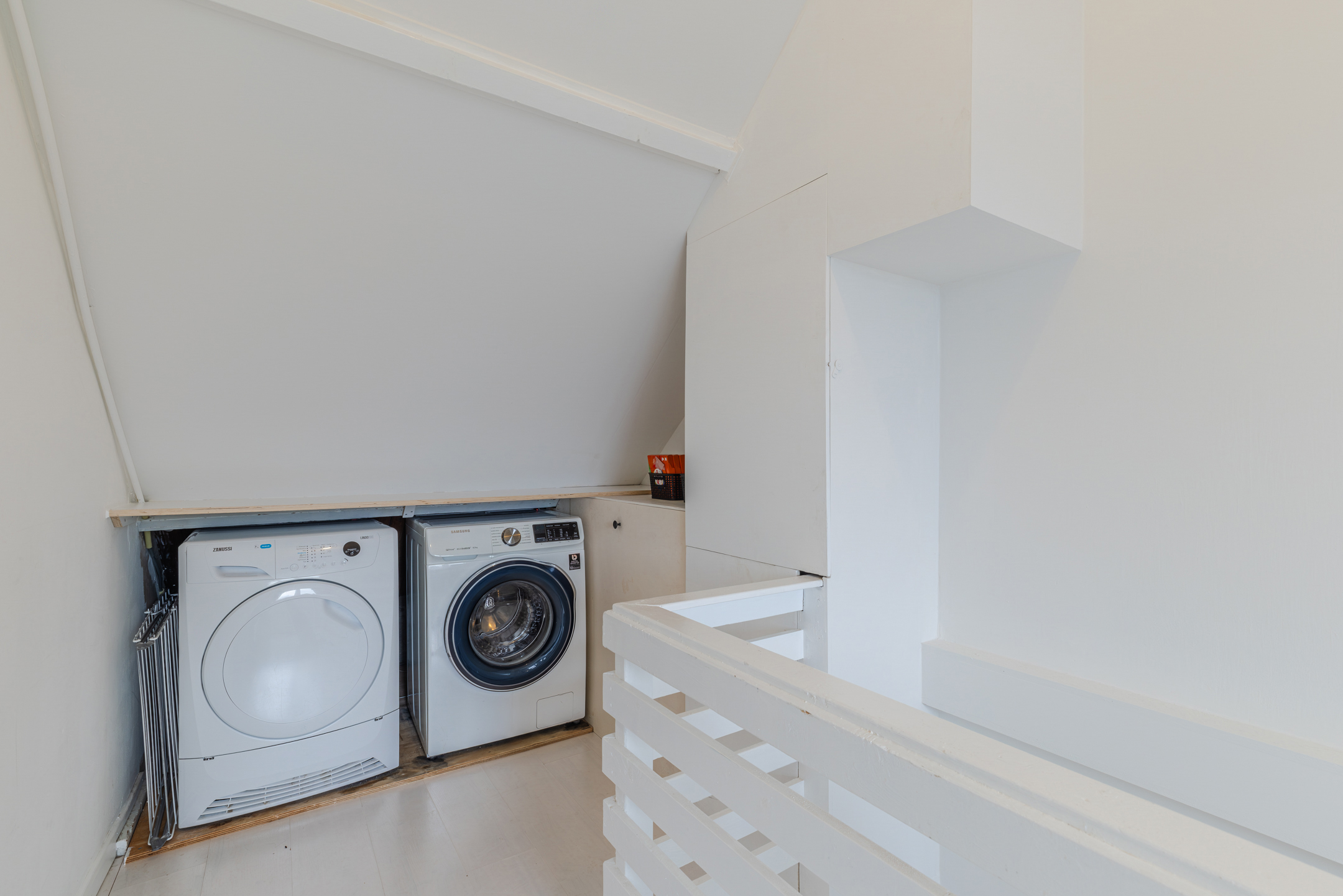 Overloop met opstelplaats voor de wasmachine, droger en CV- installatie, toegang tot een riante multifunctionele (slaap)kamer.