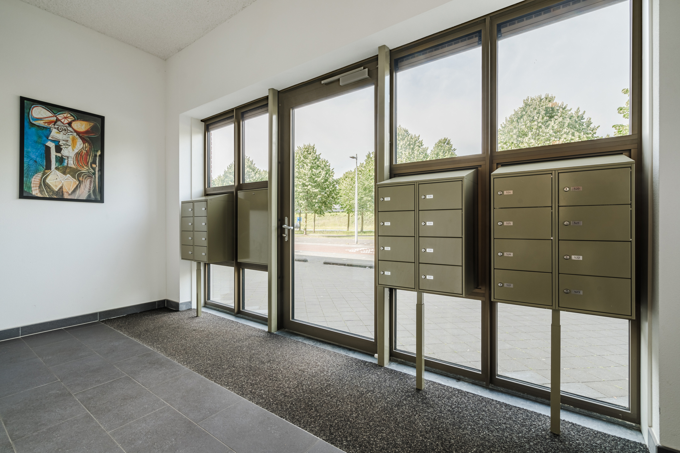 Begane grond: royale, frisse centrale entree met intercom en toegang tot de lift, het trappenhuis en de brievenbussen. Verder beschikt het appartement over een eigen overdekte parkeerplek gelegen op een afgesloten terrein aan de achterzijde van het gebouw en een eigen berging (ca. 5,8m2). Indien gewenst kun je een laadpaal plaatsen voor de elektrische auto.