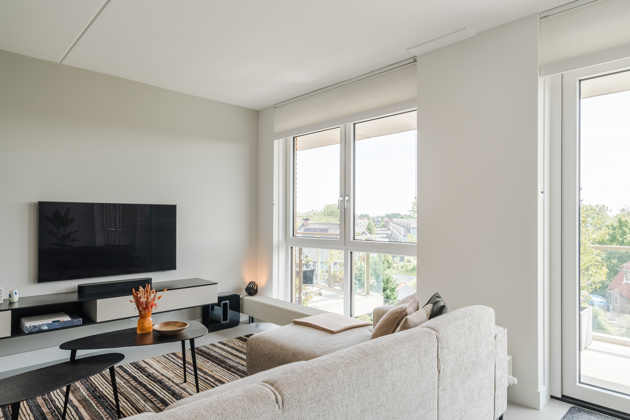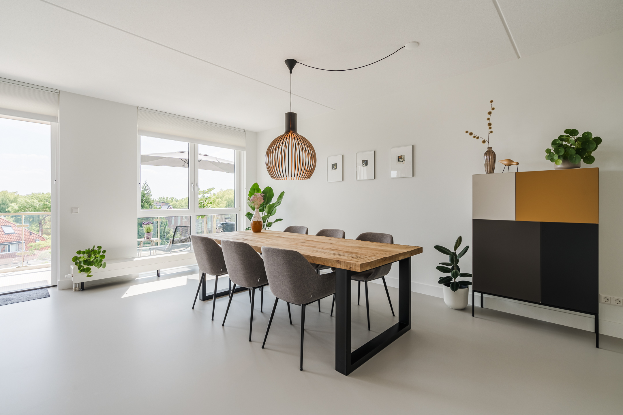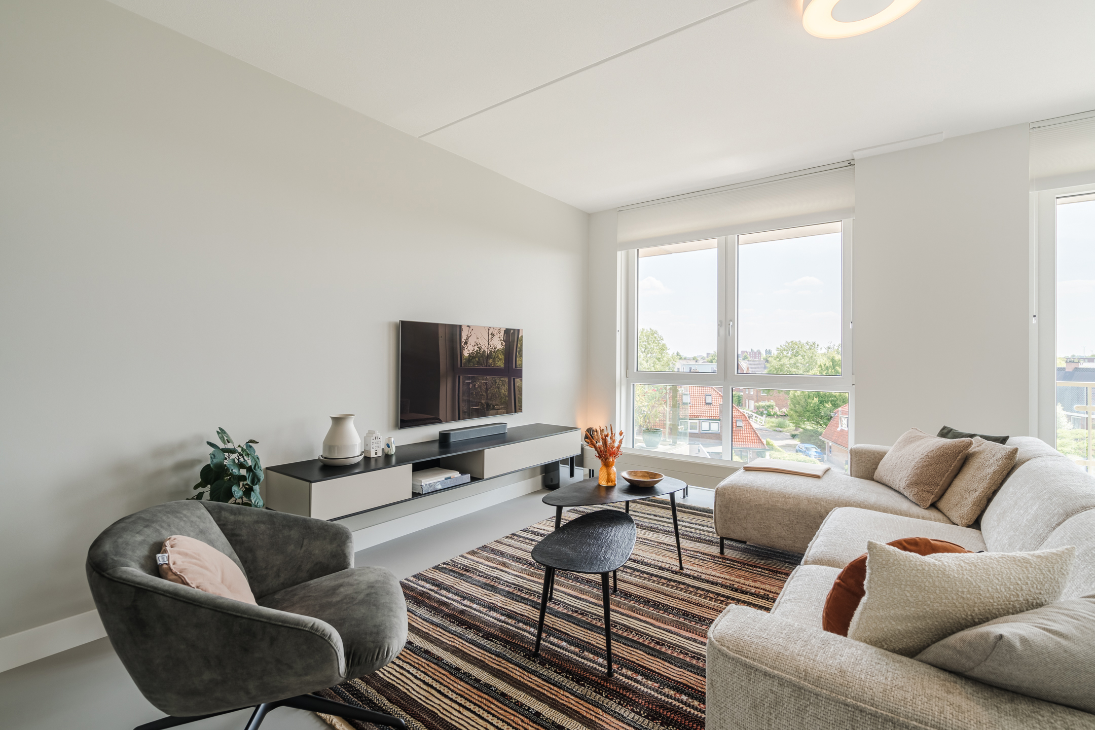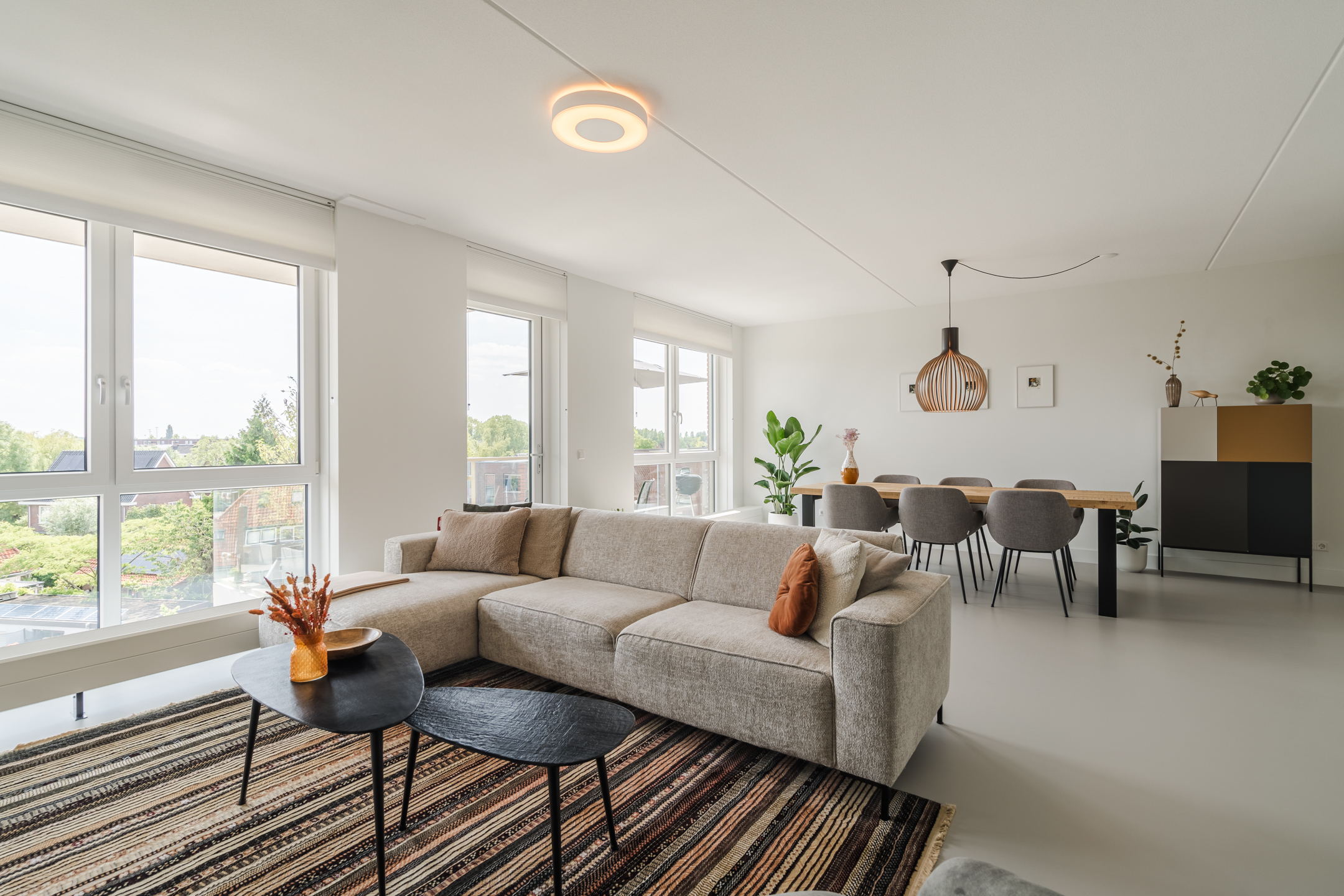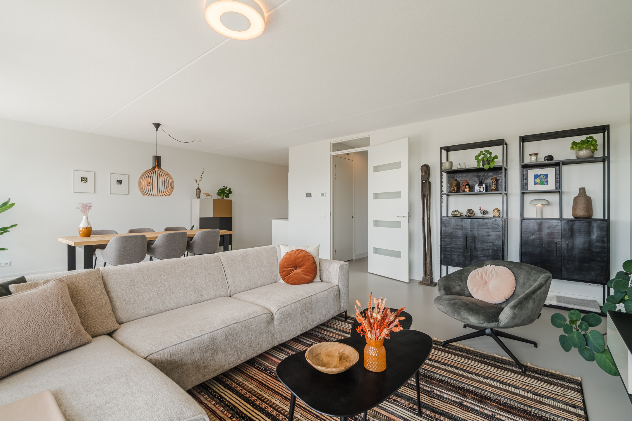 De ruime woonkamer gericht op het zuiden is heerlijk licht door de grote raampartijen en beschikt over directe toegang tot het zonovergoten balkon. Naast een ruime zithoek is er nog voldoende ruimte voor het plaatsen van een grote eettafel. Een heerlijke plek voor gezellige etentjes met familie en vrienden, terwijl jullie kunnen genieten van het fijne uitzicht.