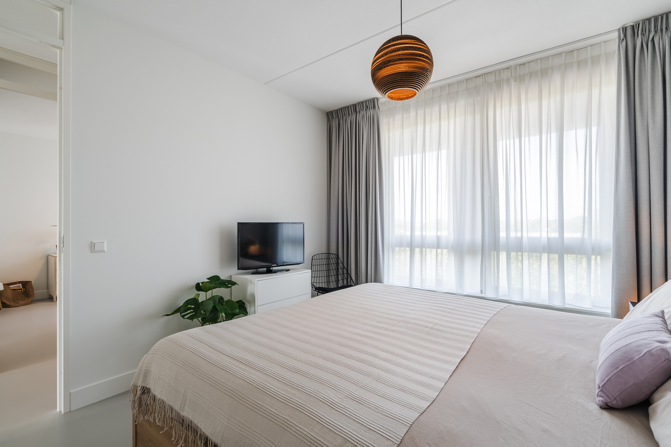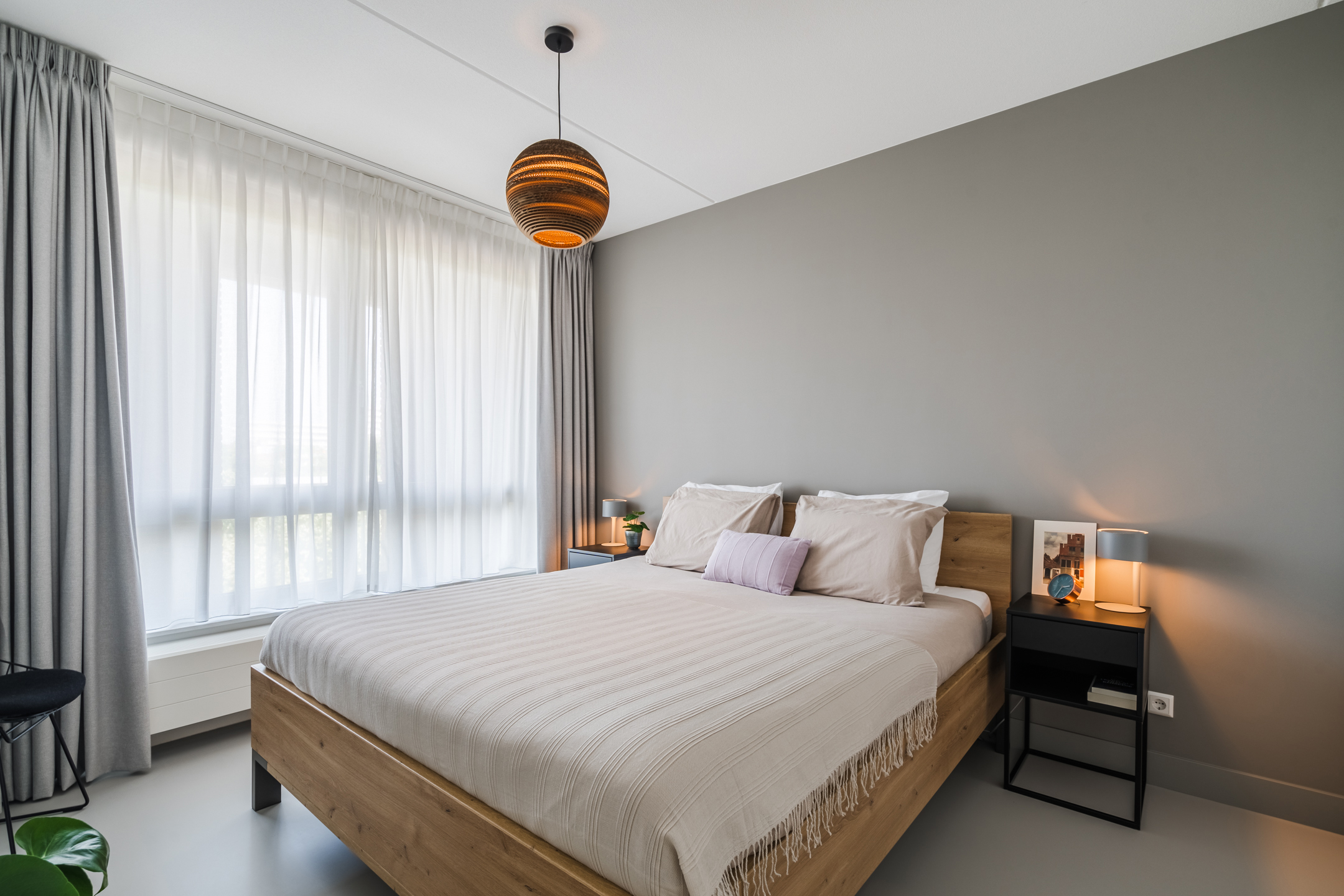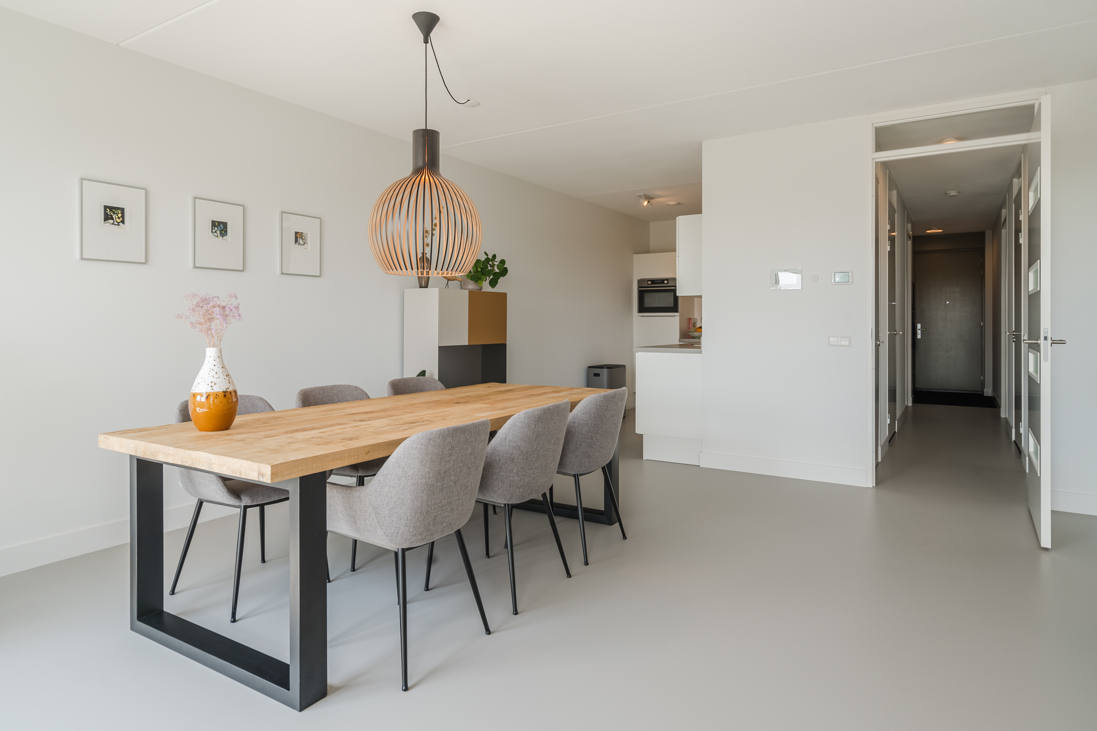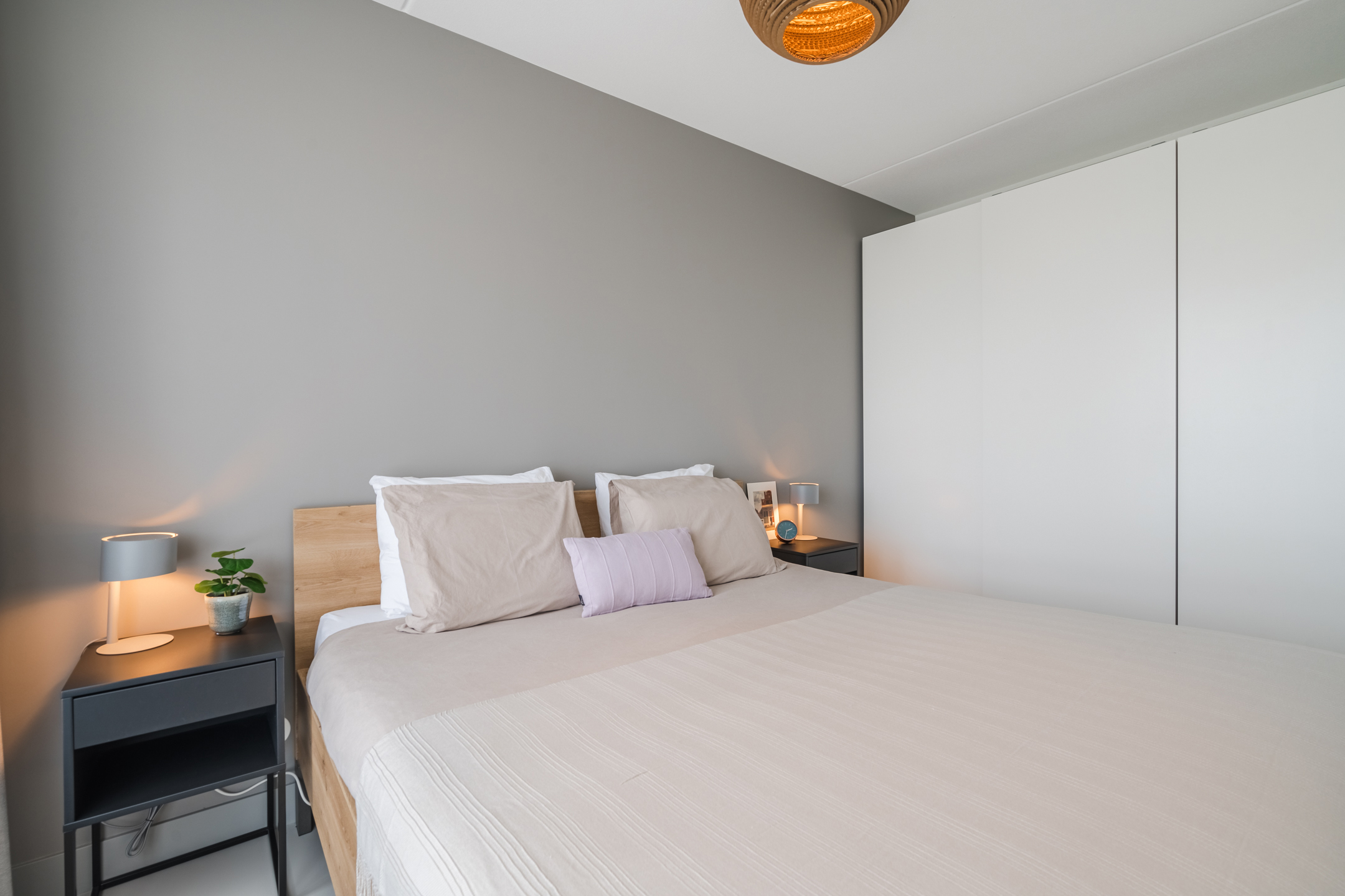 This home is characterized by its practical layout, two spacious (bed)rooms, the generous and light-filled living room, the modern and fully equipped kitchen with built-in appliances, the spacious bathroom, and the high-quality finish. Throughout the entire apartment, a beautiful poured floor in a light grey color has been chosen. Thanks to the use of light, natural tones and the large windows, the apartment is bathed in natural light.