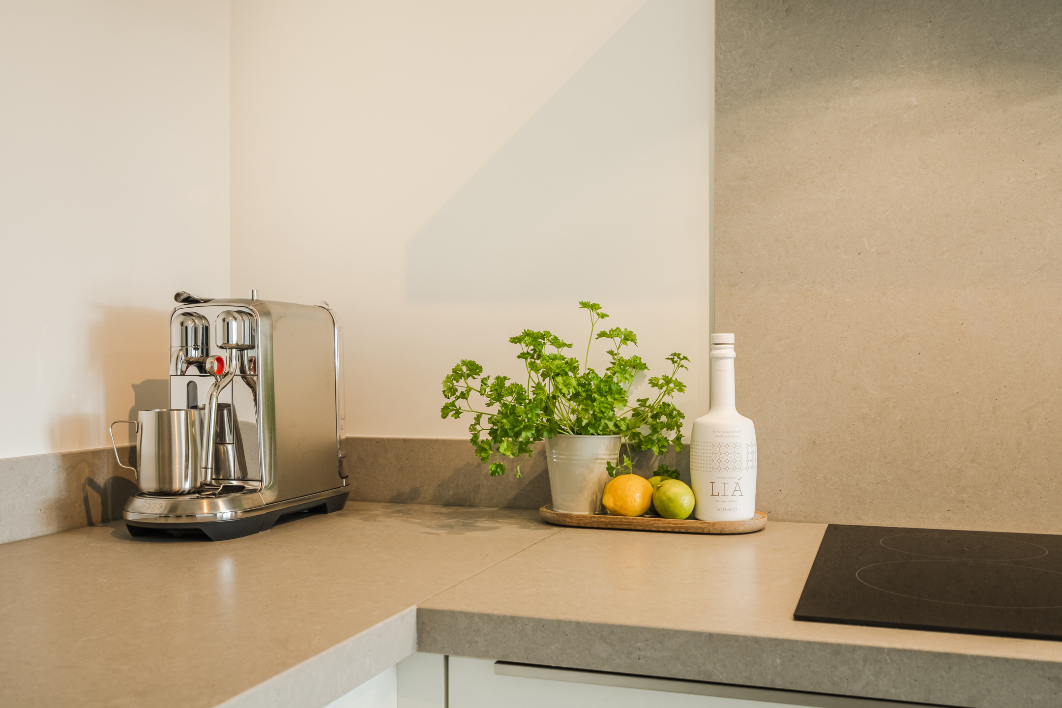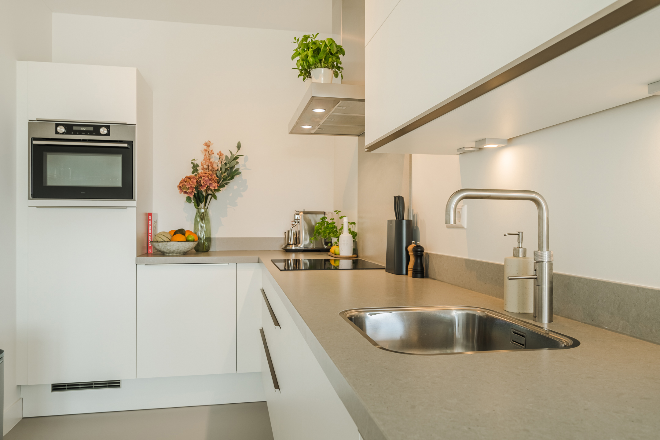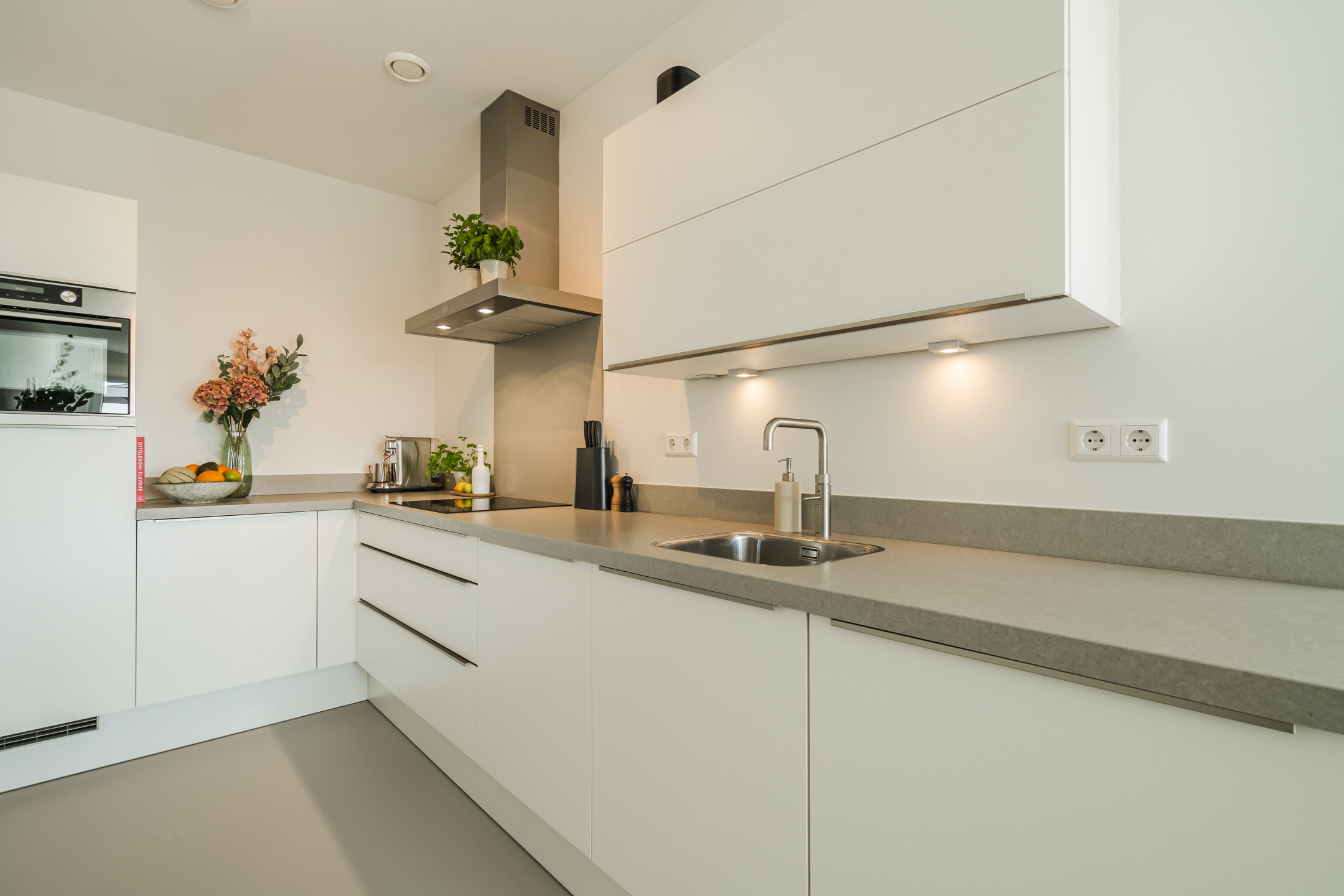 Bij de moderne en strak afgewerkte keuken is wederom gekozen voor lichte kleuren, waardoor het onderdeel is van het geheel. Het lichtgrijze, stenen werkblad geeft het een chique uitstraling. De keuken is voorzien van alle wenselijke inbouwapparatuur (koelkast, separate vriezer, combioven, inductiekookplaat met modern rvs-afzuigsysteem, vaatwasser en een Quooker).