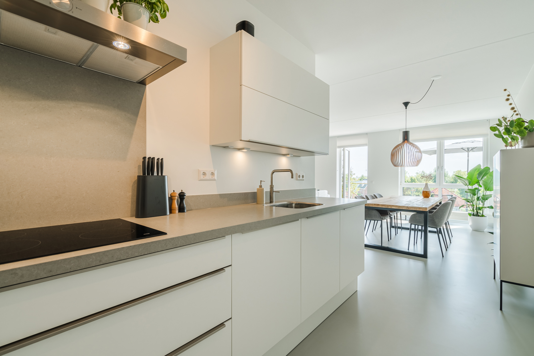 Het gehele appartement is voorzien van een mooie lichtgrijze gietvloer, hoge plinten en een strakke wandafwerking.