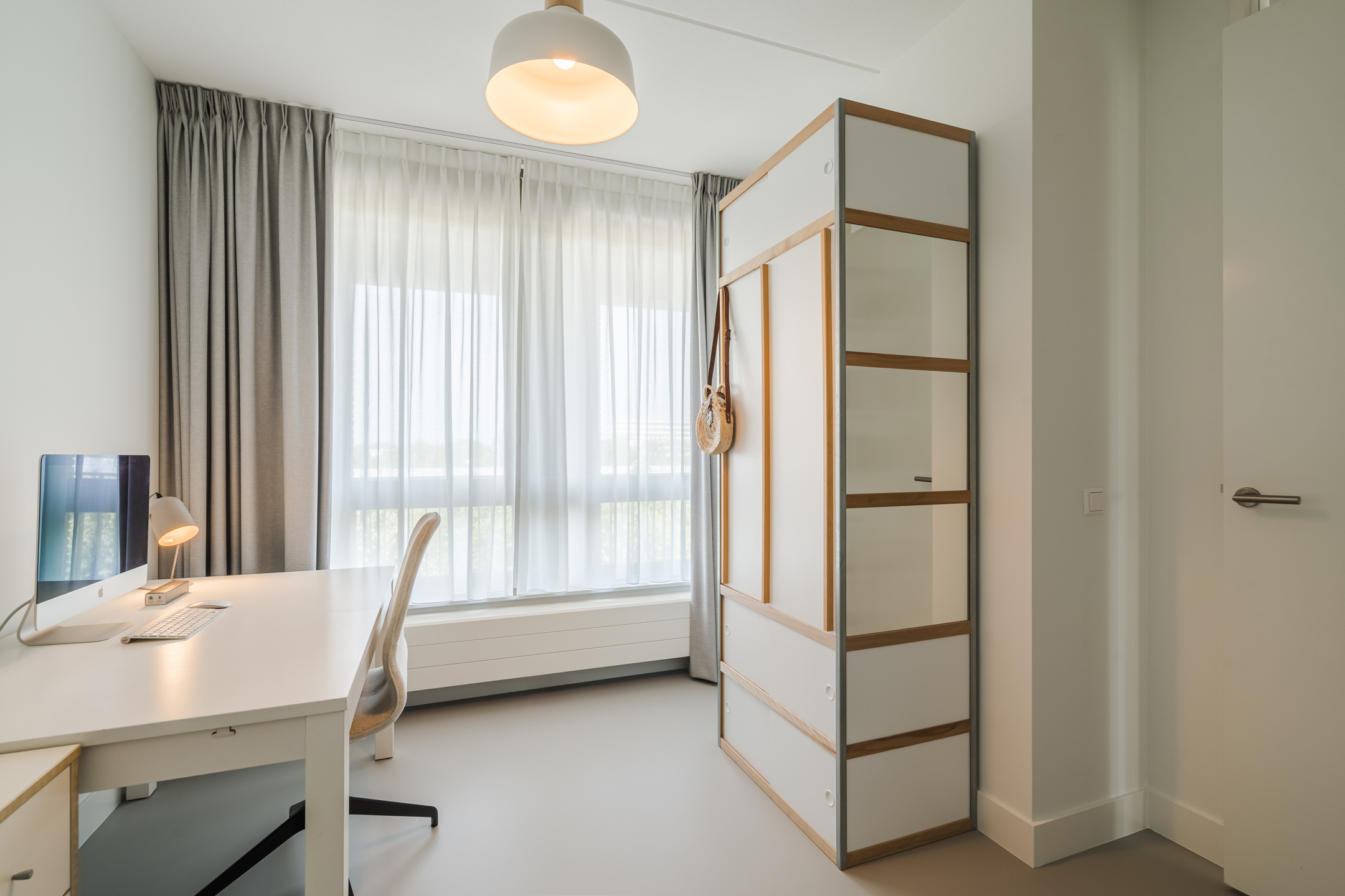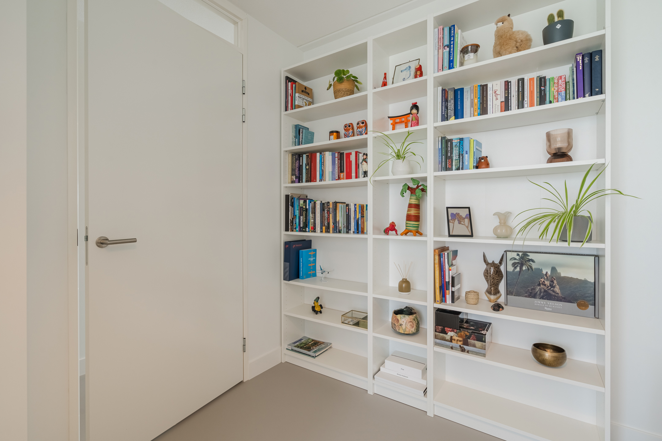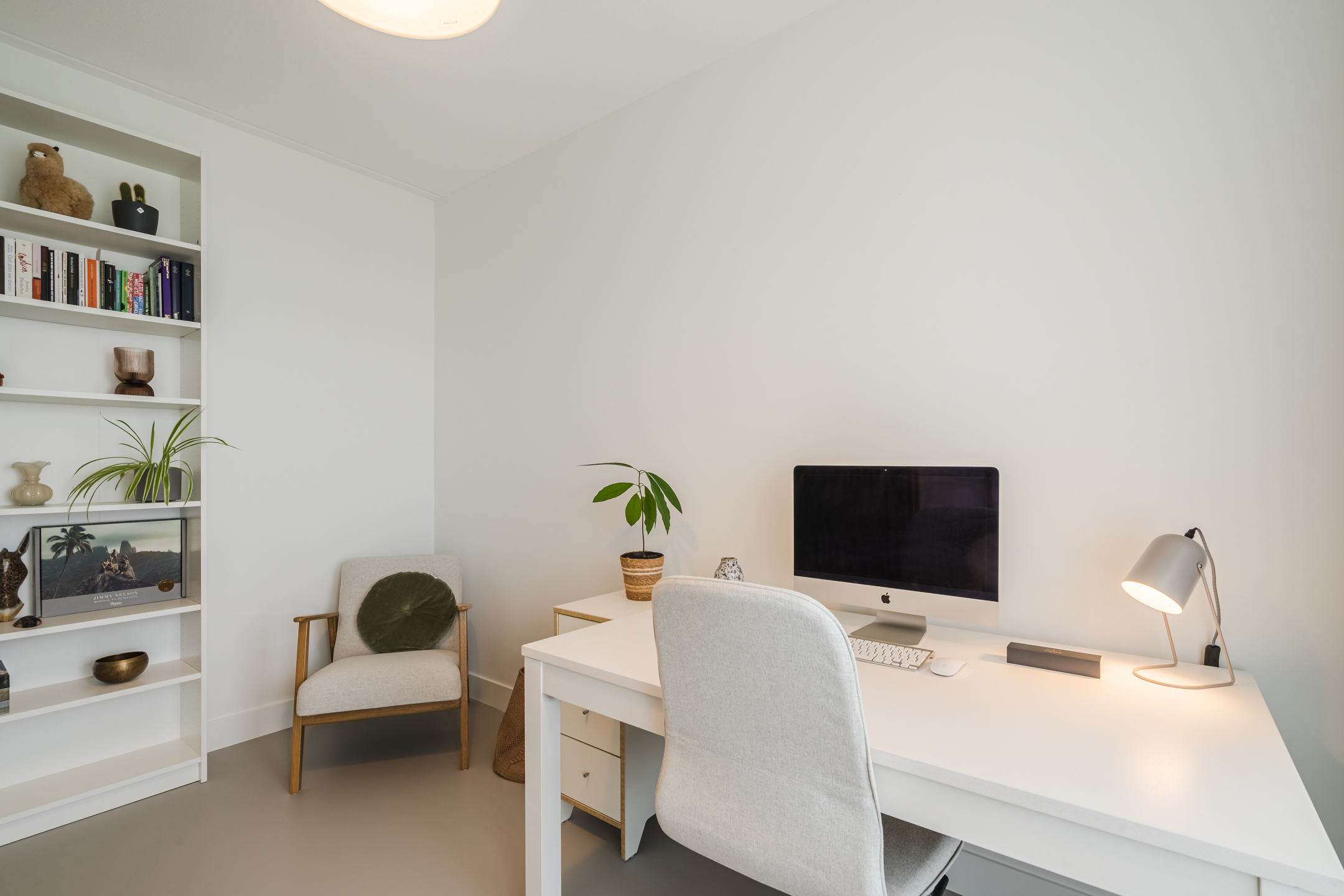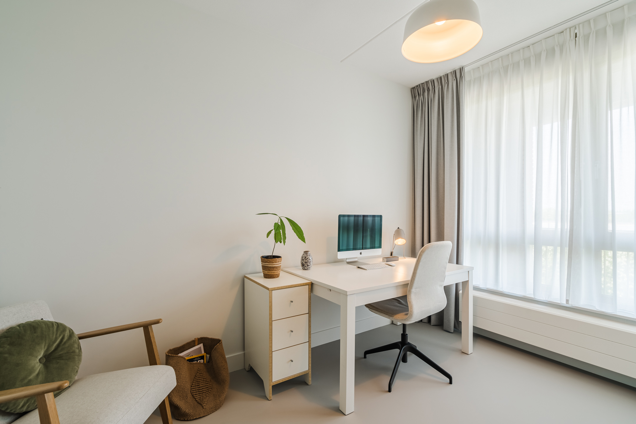 Aan de rechterkant bevindt zich de tweede kamer (ca. 11,5m2). Deze multifunctionele ruimte kan dienstdoen als extra slaapkamer, werkkamer of garderobekamer. Ook hier dragen de grote ramen bij aan veel lichtinval.