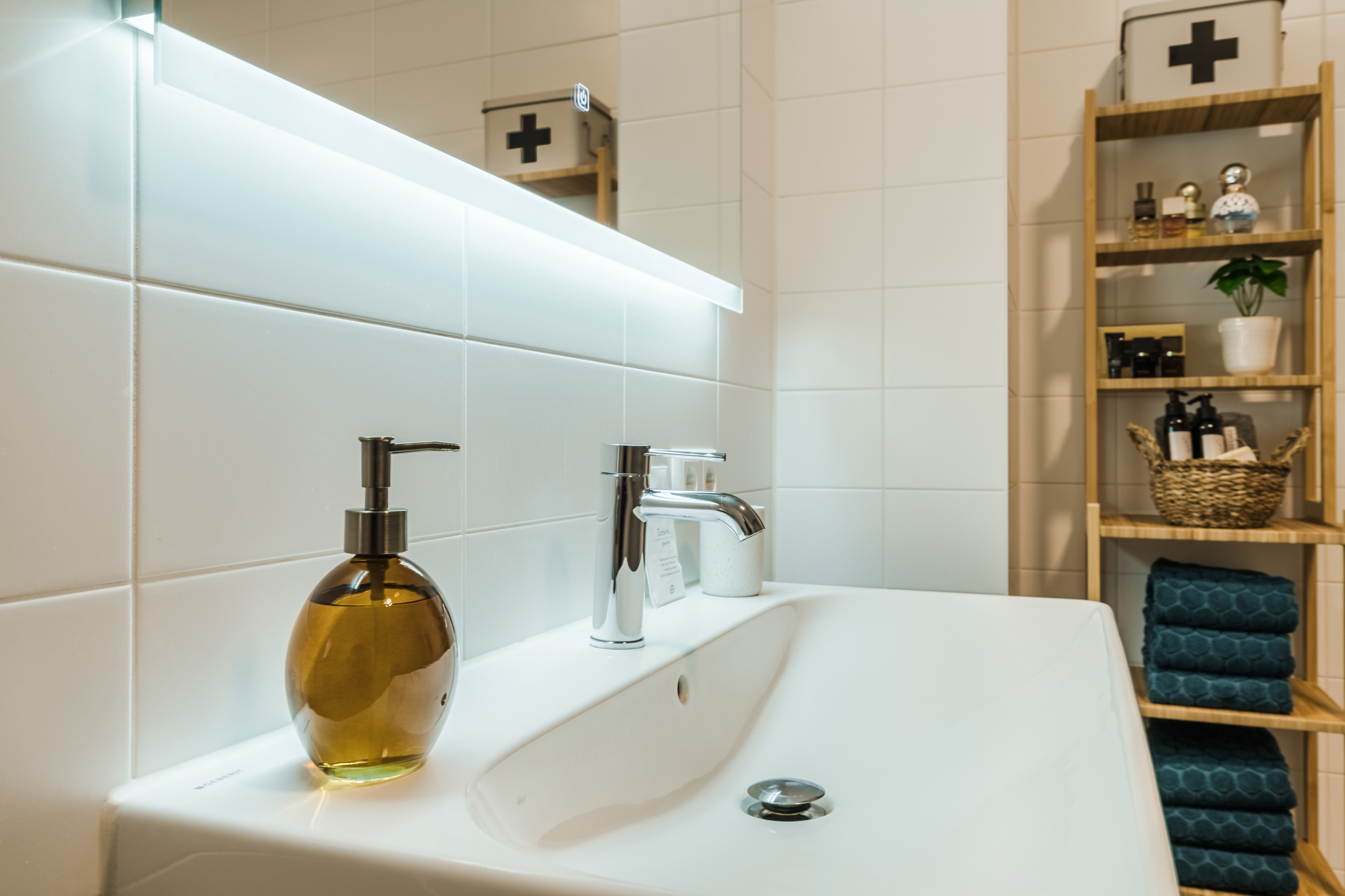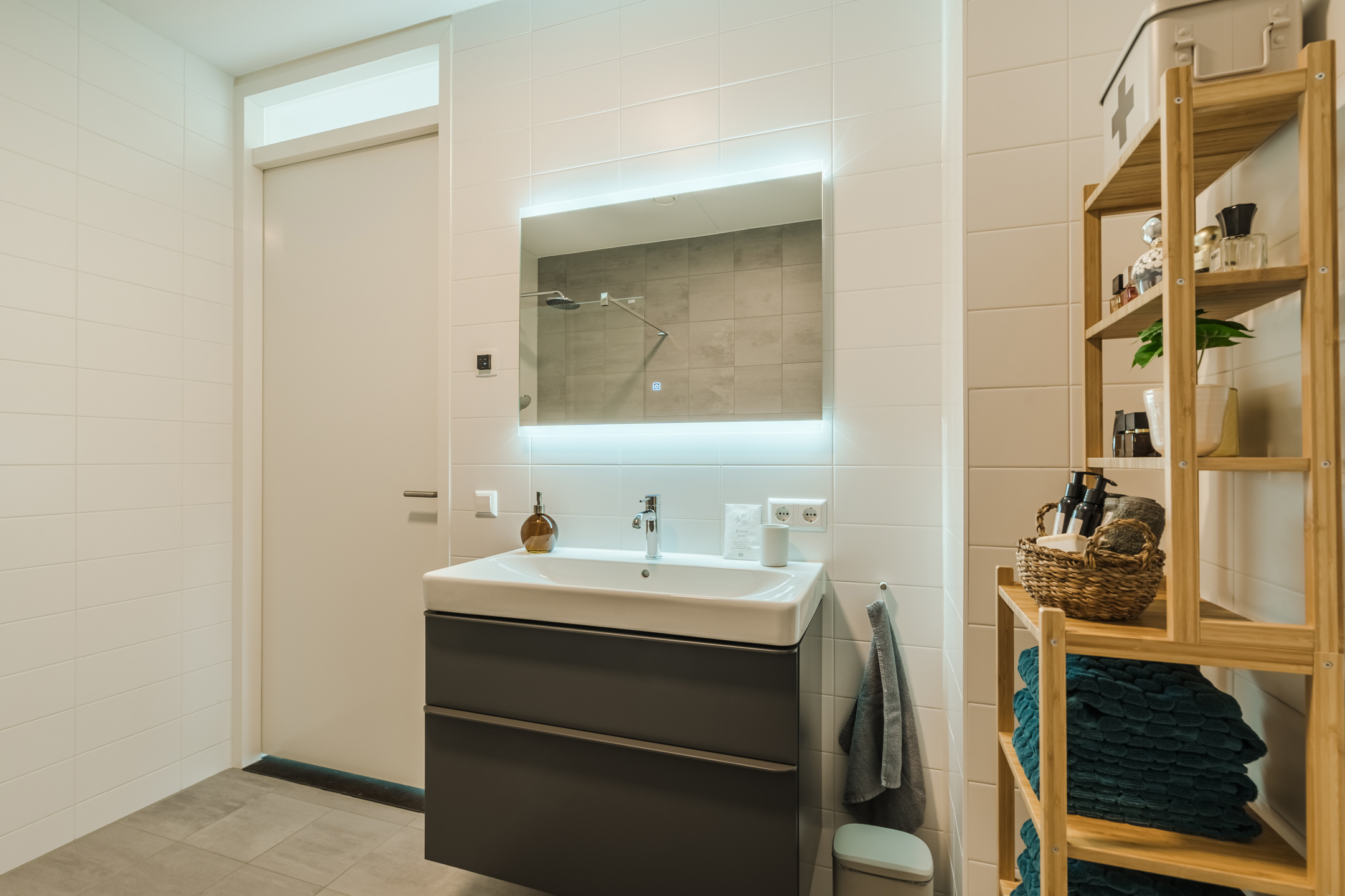 De inpandige badkamer is lekker ruim (ca. 6,1m2) en voorzien van een inloopdouche met regenfunctie, een modern wastafelmeubel met twee grote lades, inclusief verwarmde en verlichte spiegel, een handdoekradiator, mechanische ventilatie en ruimte voor het plaatsen van een extra kastje voor handdoeken en andere snuisterijen. Door de lichte kleurstelling voelt het heerlijk ruimtelijk aan; een fijne plek om lekker te ontspannen.