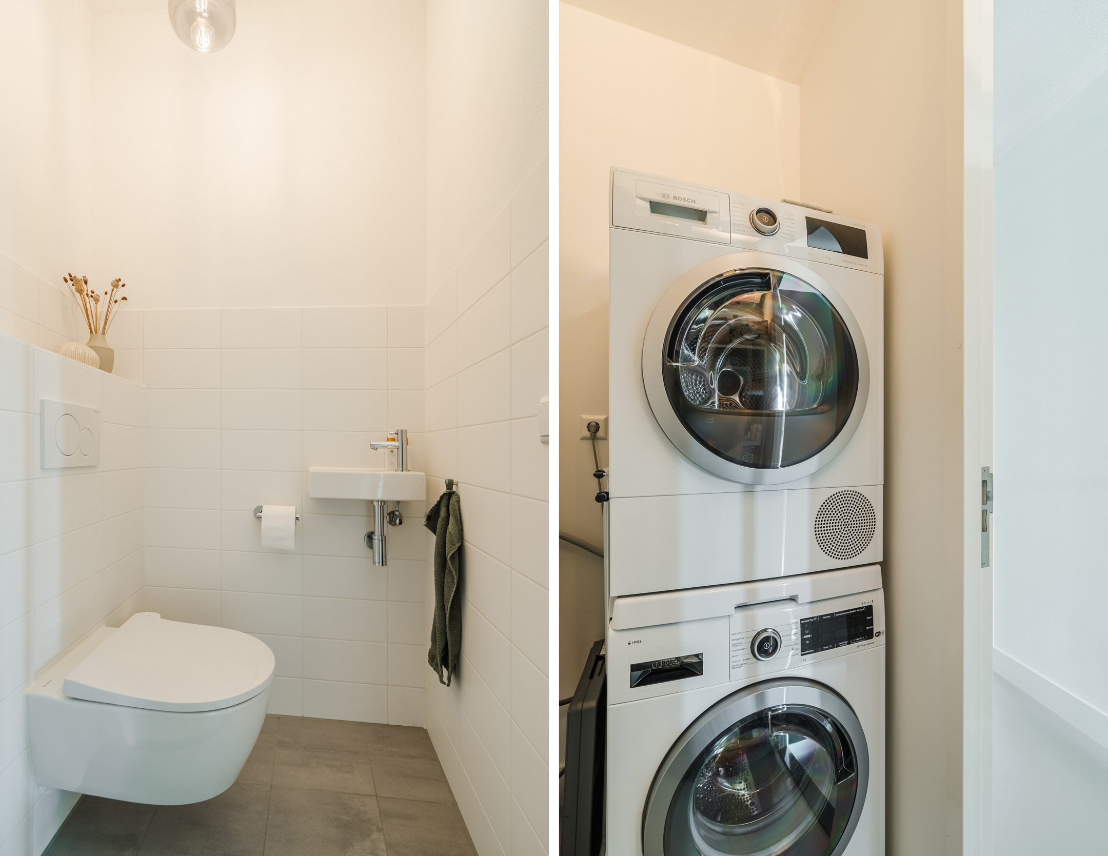 Vanuit de hal heb je toegang tot de ruime (slaap)kamers, de opbergruimte, de wasmachineruimte, de badkamer en de woonkamer met keuken. De moderne toiletruimte is voorzien van een hangend toilet en een design fonteintje.