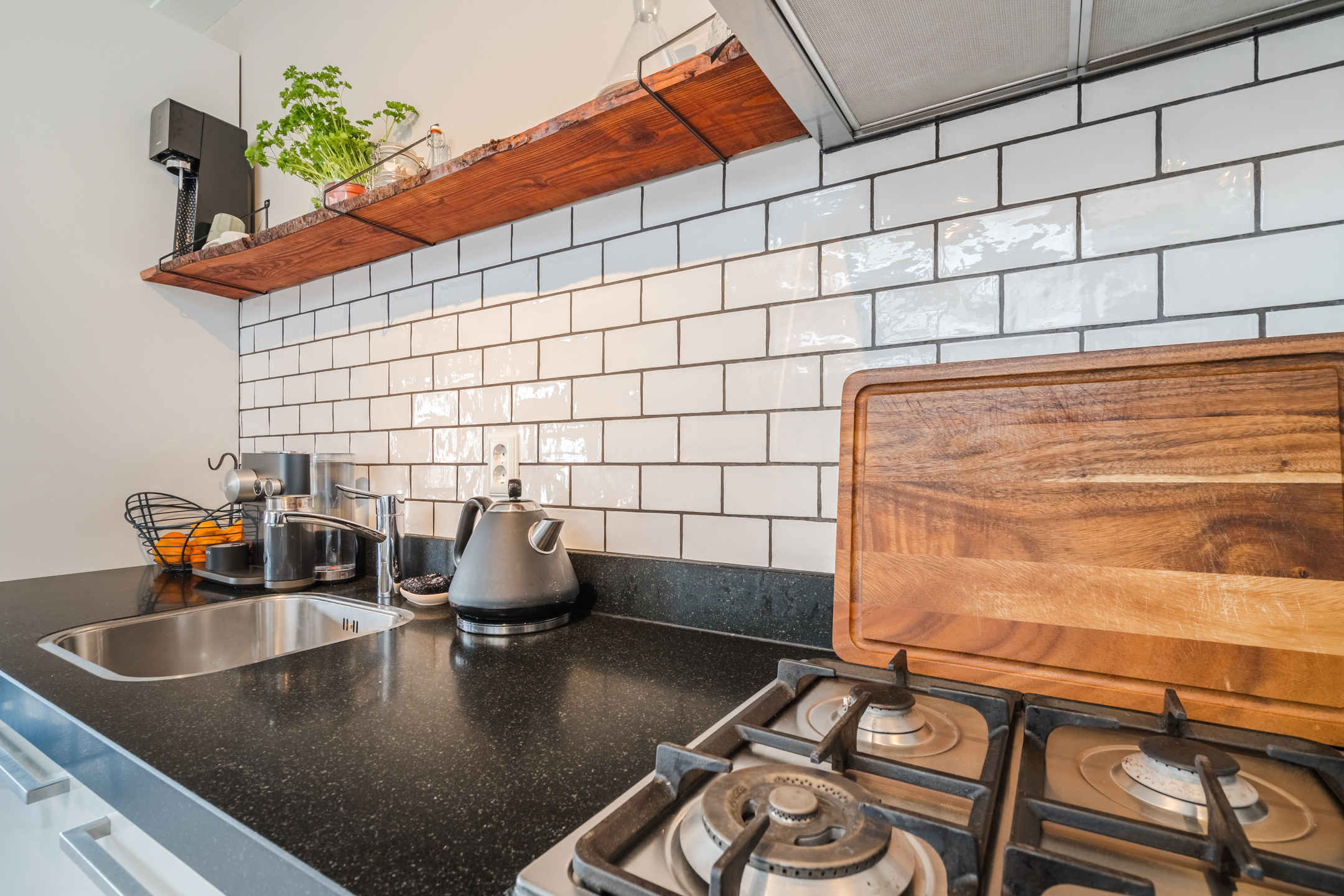 De open keuken (ca. 2.29 x 2.00m) is geplaatst in een rechte opstelling en is uitgevoerd in een neutrale witte kleurstelling. De keuken beschikt over een hoge voorraadskast en al het gewenste inbouwapparatuur: een 4-pits gaskookplaat, een rvs- afzuigkap, een koelkast, combi-oven en een vaatwasser.