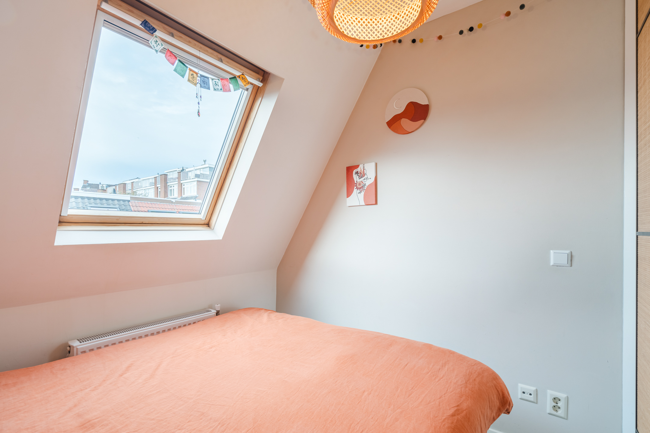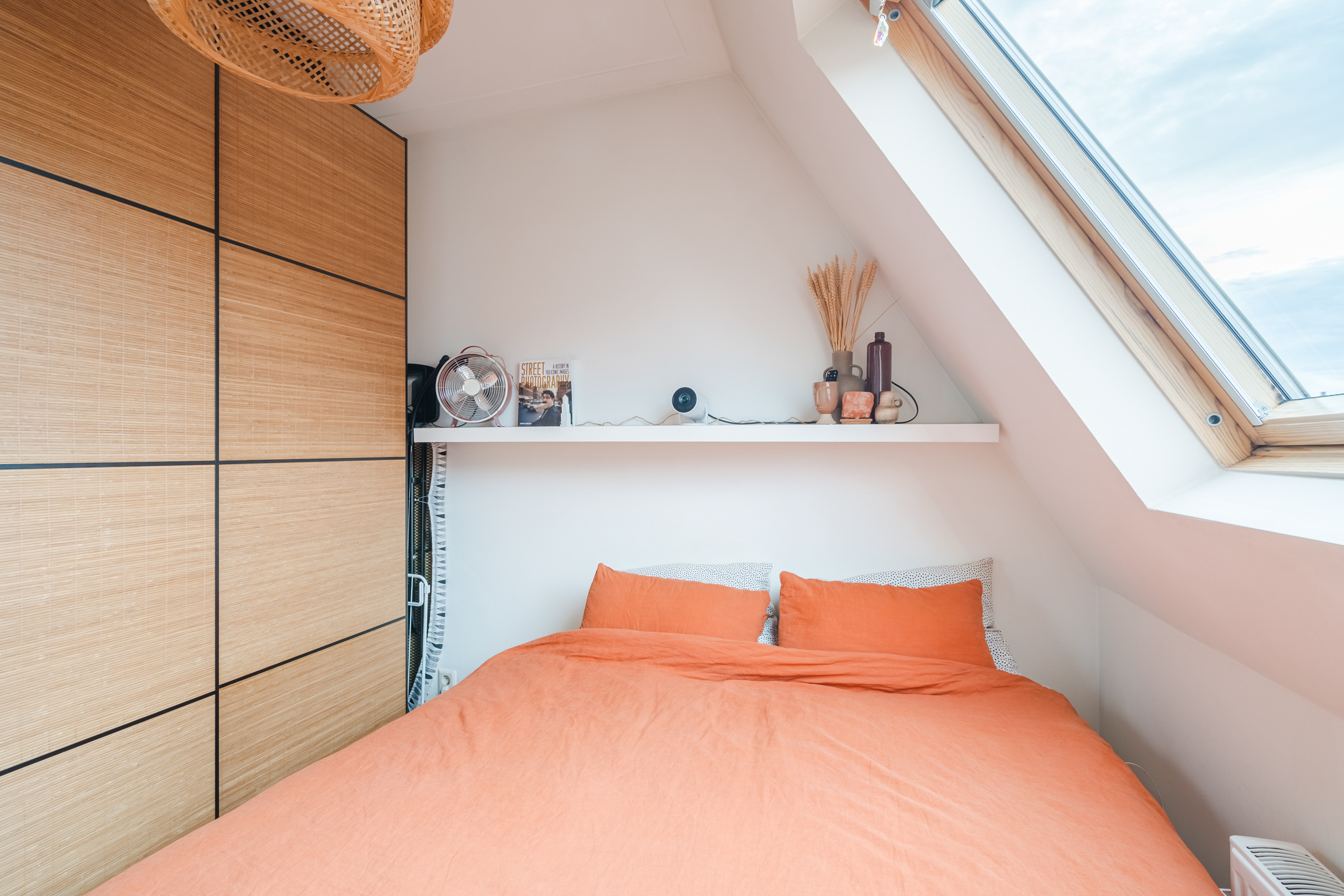 Aan de voorzijde van het appartement bevindt zich de slaapkamer (ca. 2.90 x 2.43m). Deze kamer biedt voldoende ruimte voor een tweepersoonsbed en een grote kledingkast. Het Velux-raam zorgt voor veel daglichtinval en natuurlijke ventilatie.