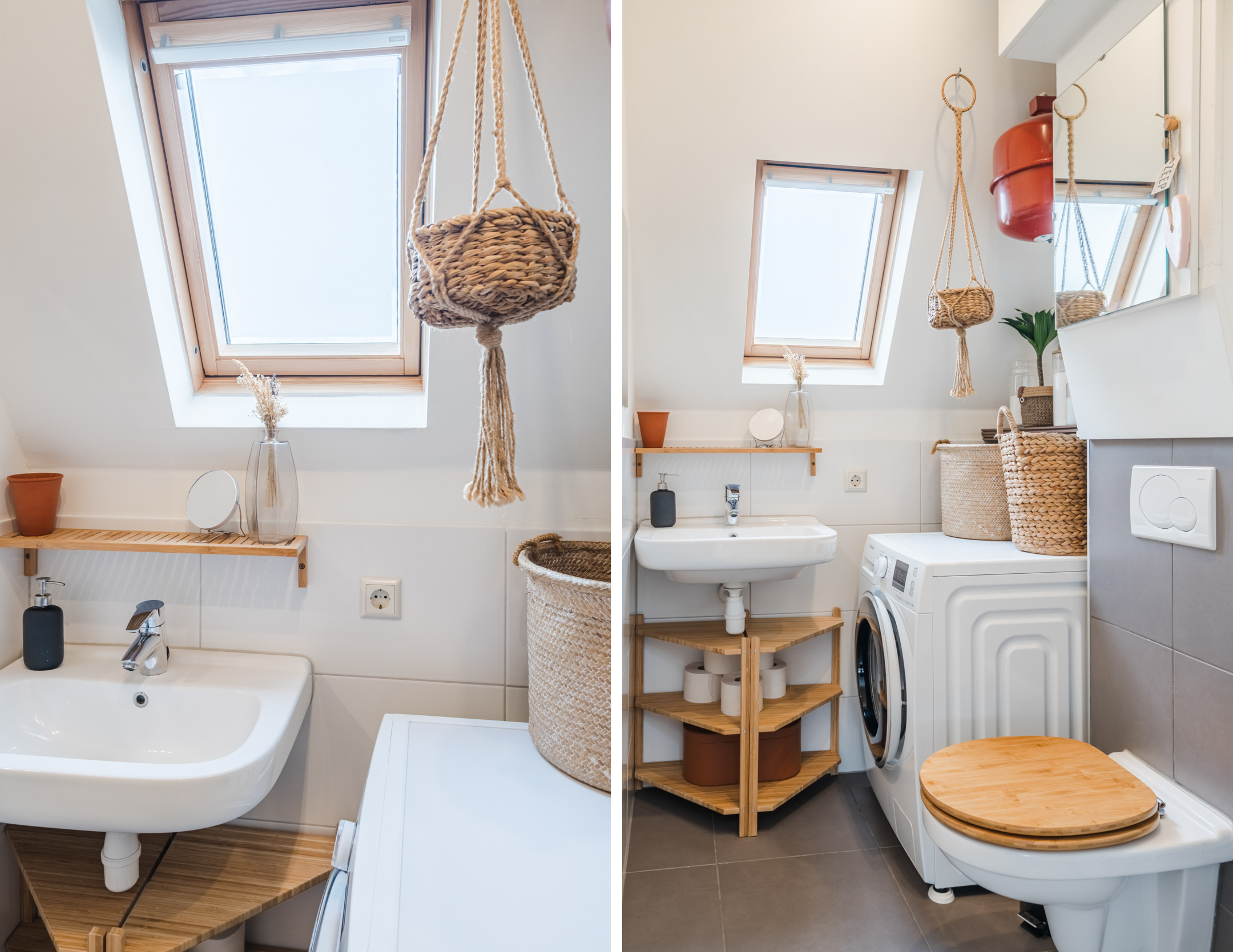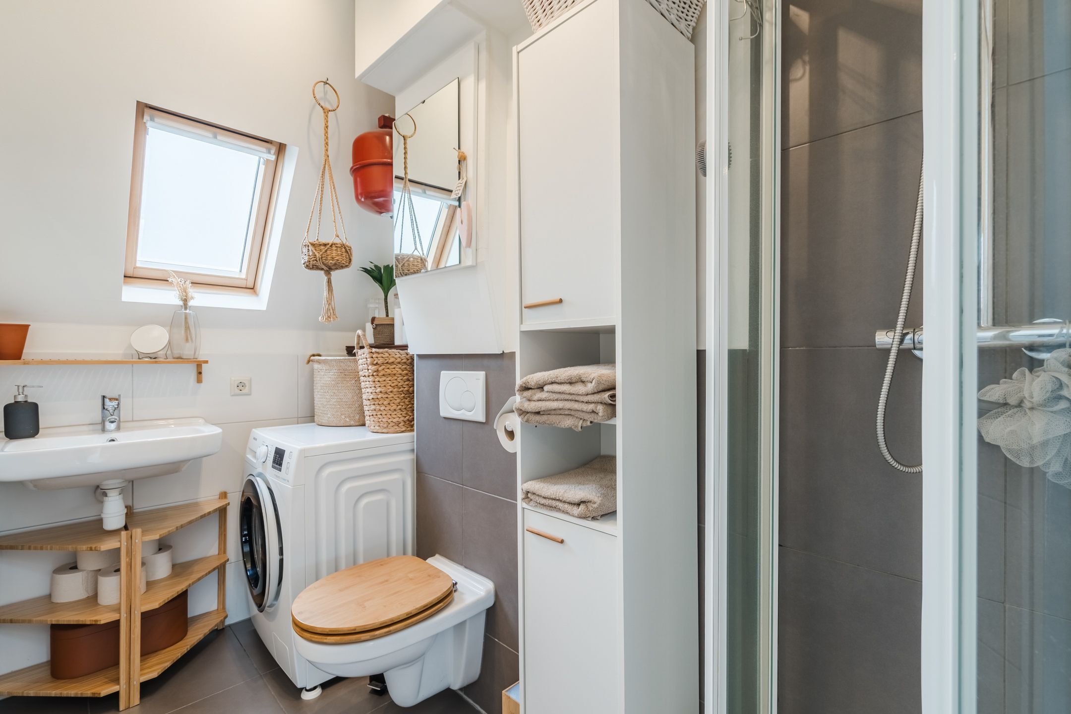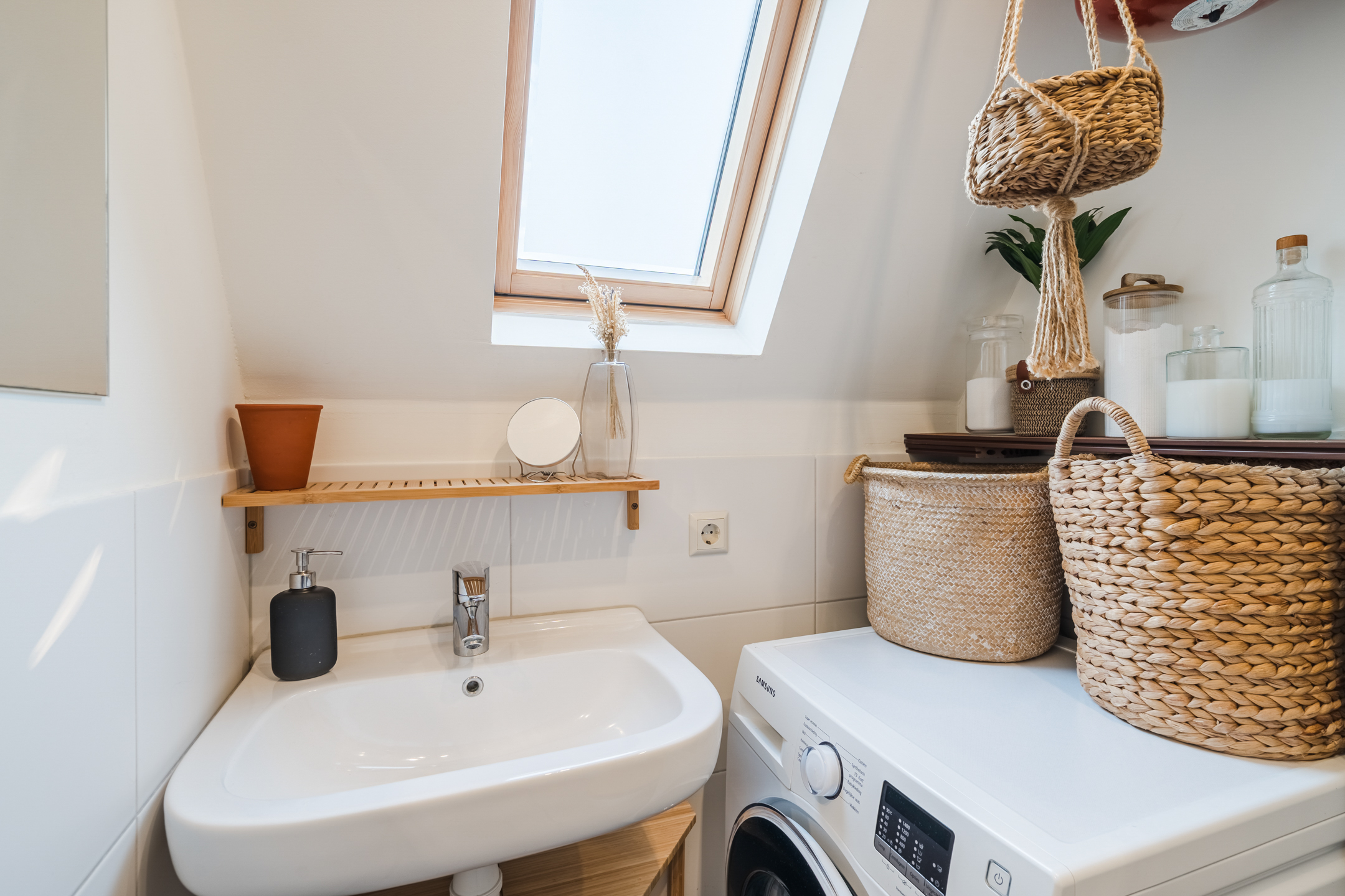 The bathroom (approx. 2.77 x 1.38 m) is fully equipped with a shower cabin, a washbasin, and a wall-mounted toilet. Here you will also find the boiler and washing machine connection. A window ensures natural light and ventilation.