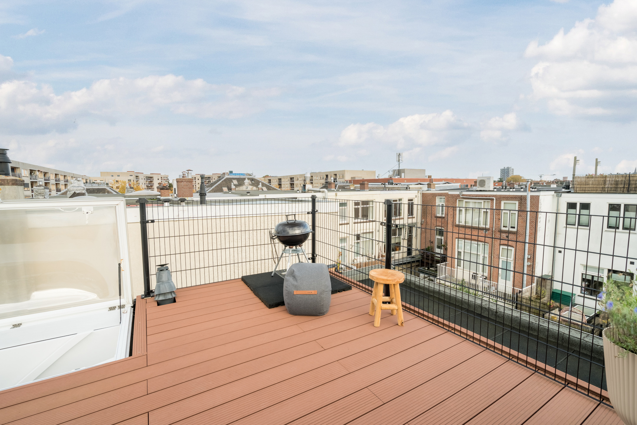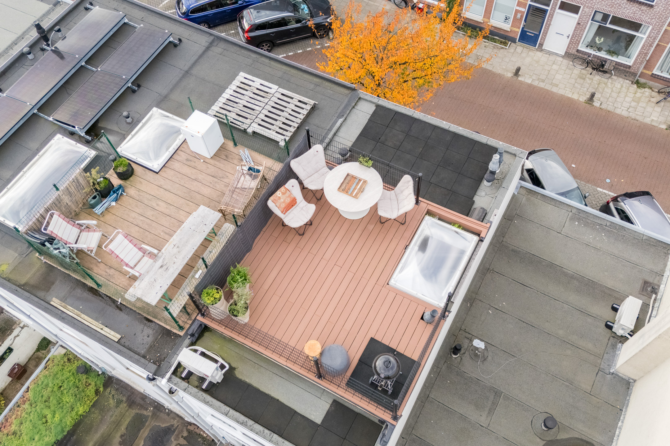 De woning beschikt over een prachtig en vooral zonnig dakterras (ca. 4.09 x 4.05m) met een écht ‘Utregs’ uitzicht. Vanaf hier kijk je onder andere uit op de iconische Dom! Het dakterras is aangelegd met vergunning, bereikbaar via een vaste trap en afgewerkt met houten vlonders en stevig hekwerk.