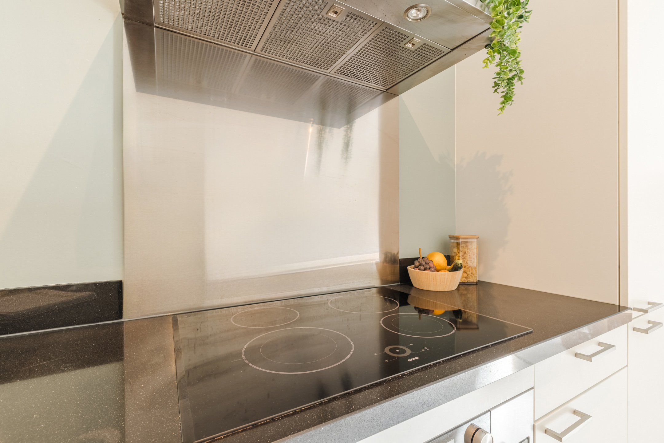 De keuken beschikt over een 4-pits inductiekookplaat, een rvs-afzuigkap, vaatwasser, koelkast, vriezer en veel opbergruimte mede door de bovenkasten. De witte strakke fronten in combinatie met het donkere composiet blad met RVS grepen vormt een moderne en stijlvolle basis voor ieder interieur. Direct naast de keuken bevindt zich een inpandige berging, hier vind je de technische installatie met tevens voldoende opbergruimte voor je voorraad, stofzuiger etc.