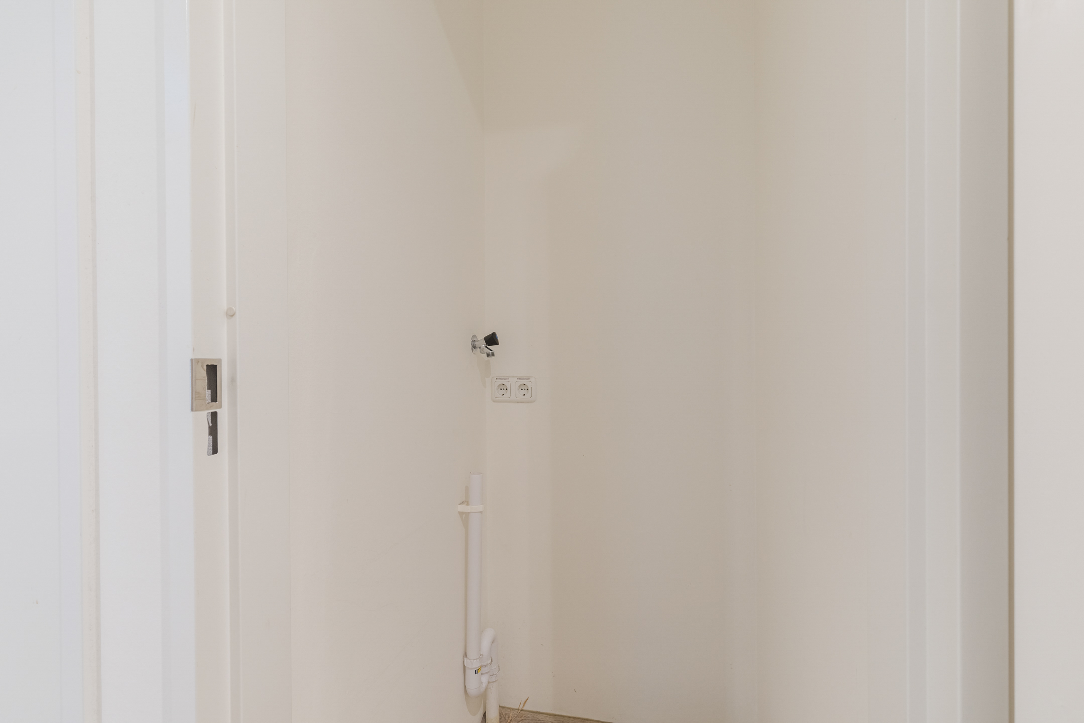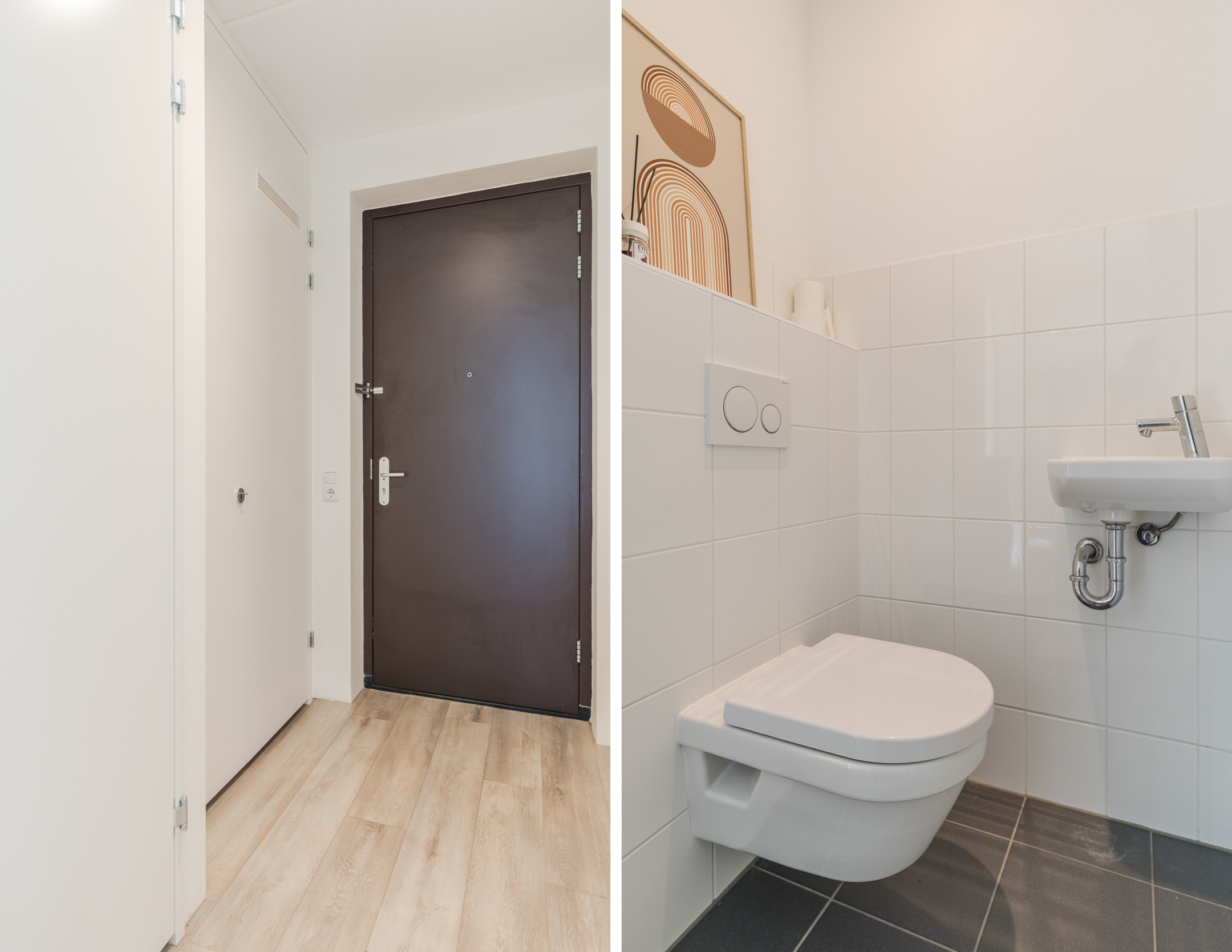 Je stapt binnen in de ruime hal. Hier bevinden zich de meterkast en de separate toiletruimte v.v. een hangend toilet en fontein, welke is uitgevoerd in neutrale betegeling. Vanuit de hal is eveneens de slaapkamer, een separate wasruimte, de lichte woonkamer en de badkamer te bereiken.