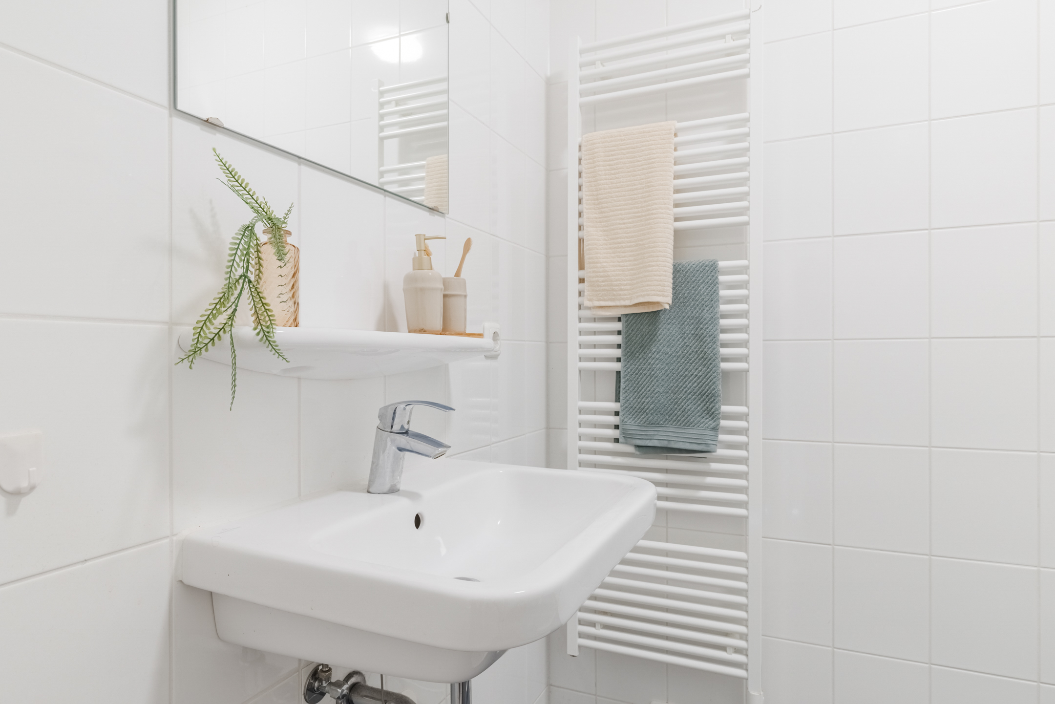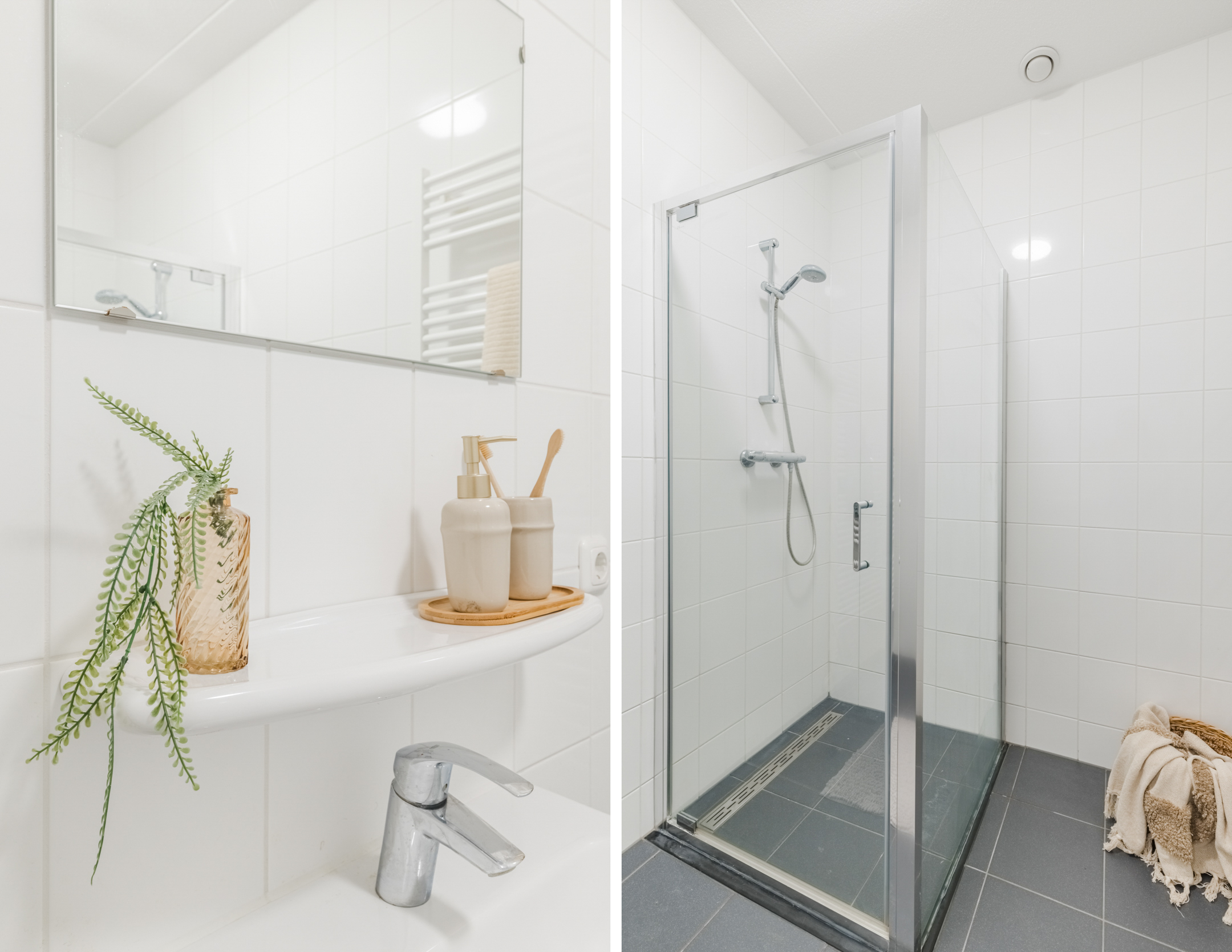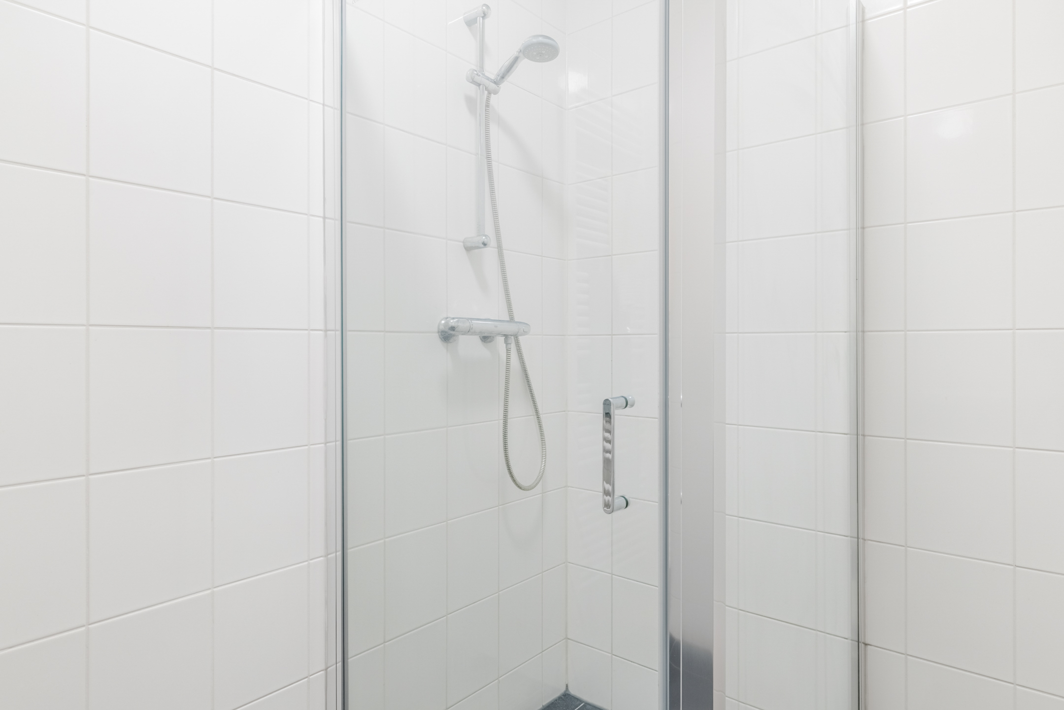 De inpandige badkamer (ca. 2.29 x 1.73 m) is praktisch ingericht en voorzien van een ruime douche, een wastafel, een handdoek radiator en voldoende ruimte om een kast te plaatsen voor de nodige verzorgingsproducten en handdoeken. De badkamer is uitgevoerd in een met een witte wandtegel en een donker antracieten vloertegel.