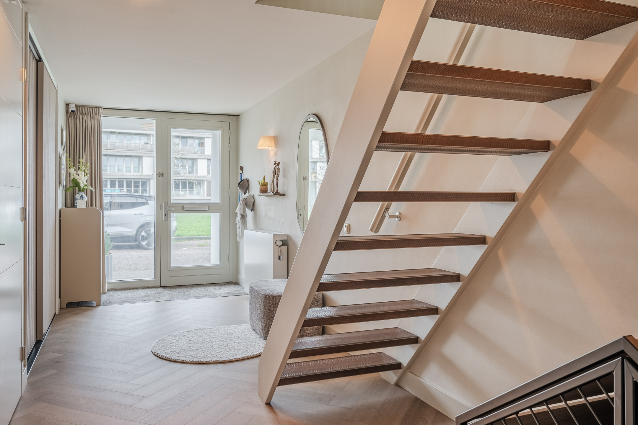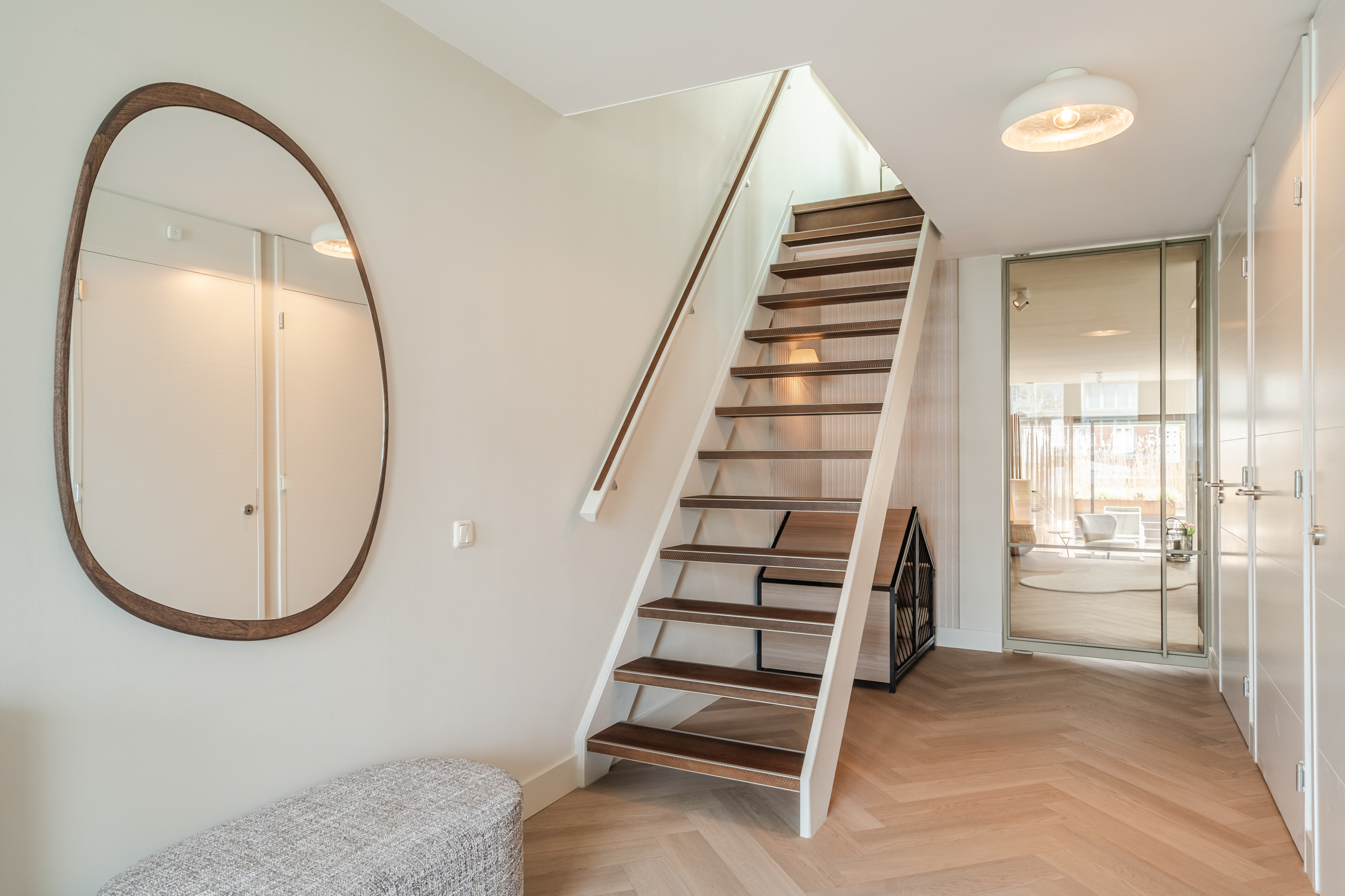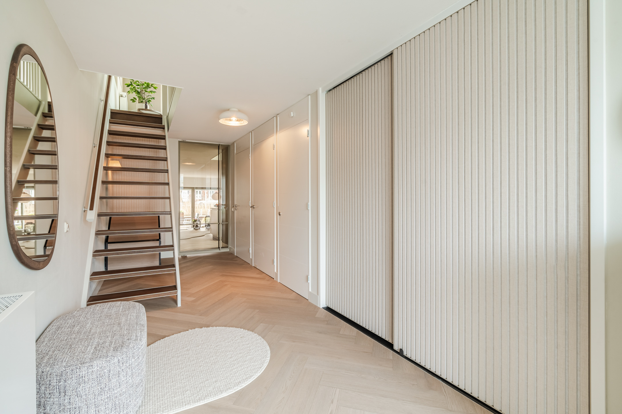 De afwerking is hoogwaardig en strak, met glad stucwerk en een extra matte PVC visgraatvloer over de gehele begane grond. De woonkamer betreed je via een op maat gemaakte stalen taatsdeur, die direct een gevoel van luxe en exclusiviteit toevoegt.