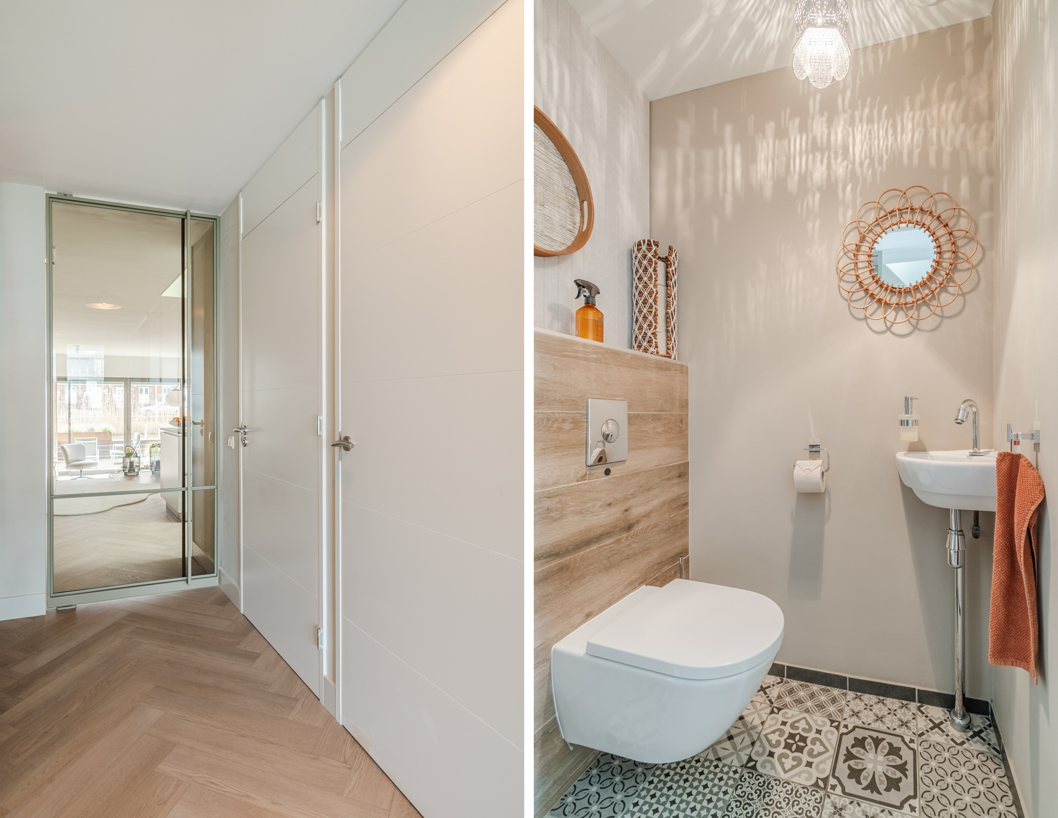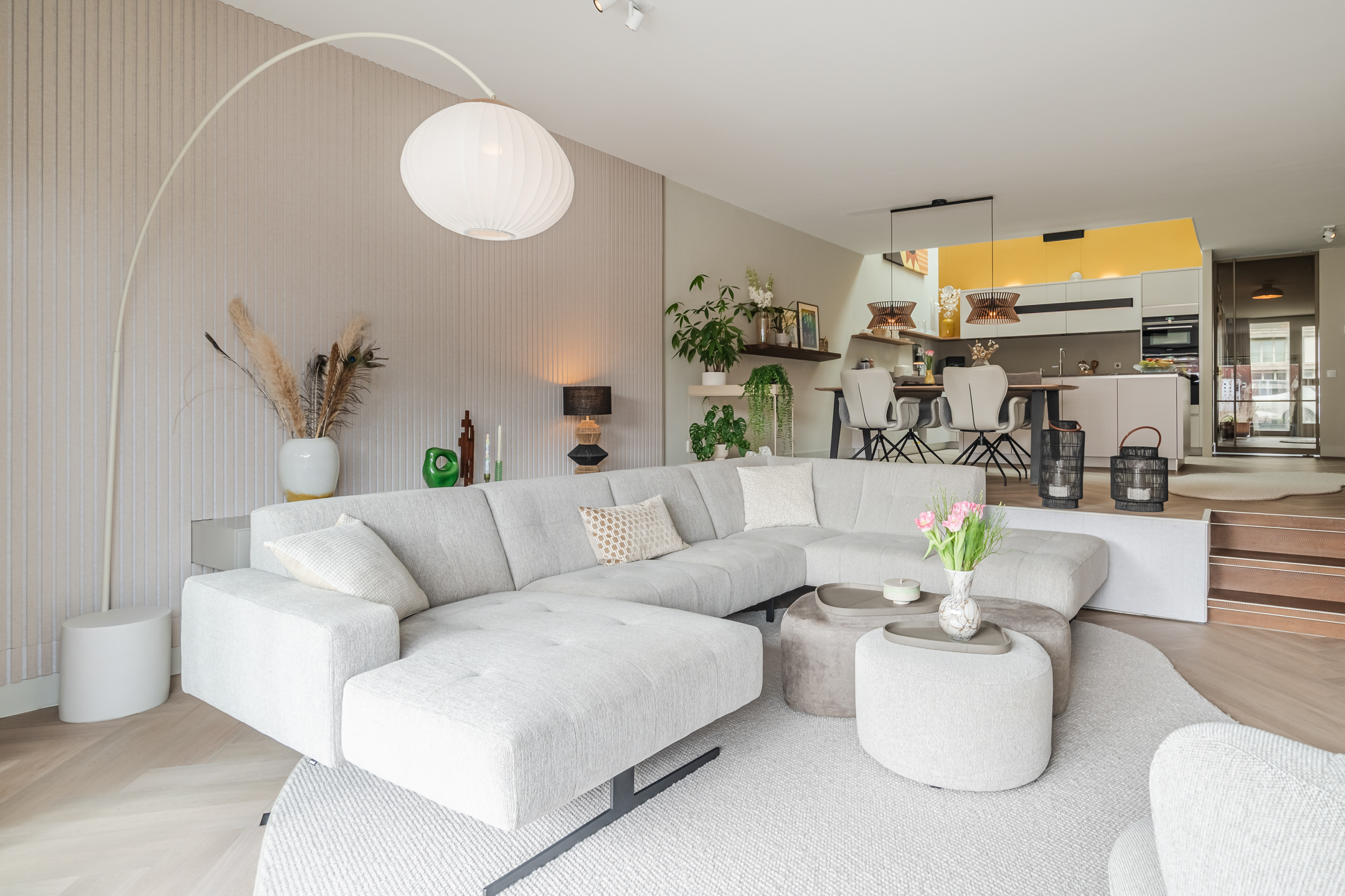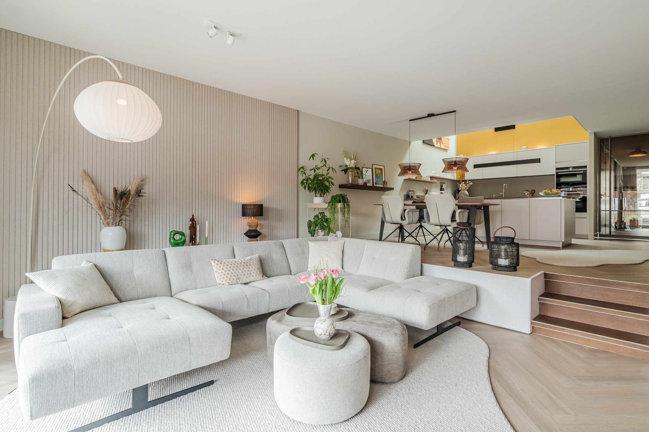 De afwerking is hoogwaardig en strak, met glad stucwerk en een extra matte PVC visgraatvloer over de gehele begane grond. De woonkamer betreed je via een op maat gemaakte stalen taatsdeur, die direct een gevoel van luxe en exclusiviteit toevoegt.