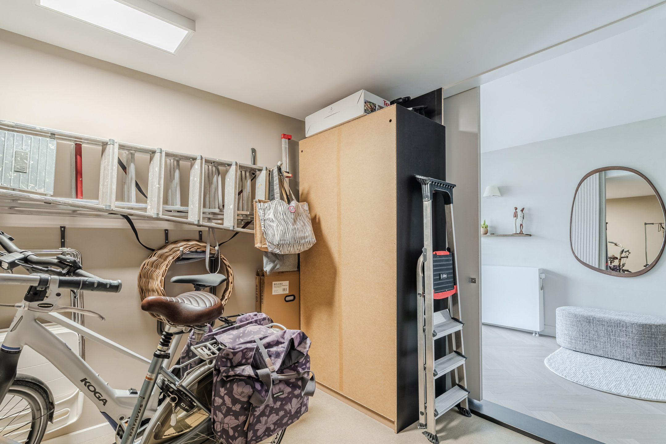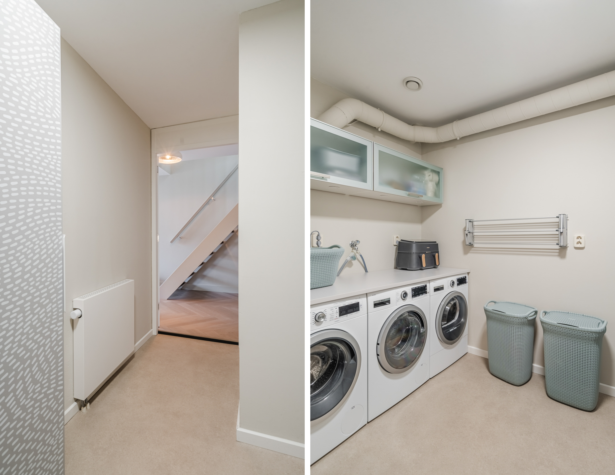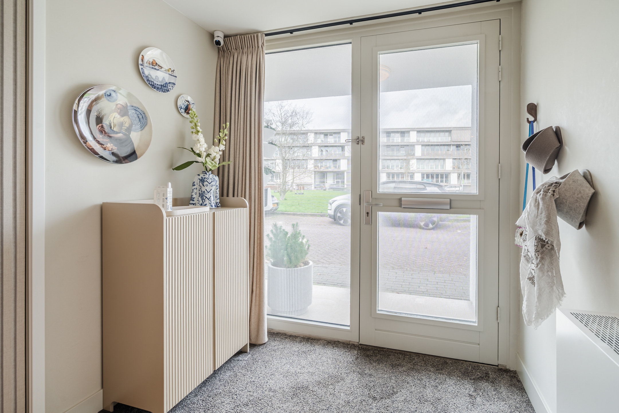 Via de entree kom je in de ruime hal met garderobe, een modern toilet met fontein en toegang tot de inpandige berging (oorspronkelijk garage, deels buitenom bereikbaar), de wasruimte, de trap naar de verdieping en de woonkamer.