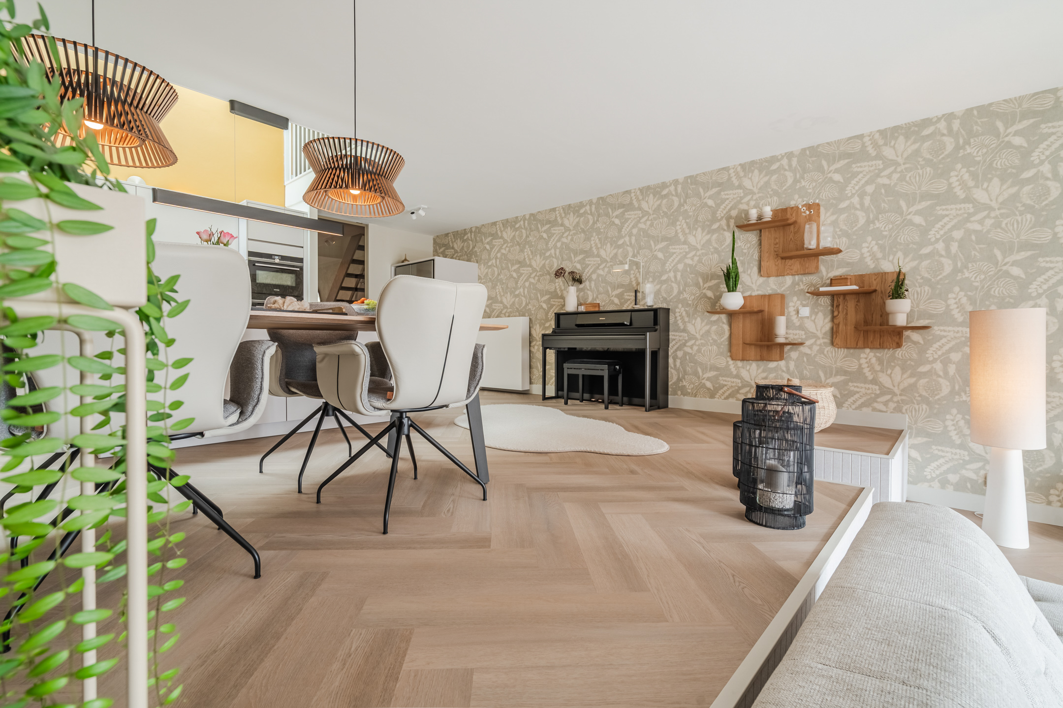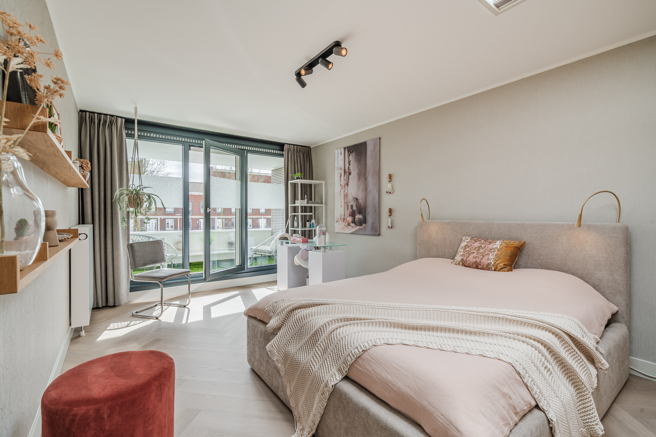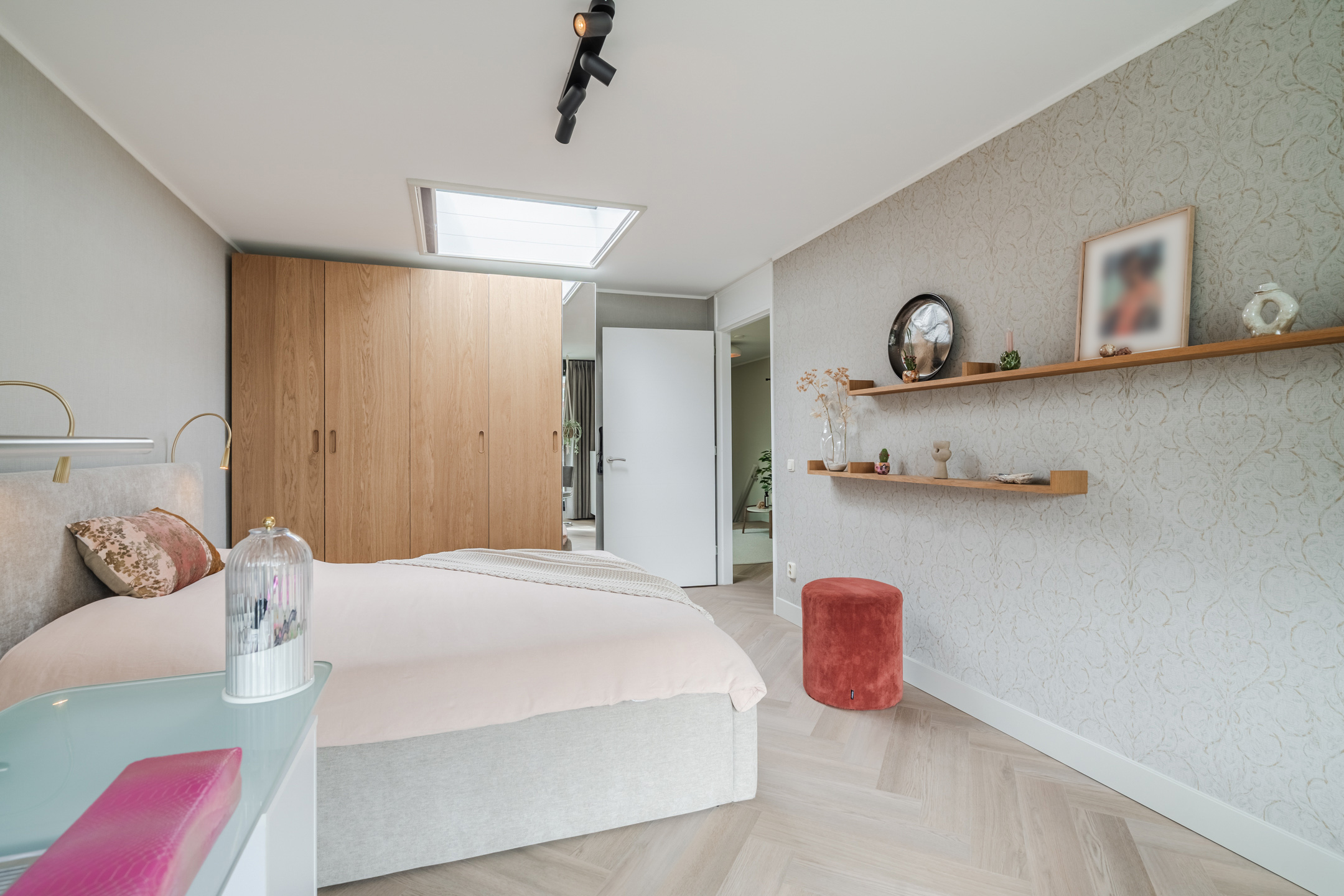 – Hoogwaardige afwerking: extra matte Therdex PVC visgraatvloer (2025), strak stucwerk, akoestische panelen (GewoonGers);