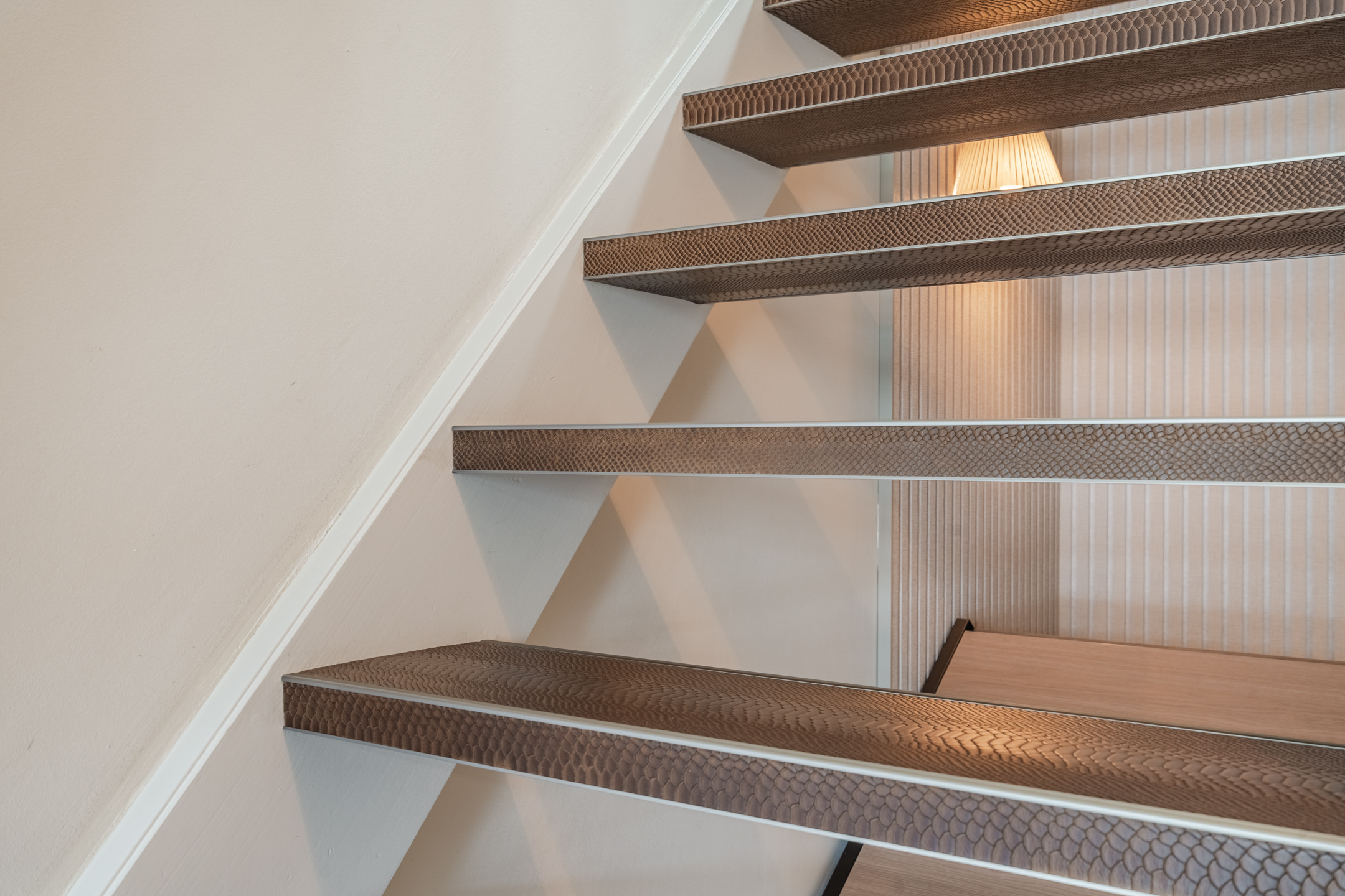 De trap is luxe bekleed met leder in slangenprint en de gehele verdieping is eveneens voorzien van een extra matte PVC visgraatvloer en strak stucwerk.