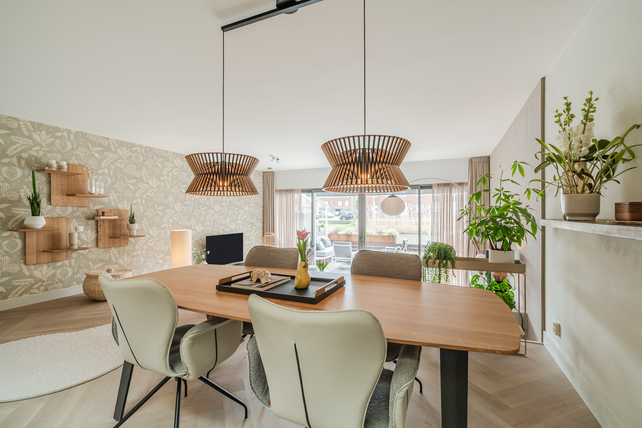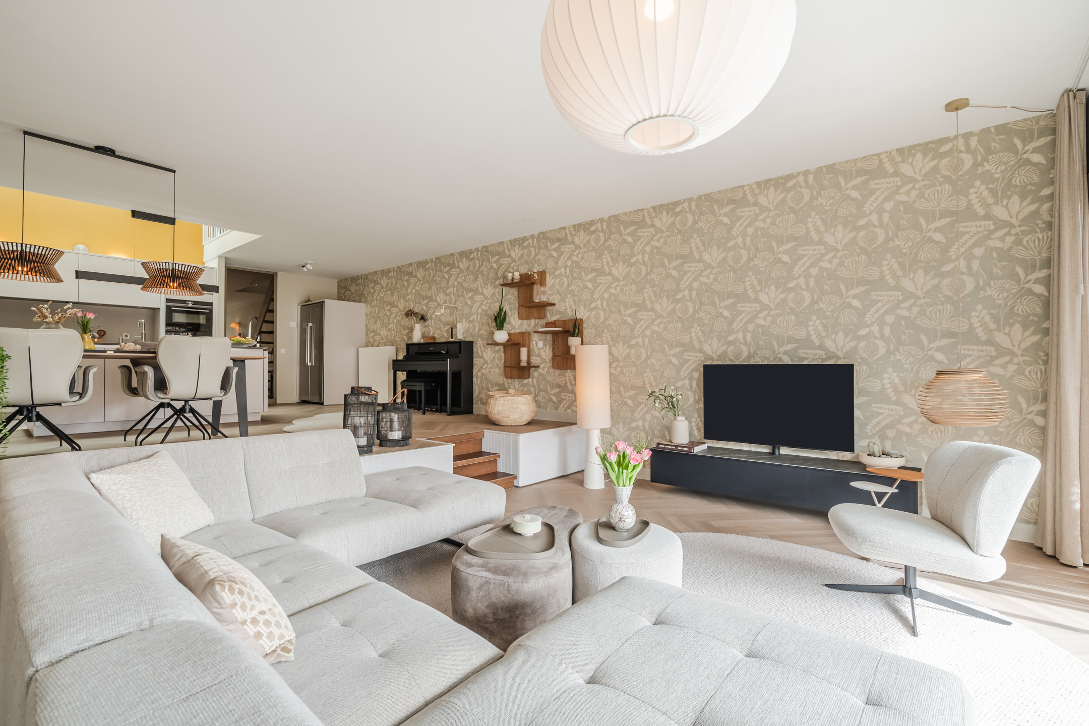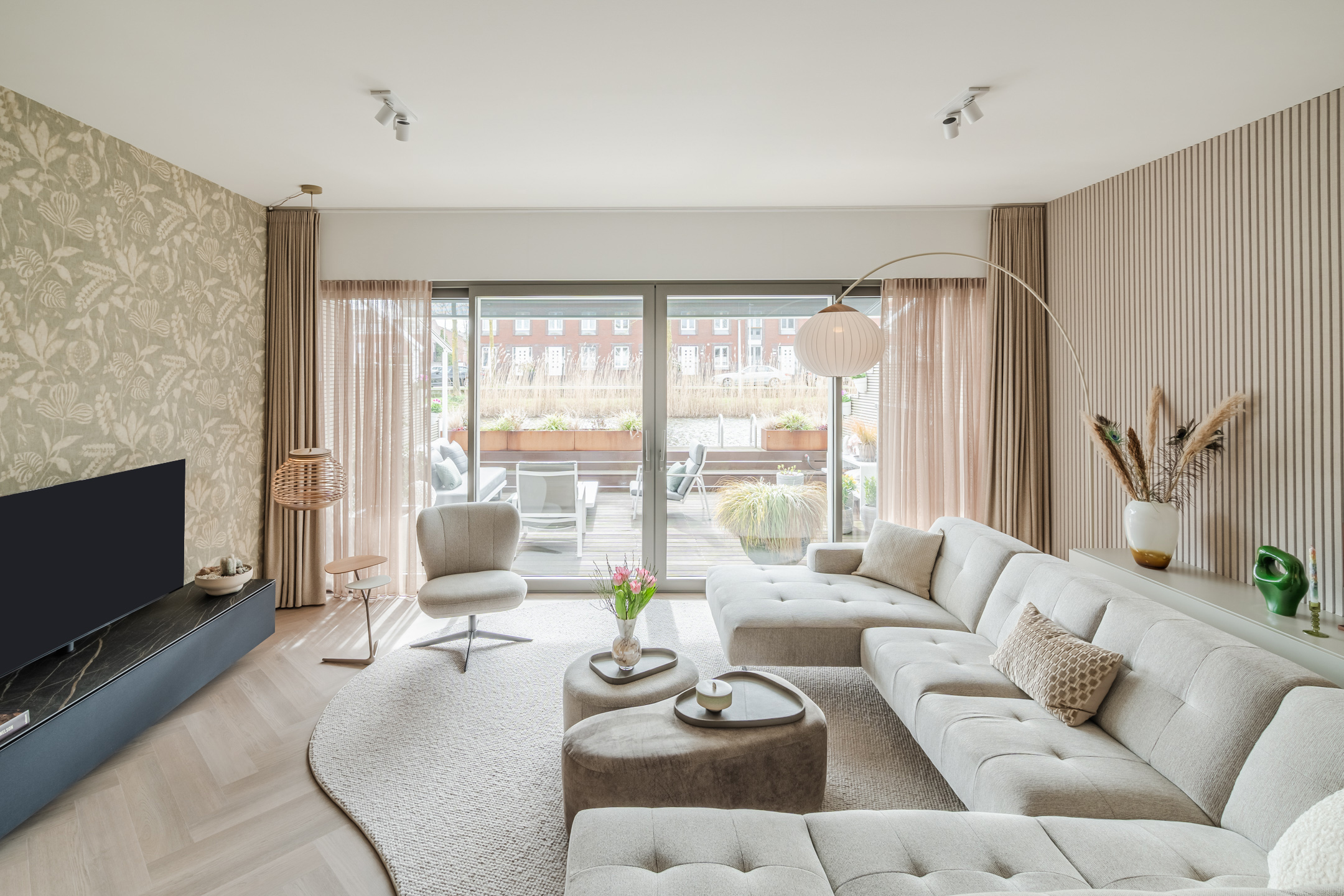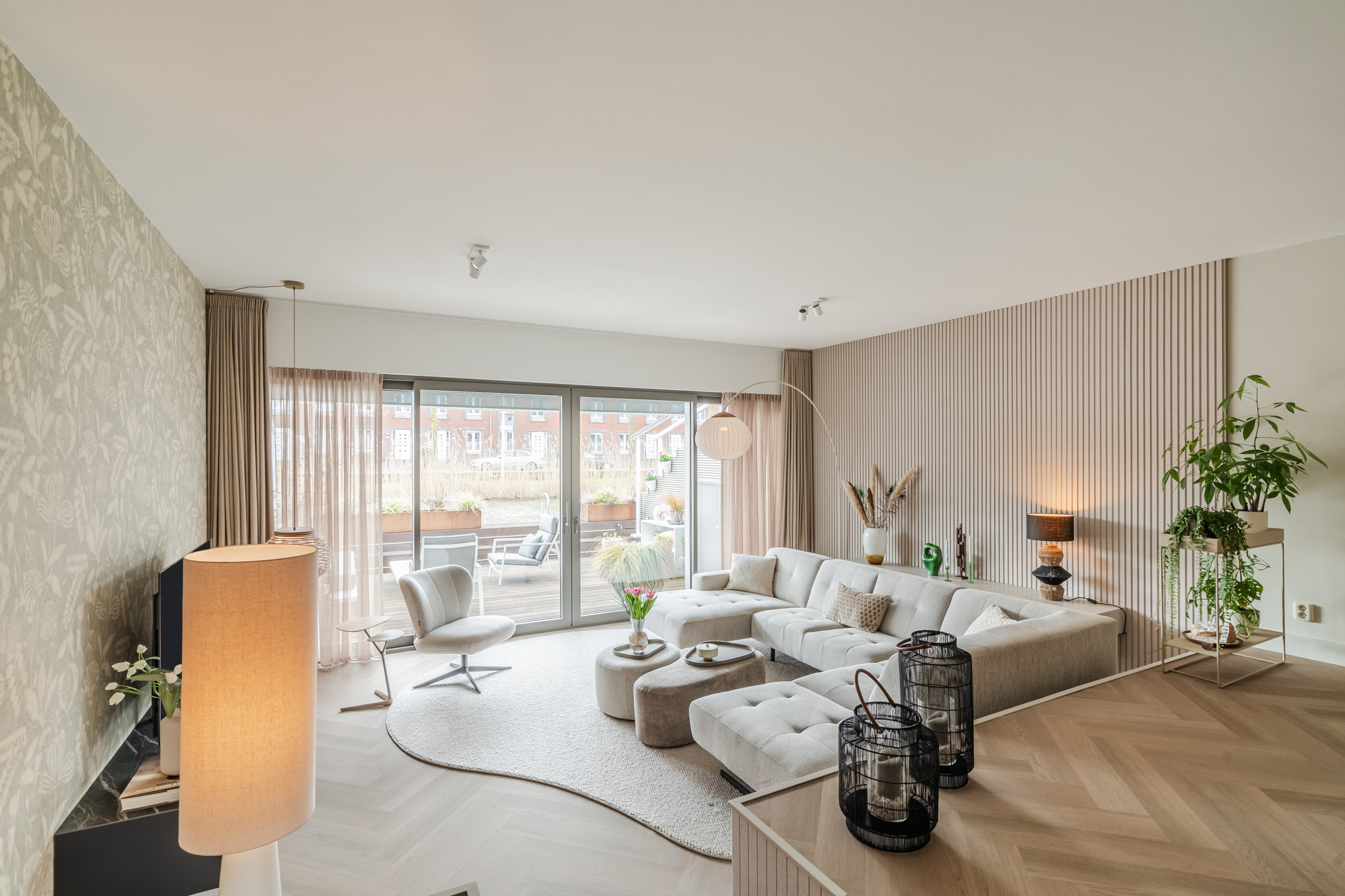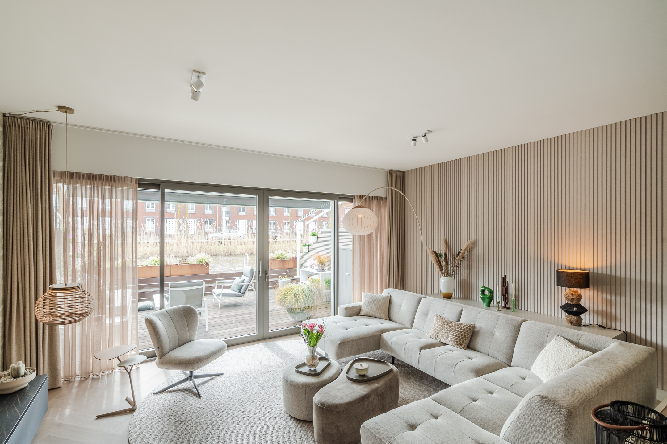 Aan de achterzijde bevindt zich de sfeervolle woonkamer, waar de verlaagde vloer een intiem en beschut zitgedeelte creëert. Dit niveauverschil zorgt voor een elegante, natuurlijke scheiding tussen de living en de hoger gelegen woonkeuken. De grote raampartijen van de schuifpui brengen overvloedig daglicht binnen en verbinden de ruimte direct met het terras aan het water. De akoestische wandpanelen en de elektrische vloerverwarming in het zitgedeelte versterken het comfort en de luxe uitstraling.