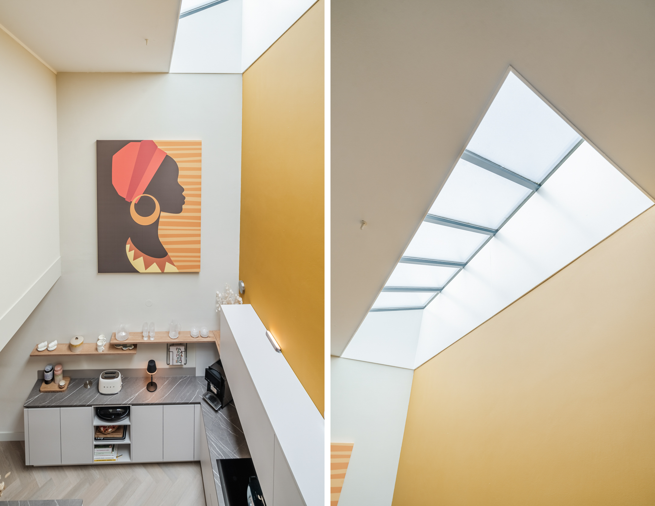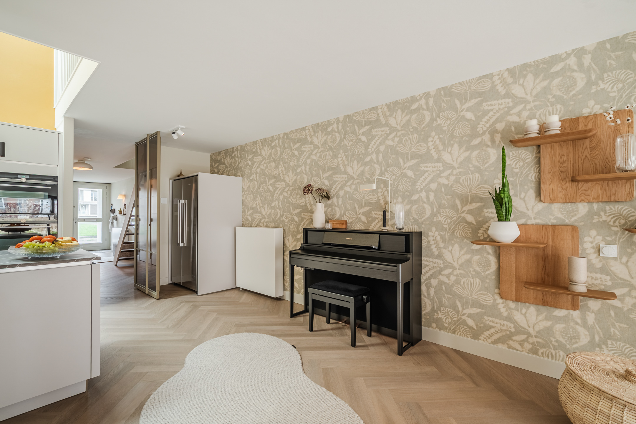 Binnen valt de woning op door de bijzondere niveauverschillen en zichtlijnen die het gevoel van ruimte versterken. De verlaagde woonkamer vormt een intieme, gezellige zitruimte, terwijl de hoger gelegen woonkeuken juist open en licht aanvoelt. De vide en lichtstraat zorgen voor een prachtige lichtinval en een luxe, loftachtige sfeer. De afwerking is van hoog niveau, met strak gestucte wanden en plafonds, een elegante extra matte PVC visgraatvloer en stijlvolle akoestische wandpanelen.