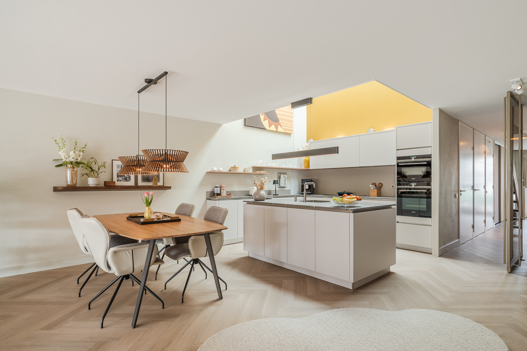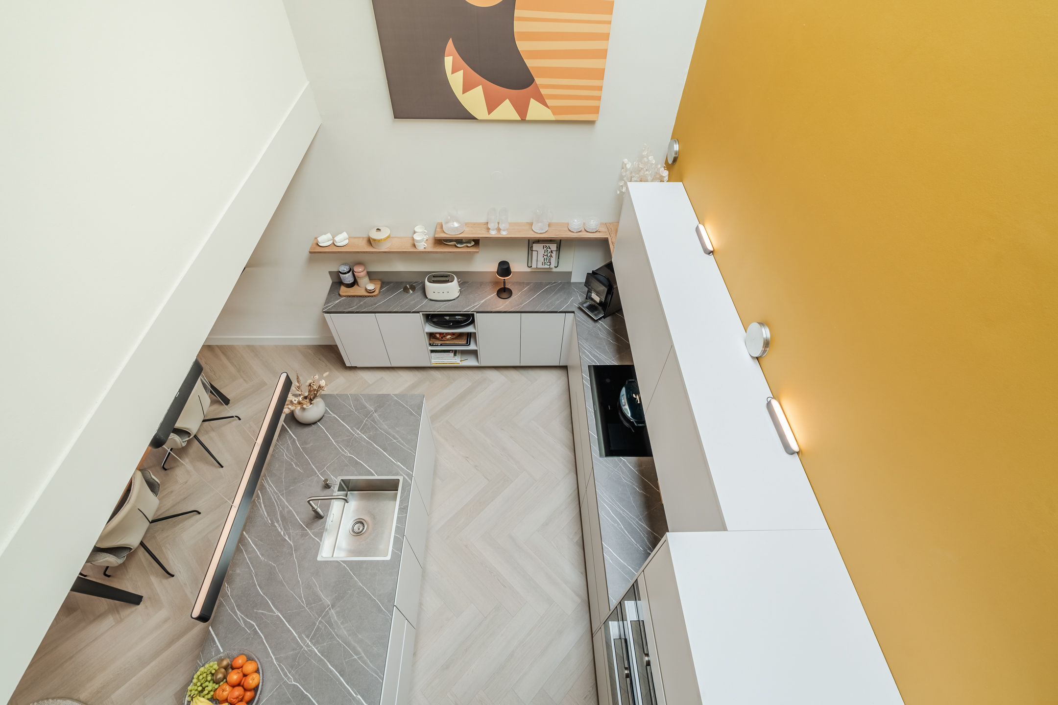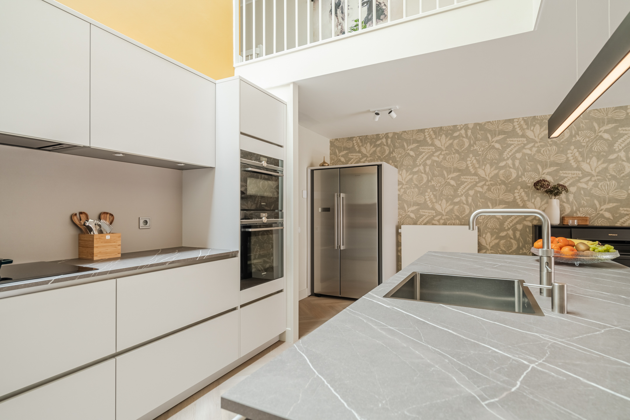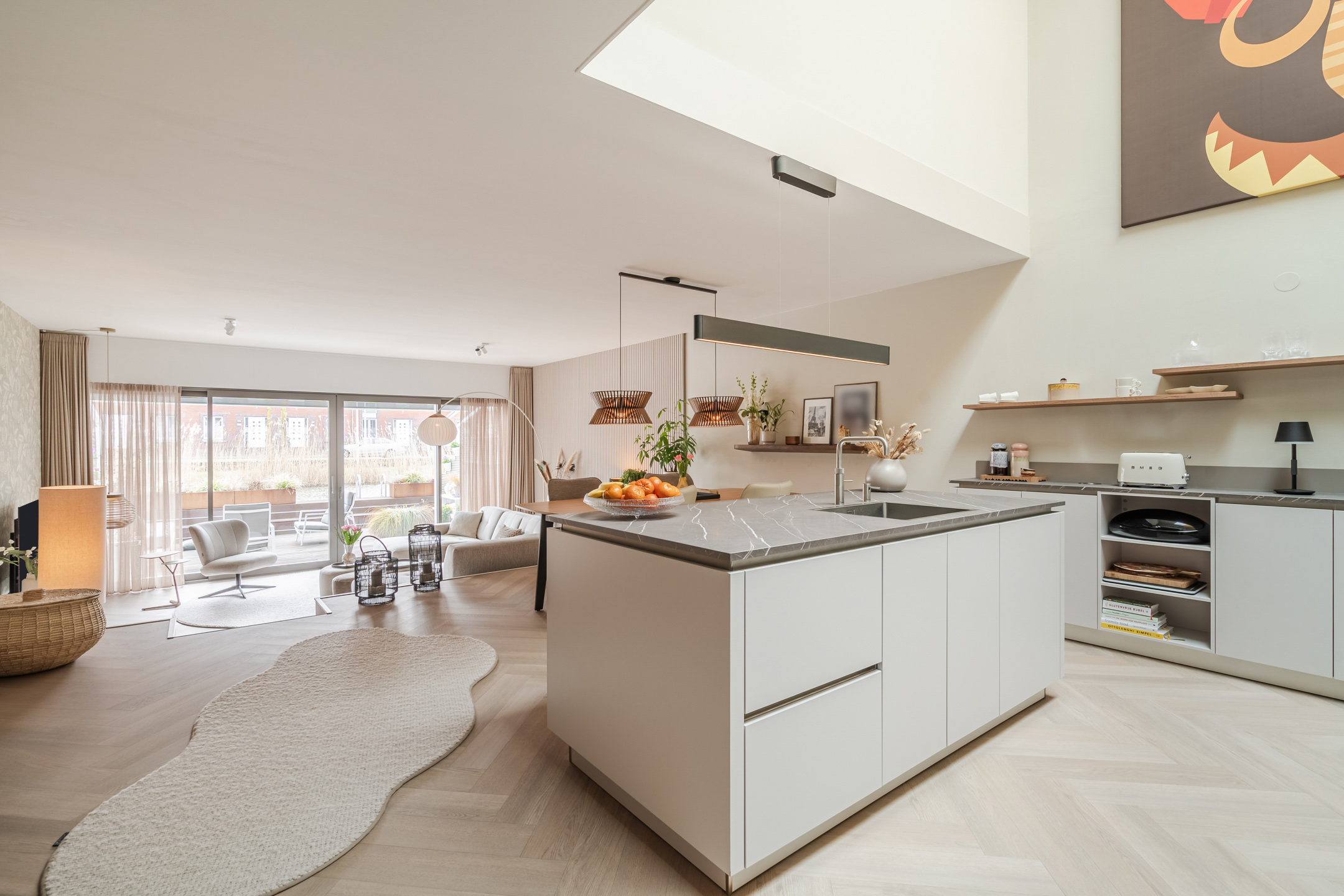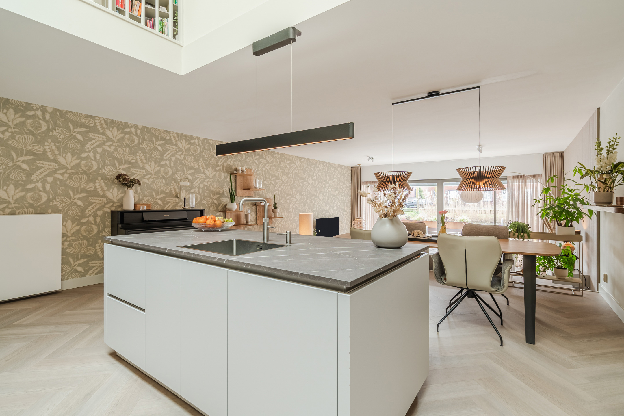 Centraal in de woning ligt de royale open keuken — het echte hart van de woning. De vide boven het spoeleiland en de grote lichtstraat maken deze ruimte uitzonderlijk licht en geven een loftachtige, open sfeer.