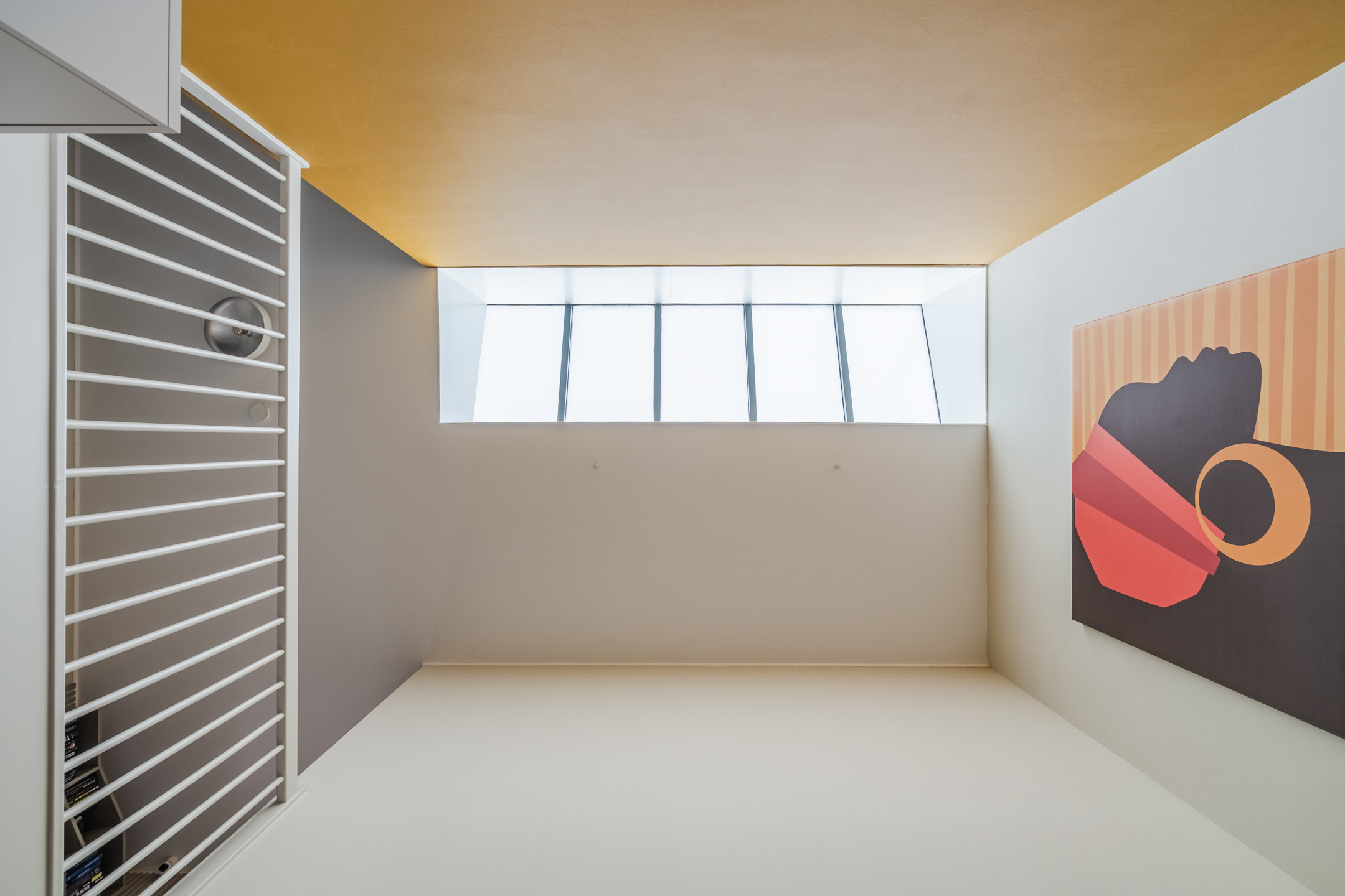 Inside, the home stands out for its unique level differences and sightlines that enhance the sense of space. The sunken living room creates an intimate and cozy seating area, while the elevated kitchen feels bright and open. The mezzanine and skylight provide beautiful natural light and contribute to a luxurious, loft-like atmosphere. The finishing is of a high standard, featuring smooth plastered walls and ceilings, an elegant extra-matte herringbone PVC floor, and stylish acoustic wall panels.