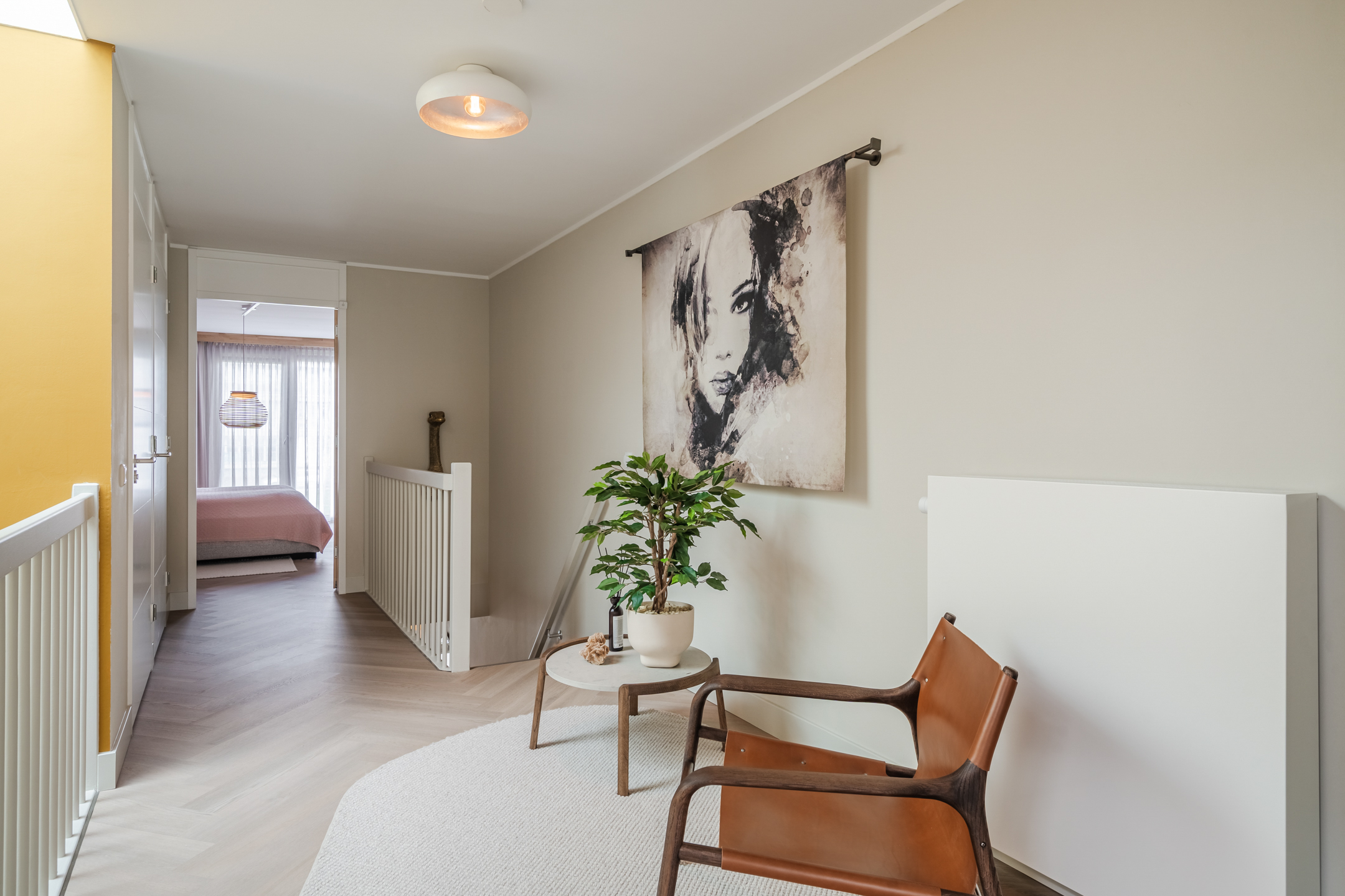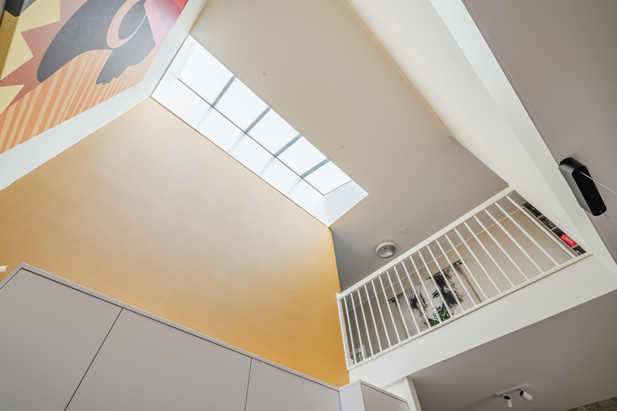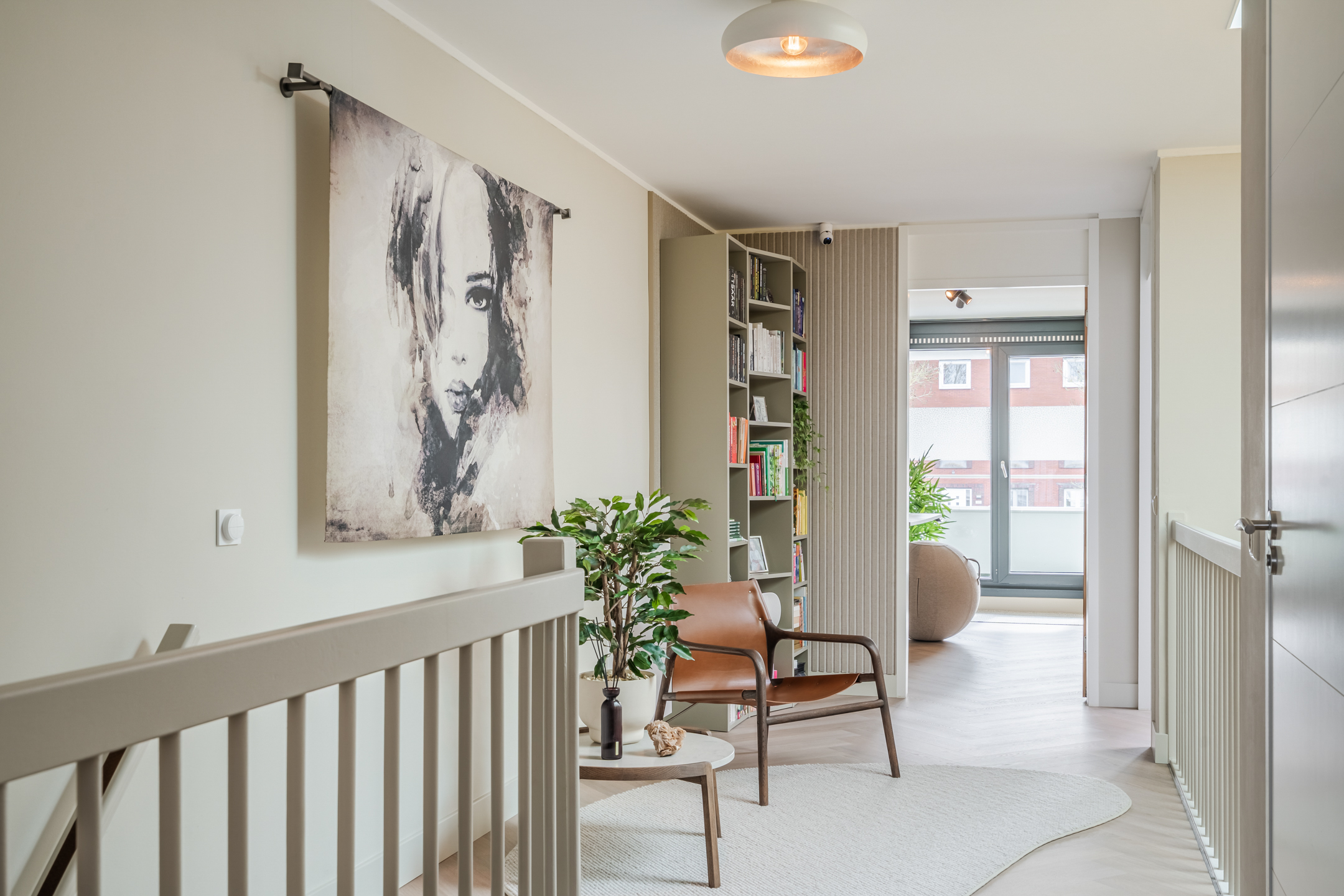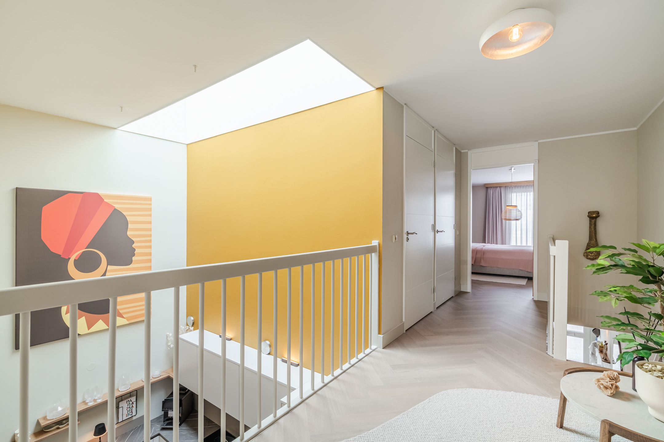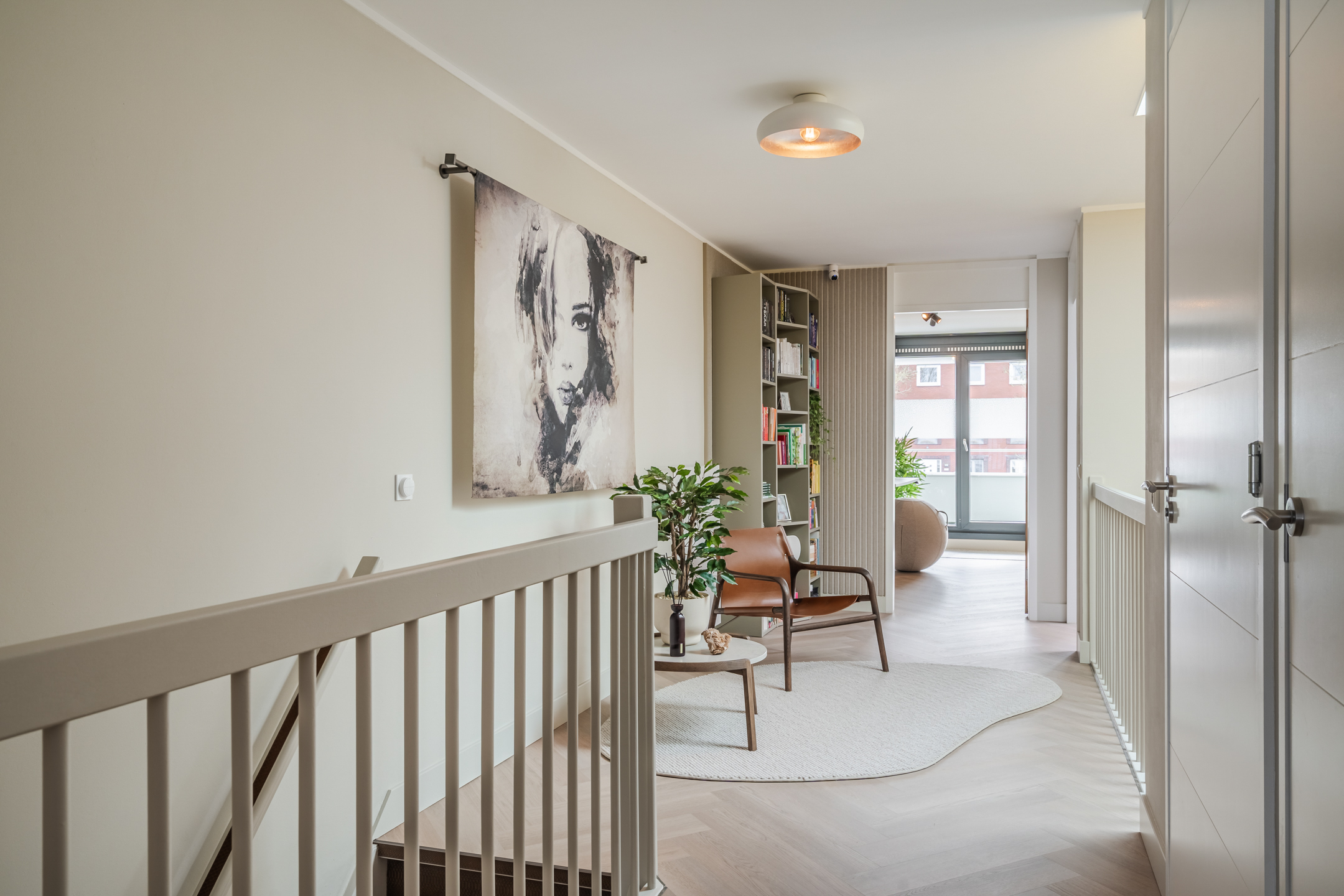 Vanaf de overloop kijk je via de vide prachtig uit over de woonkeuken beneden — een architectonisch detail dat het ruimtelijke karakter van de woning versterkt.