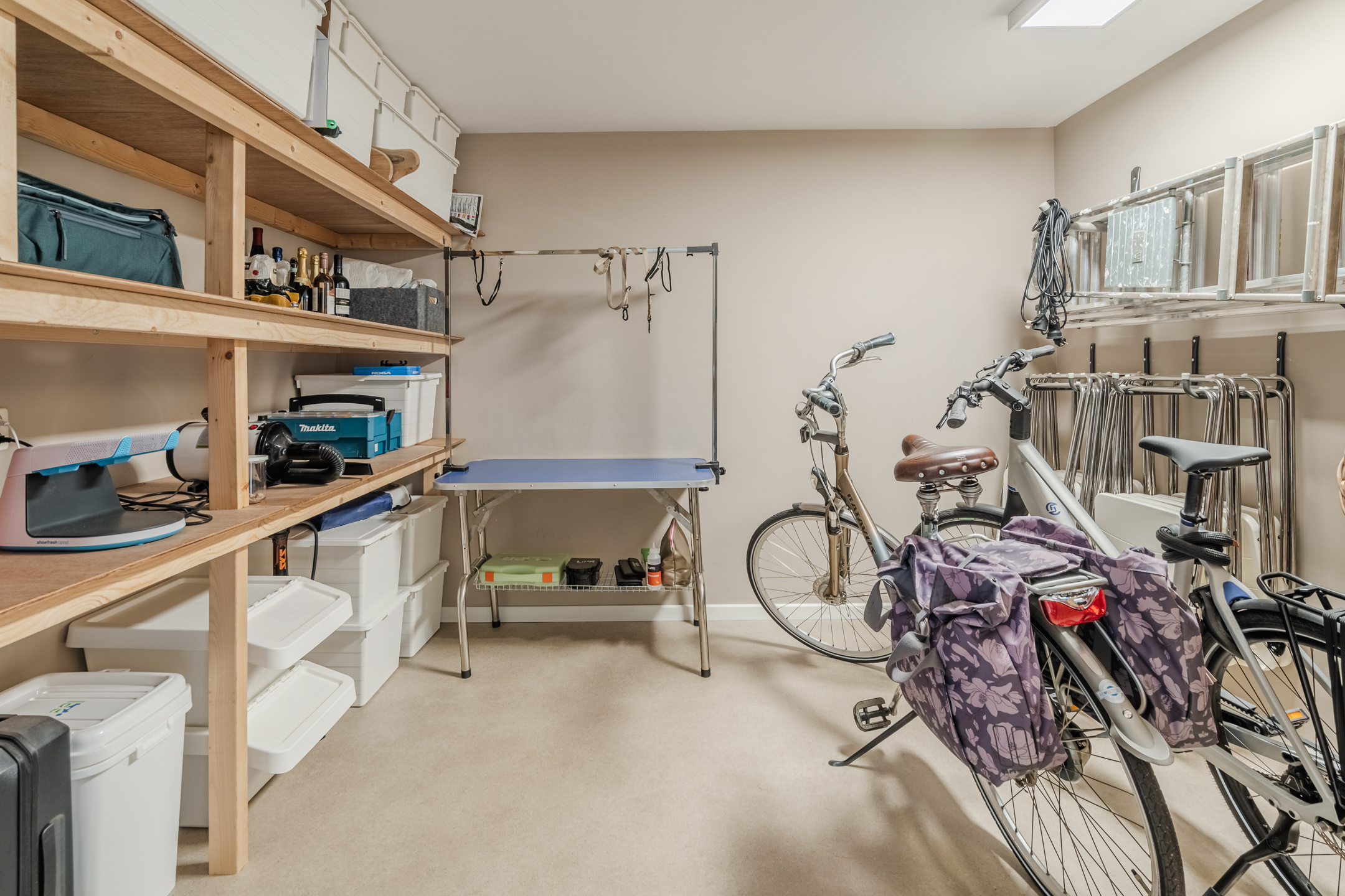 De keuken is uitgevoerd in een ruime hoekopstelling met spoeleiland, voorzien van greeploze fronten in de kleur ‘kashmir’ en een modern stootvast werkblad. Alle gewenste inbouwapparatuur is aanwezig: een 5 zones inductiekookplaat, stoomoven, combi oven/magnetron, separate koel /vriescombinatie, Quooker en een krachtige afzuigkap met afvoer naar buiten. De hoeveelheid werk- en bergruimte maakt deze keuken ideaal voor kookliefhebbers.