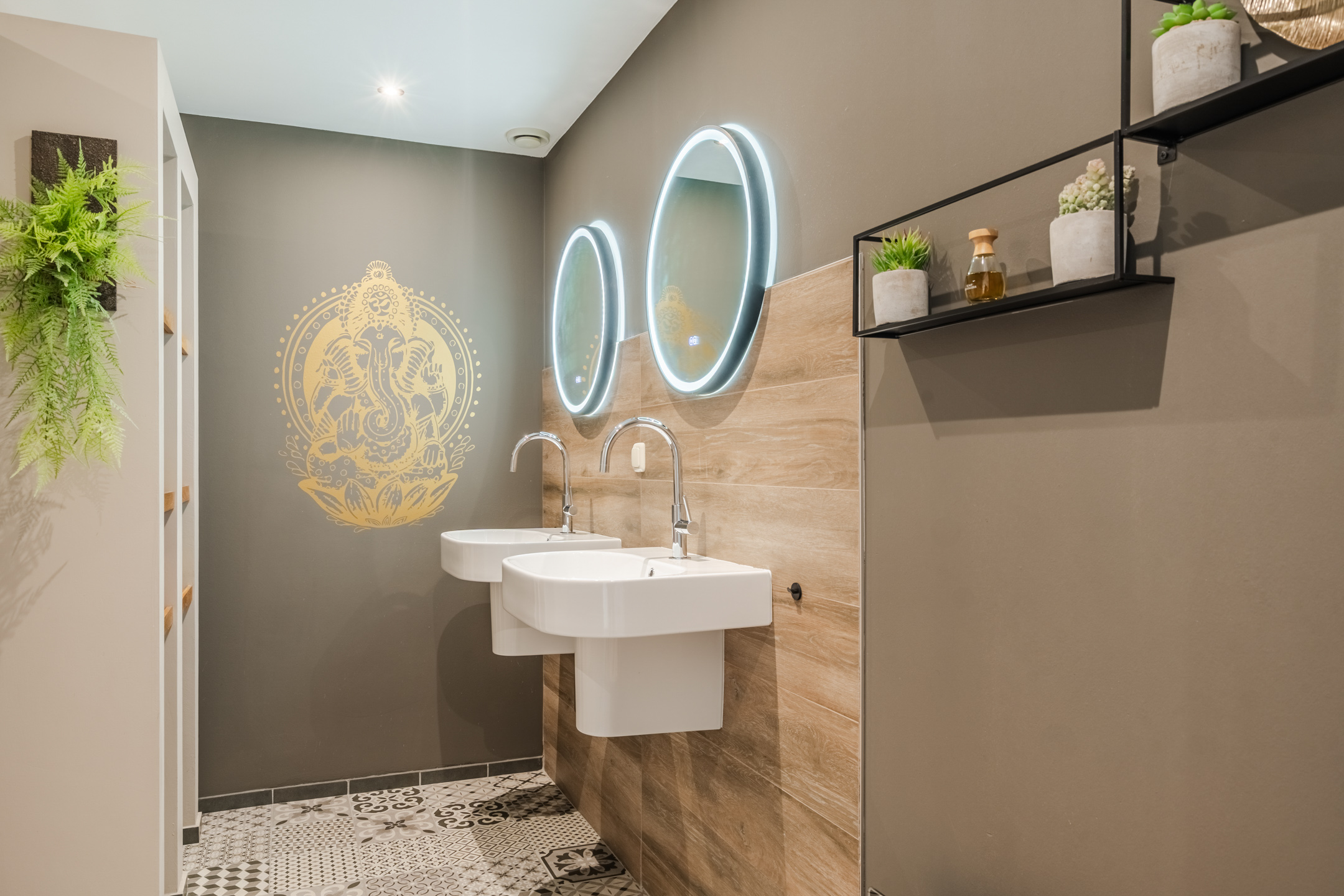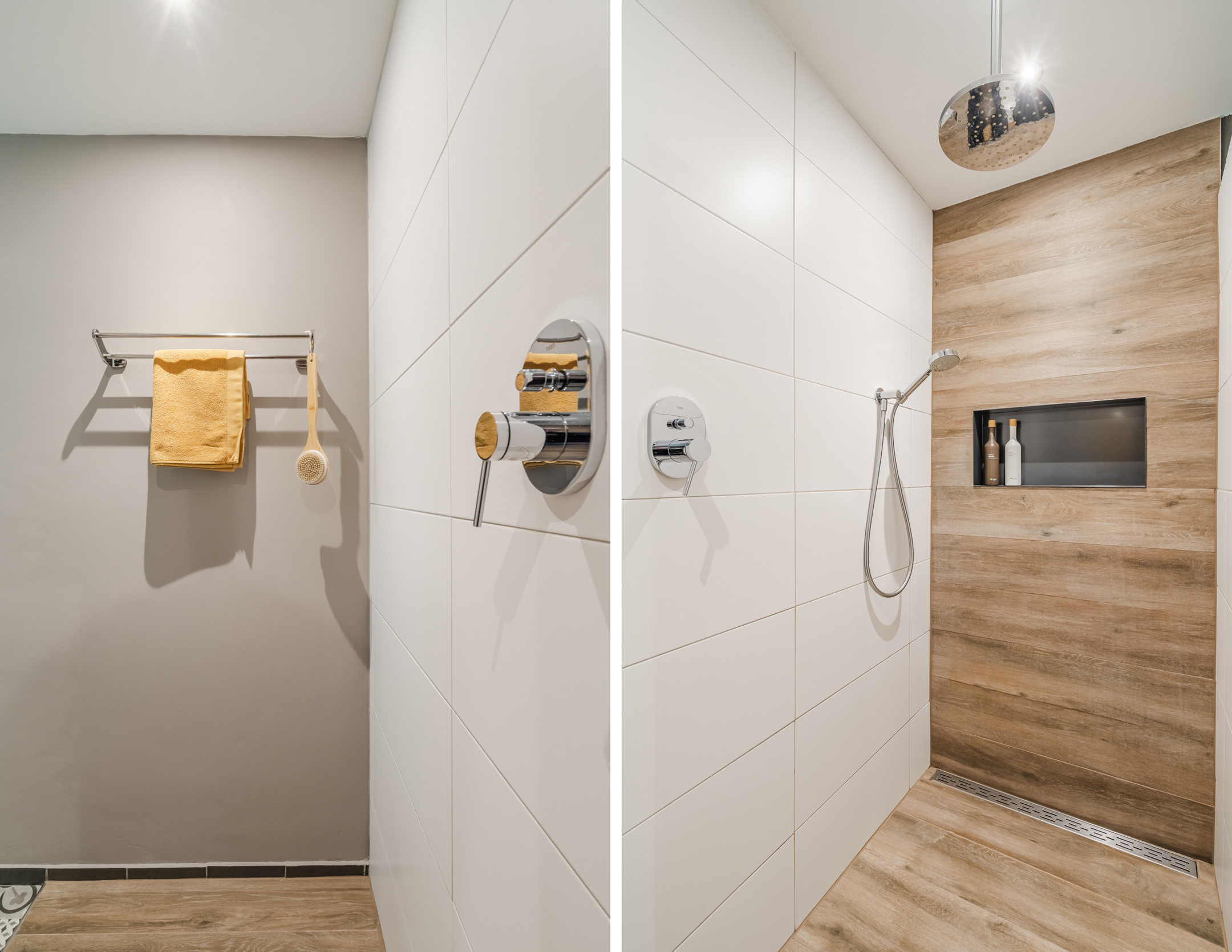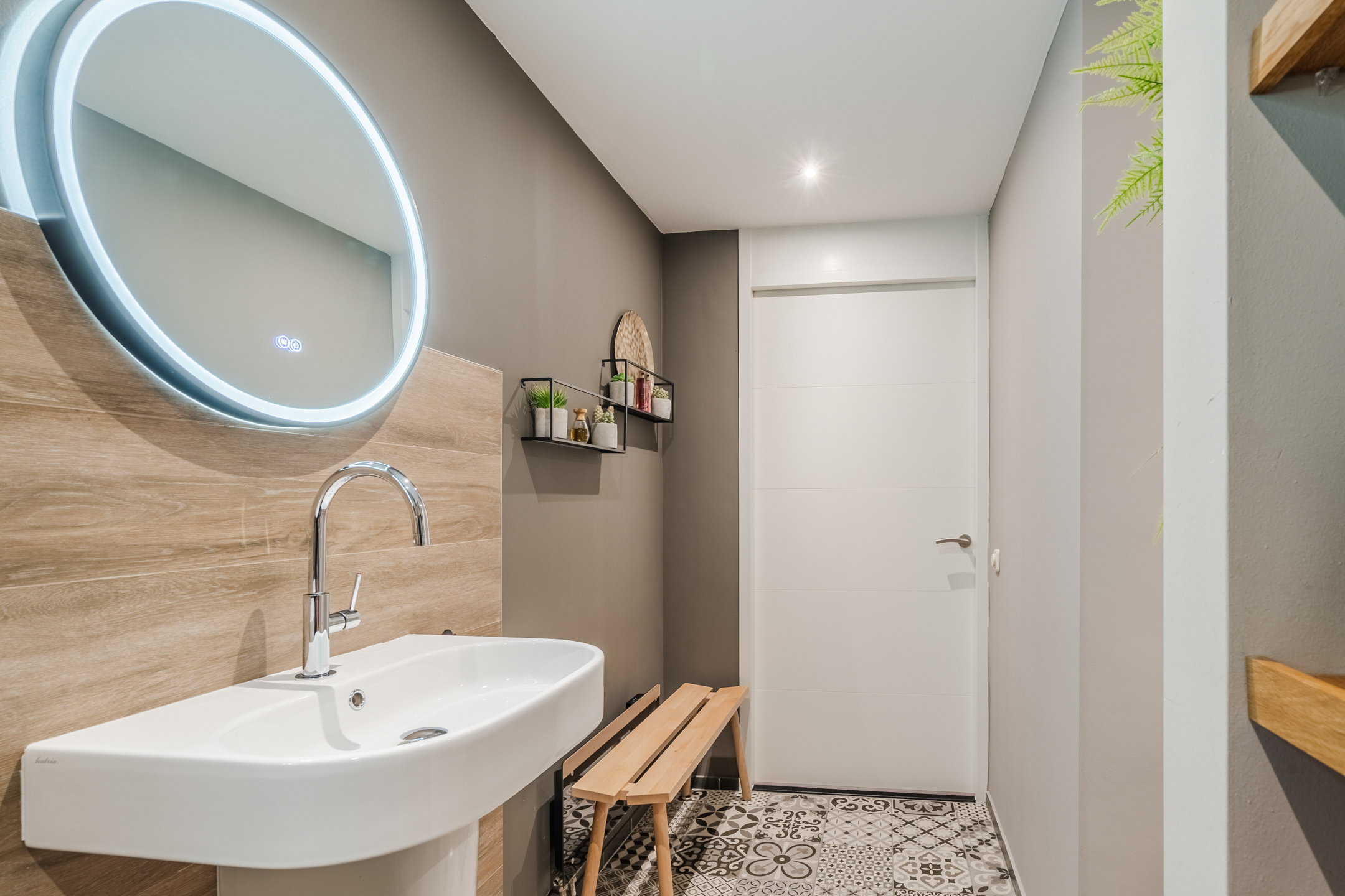 De stijlvolle badkamer (ca. 3,29 x 2,66) is afgewerkt met een combinatie van houtlook tegels, witte wandtegels en karaktervolle Portugese vloertegels. De ruimte beschikt over een royale inloopdouche, twee hangende wastafels, verwarmde spiegels met verlichting, mechanische ventilatie, een elektrisch verwarmingspaneel en een praktische inbouwkast voor handdoeken.